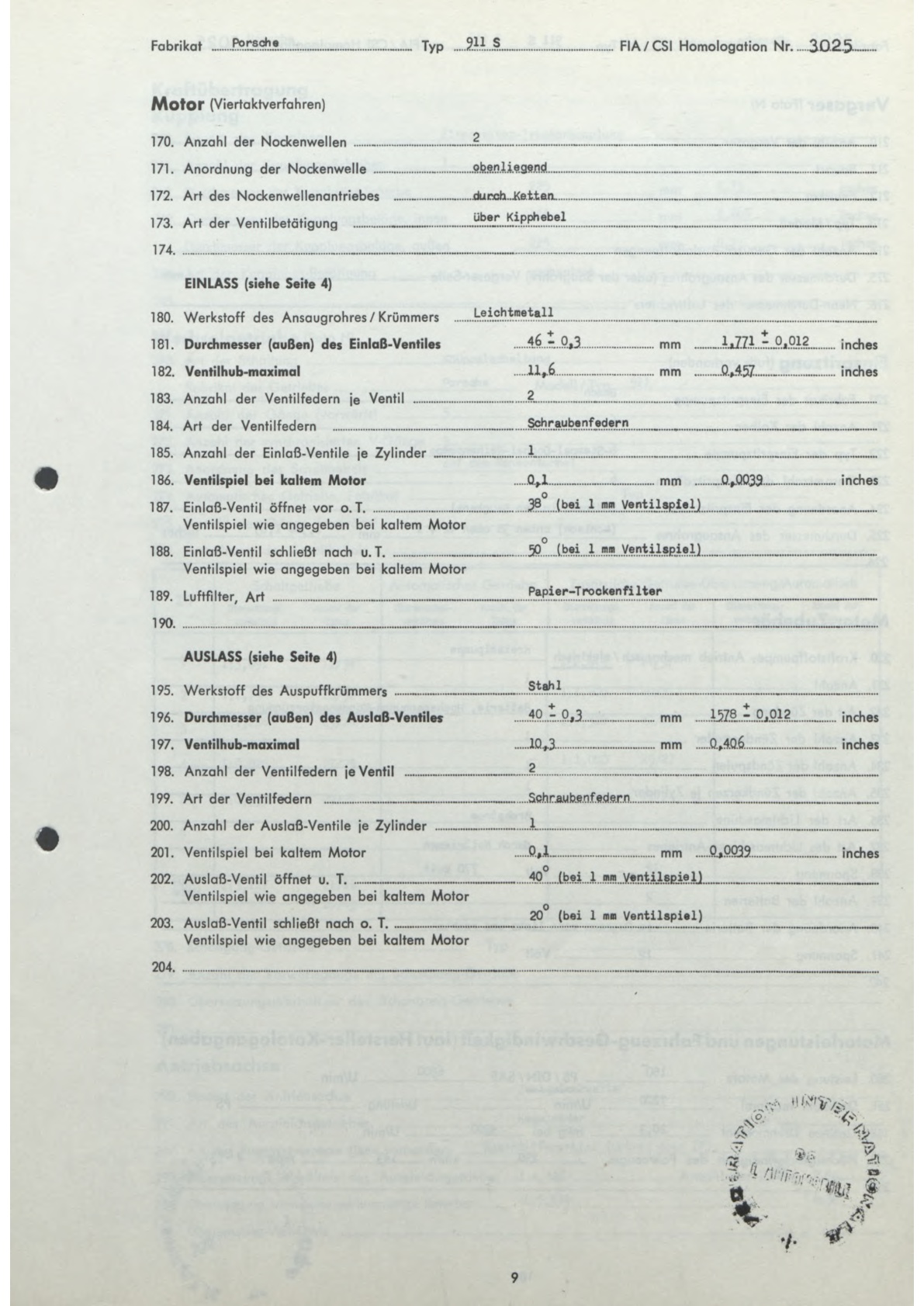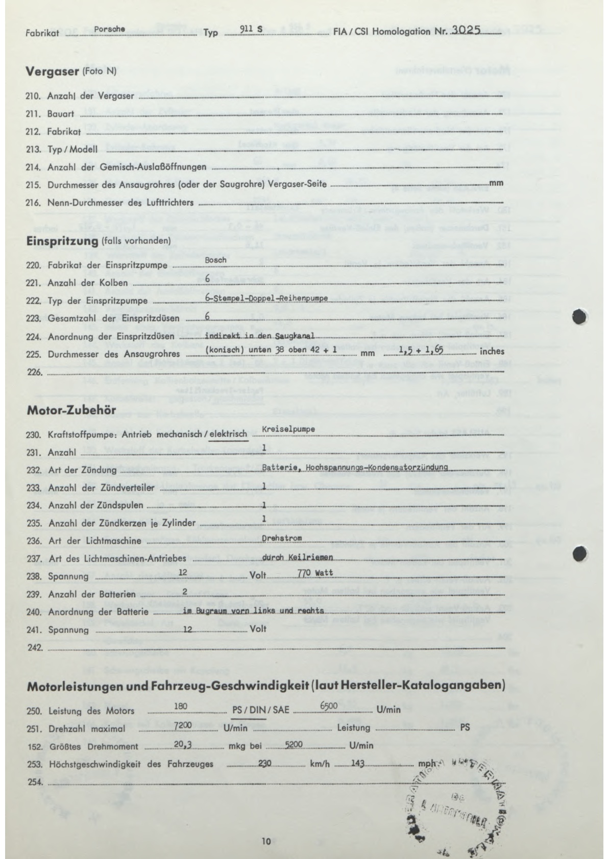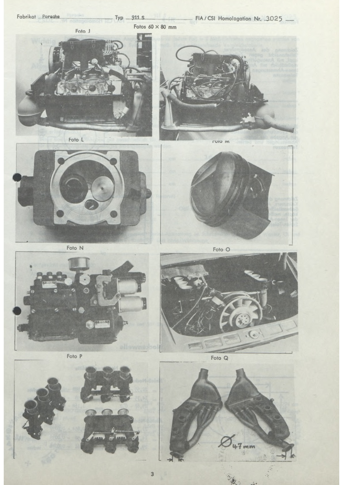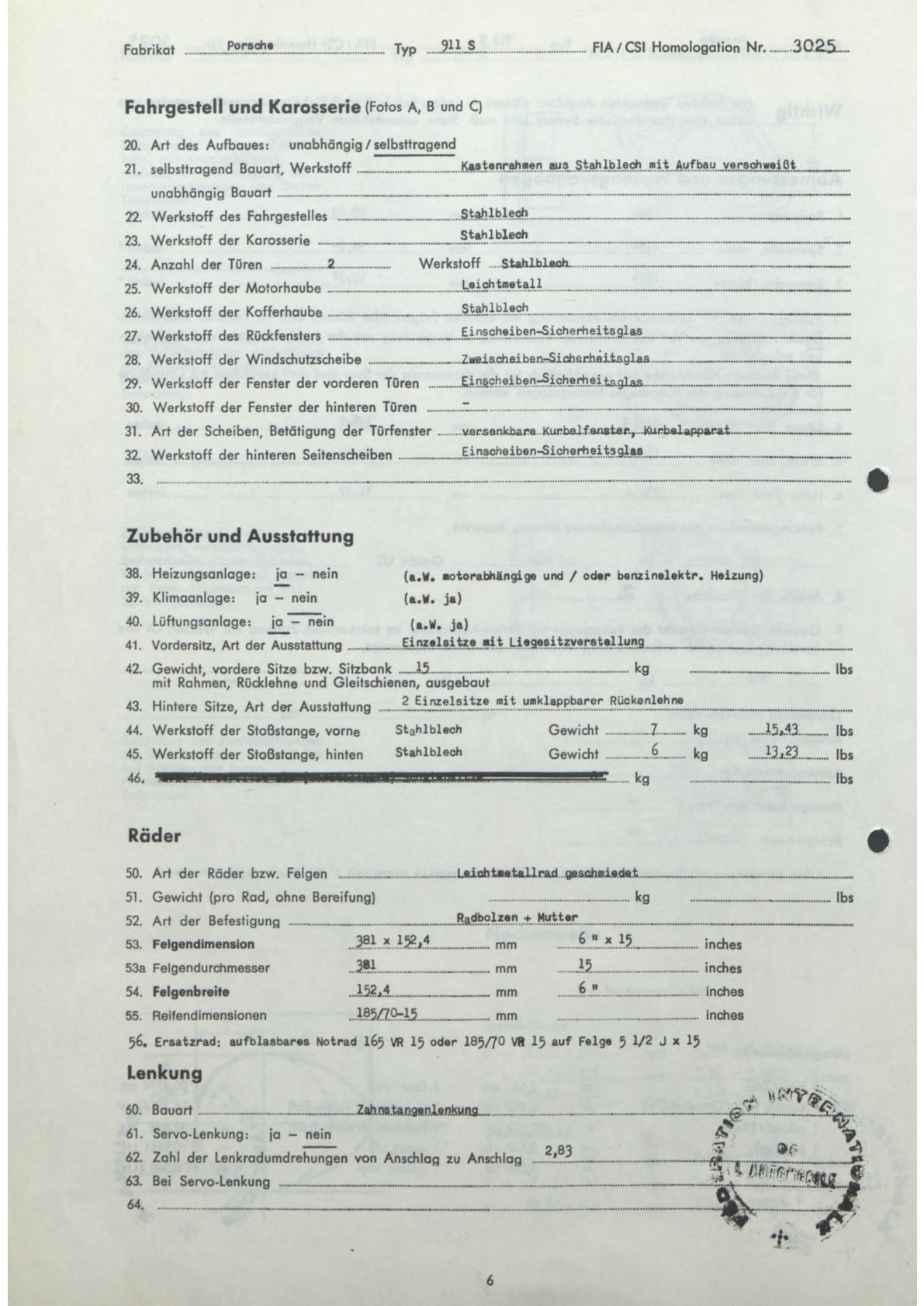 FIA Homologation Protocol for Porsche-911S 2.2 (Group A 3GT) with additions 911S 2.5 for Group 4, 1969