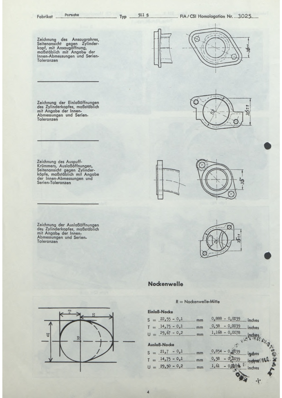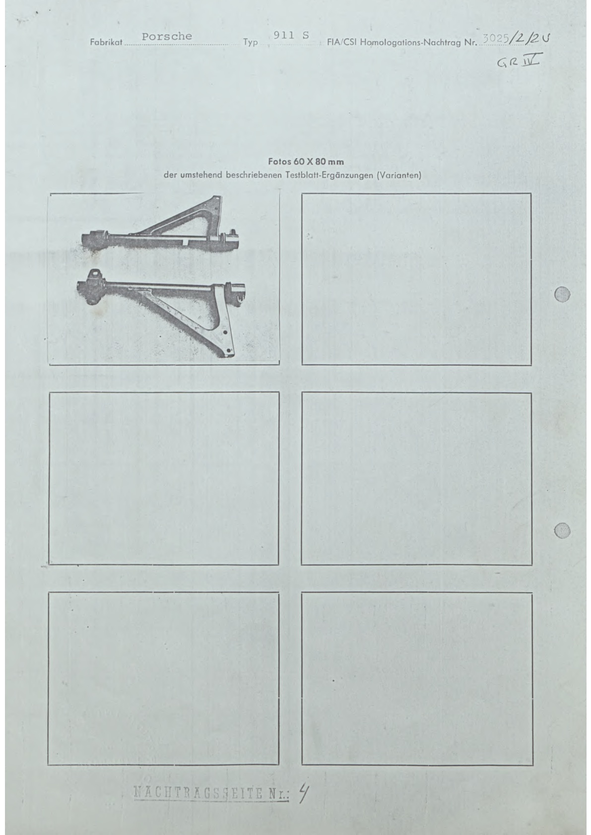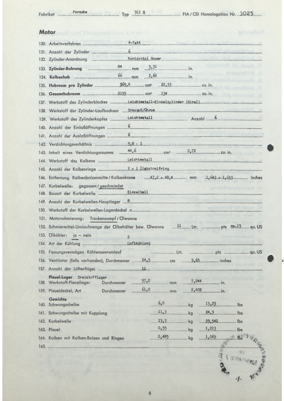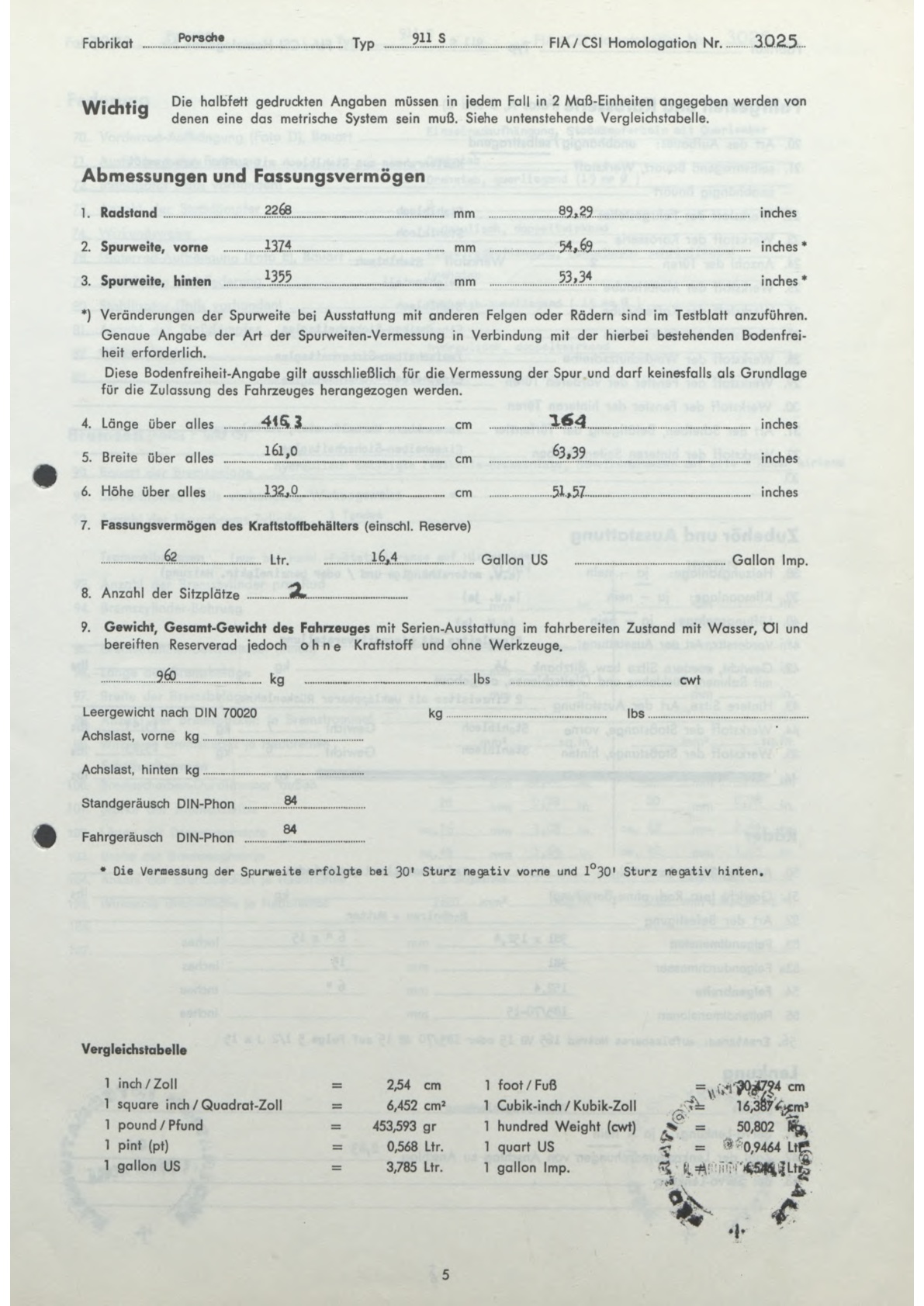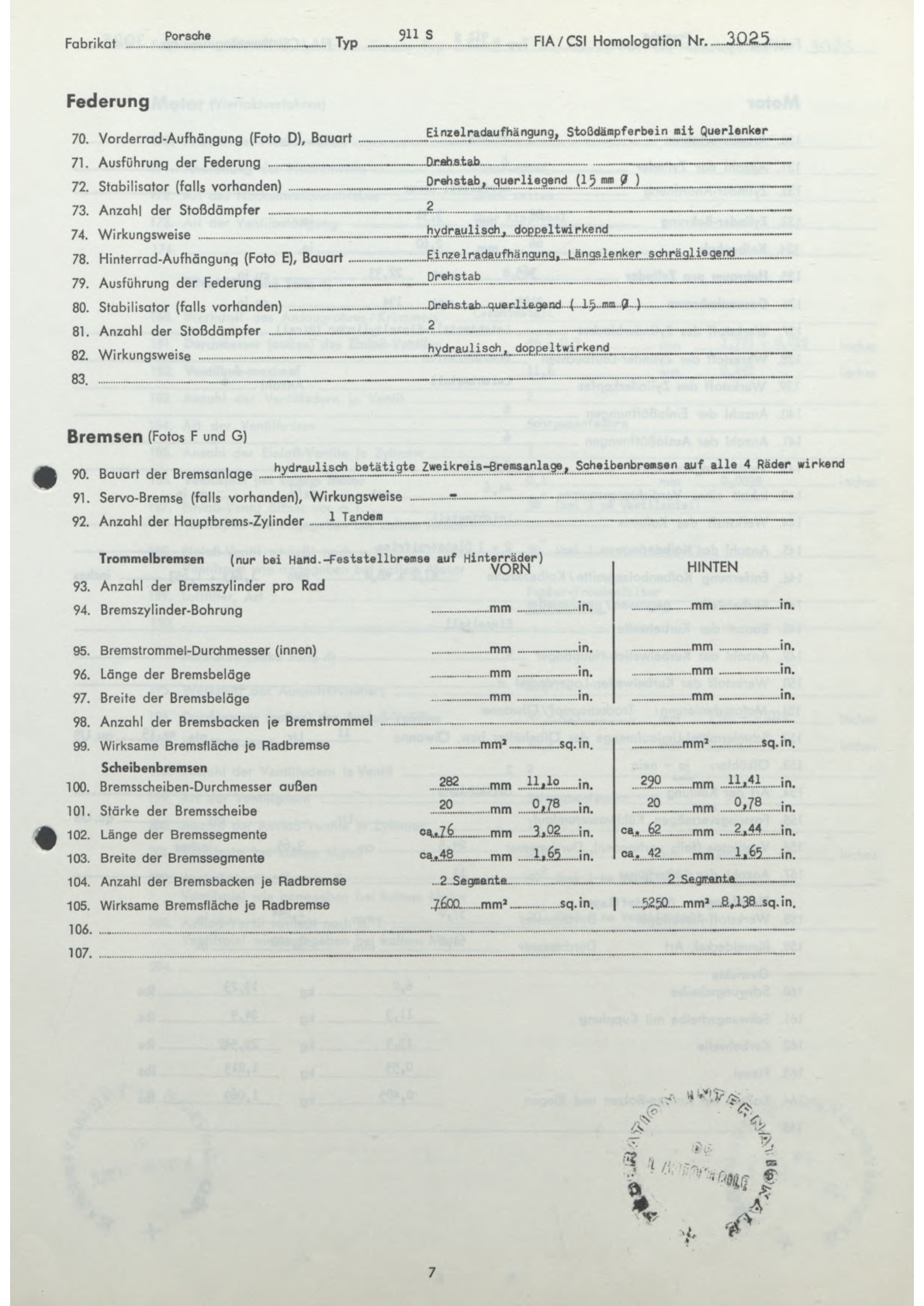 FIA Homologation Protocol for Porsche-911S 2.2 (Group A 3GT) with additions 911S 2.5 for Group 4, 1969