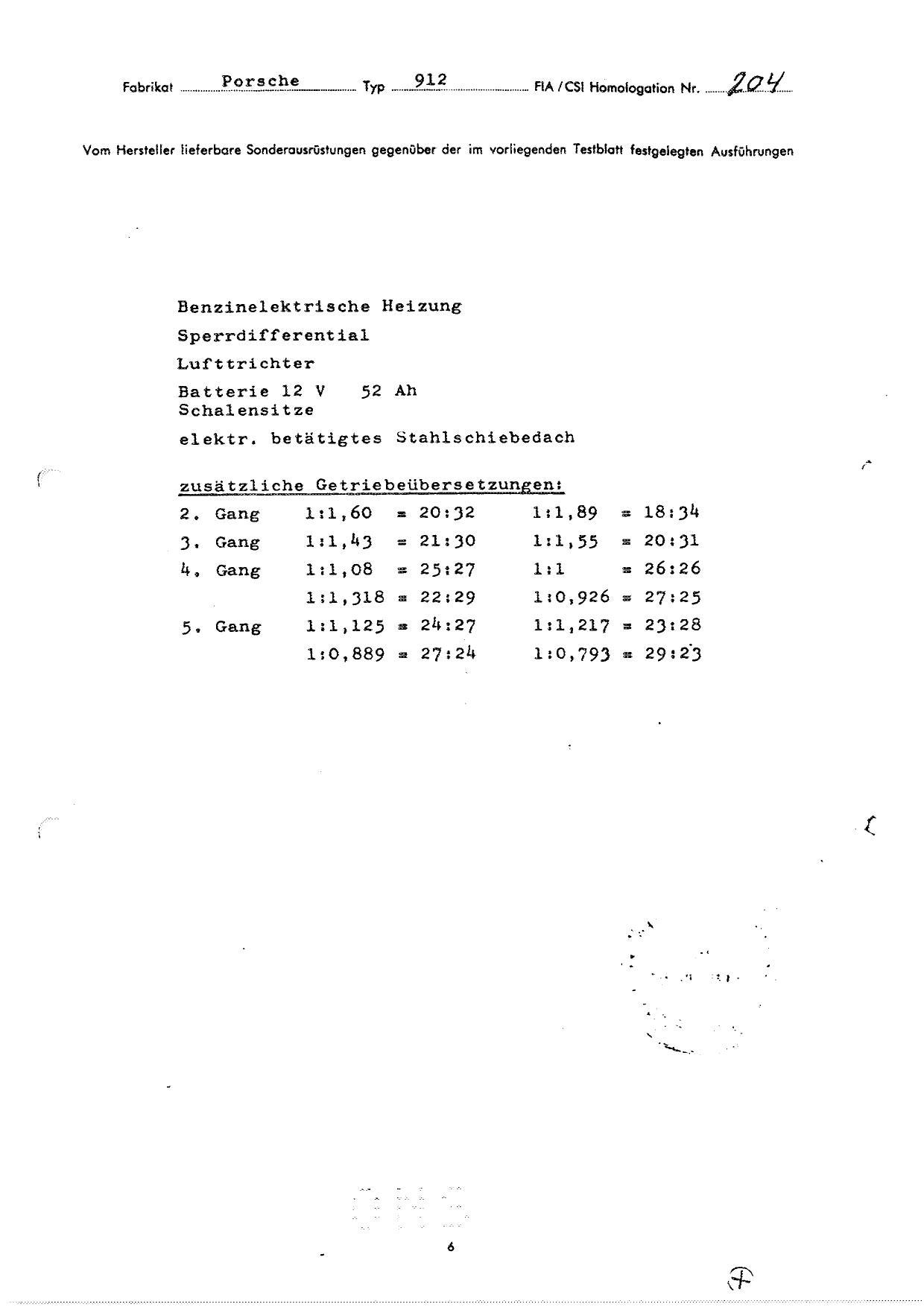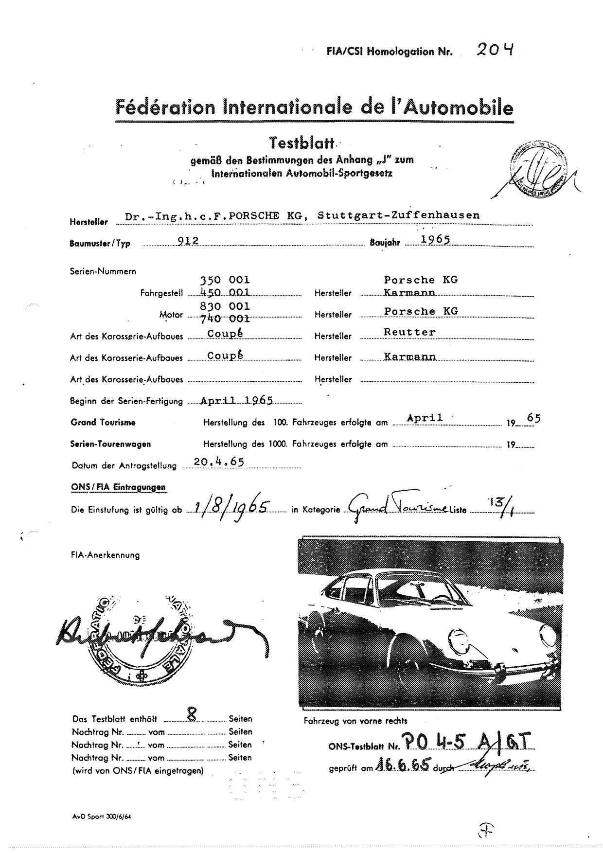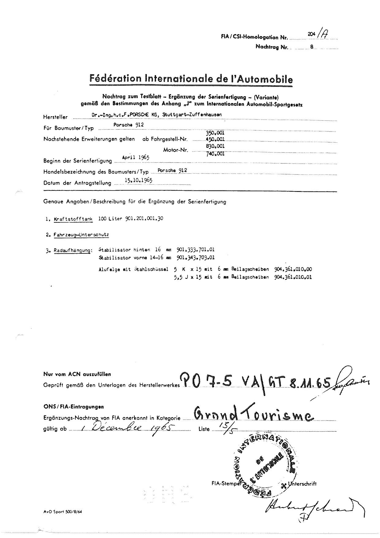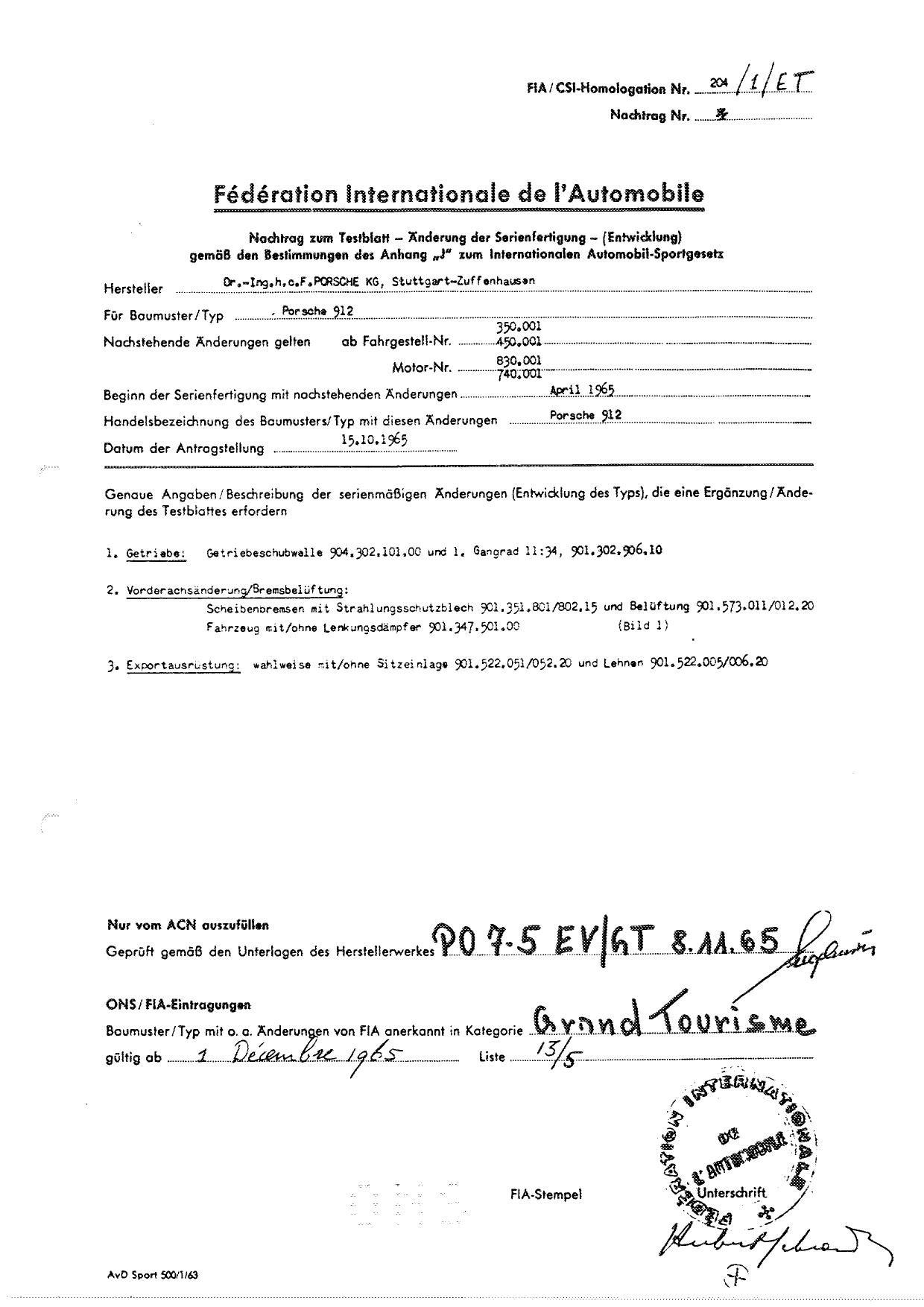 FIA Homologation Protocol for Porsche 912, 04.1965