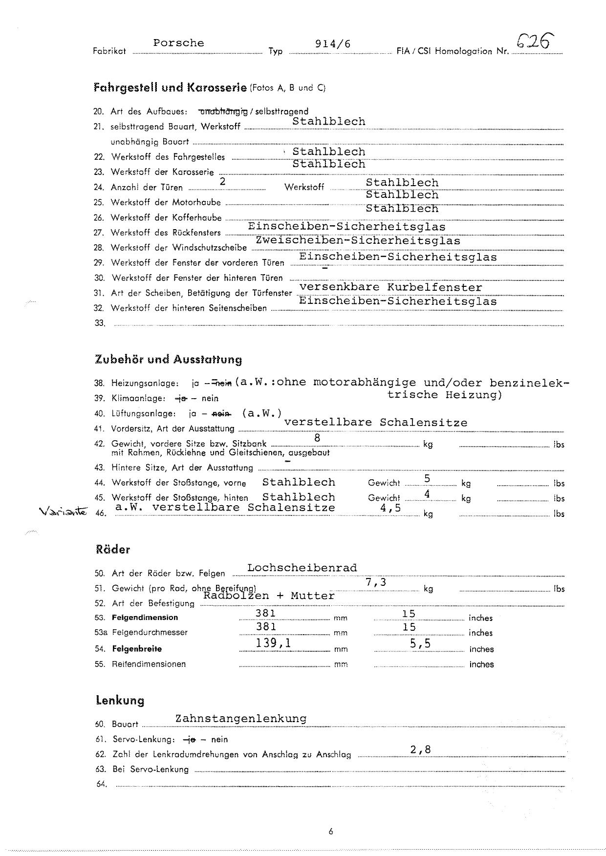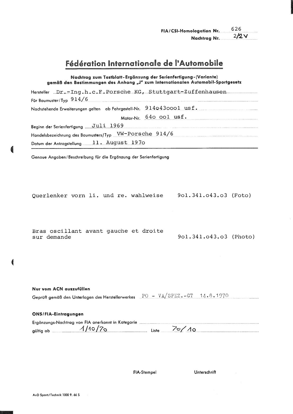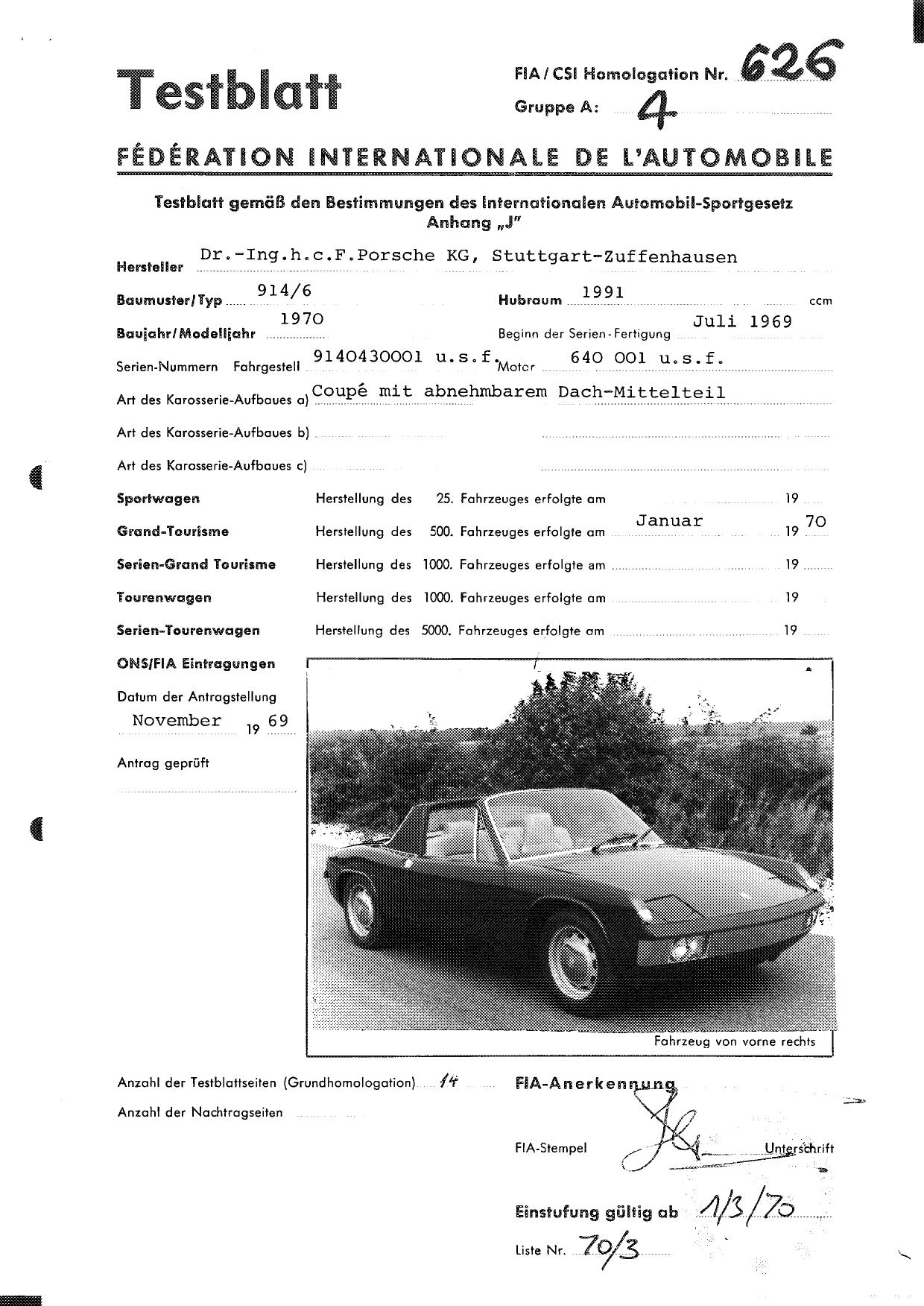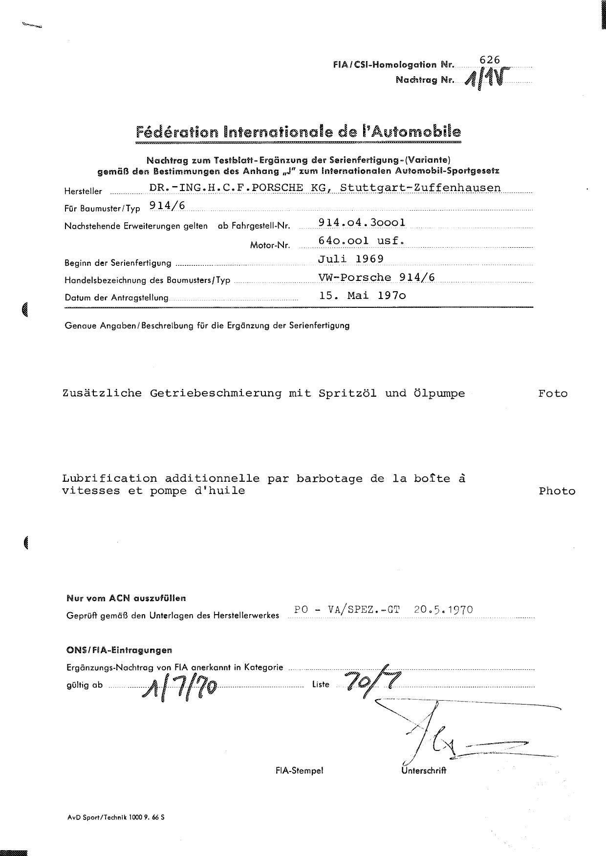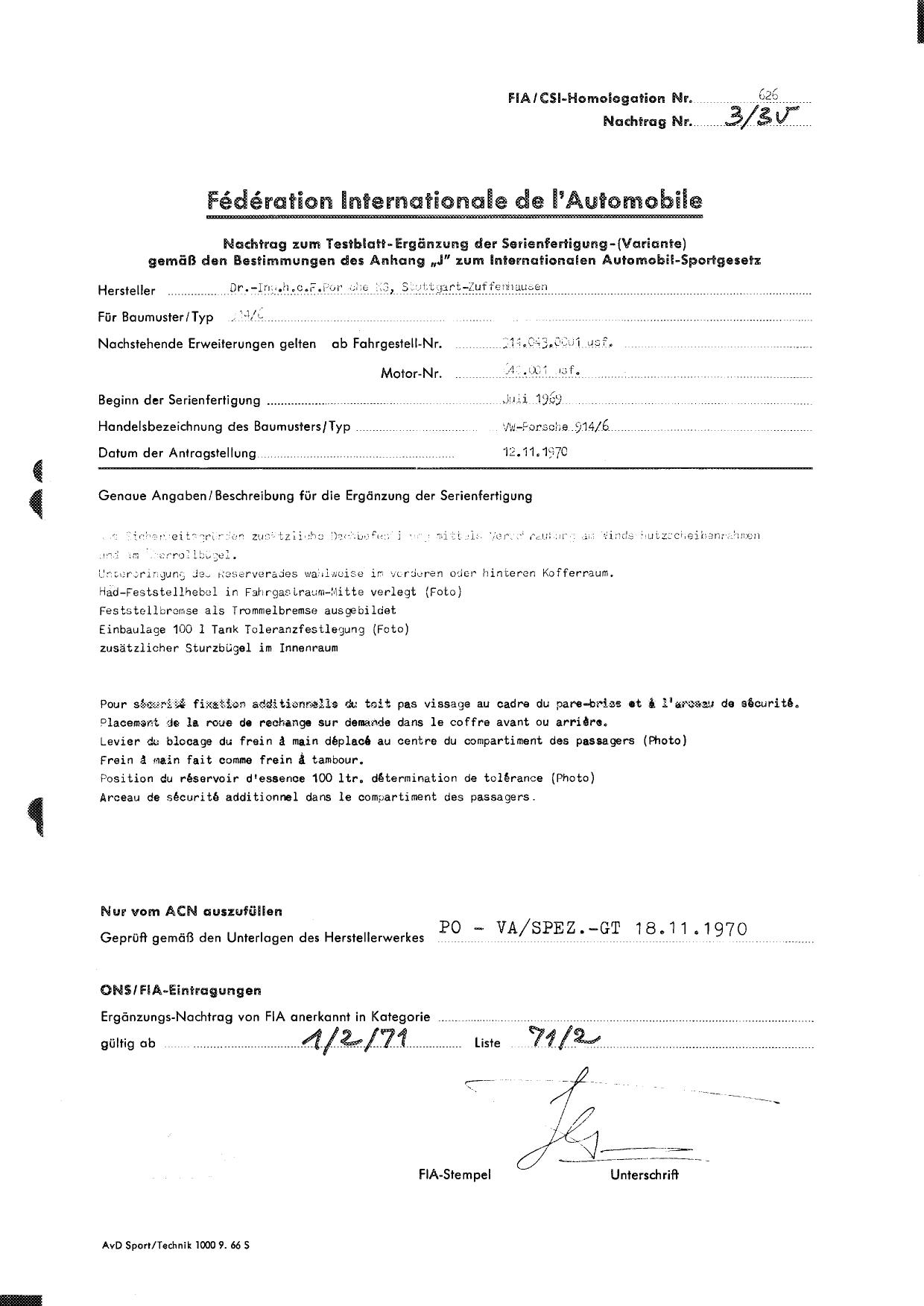 FIA Homologation Protocol for Porsche-914/6, 1969