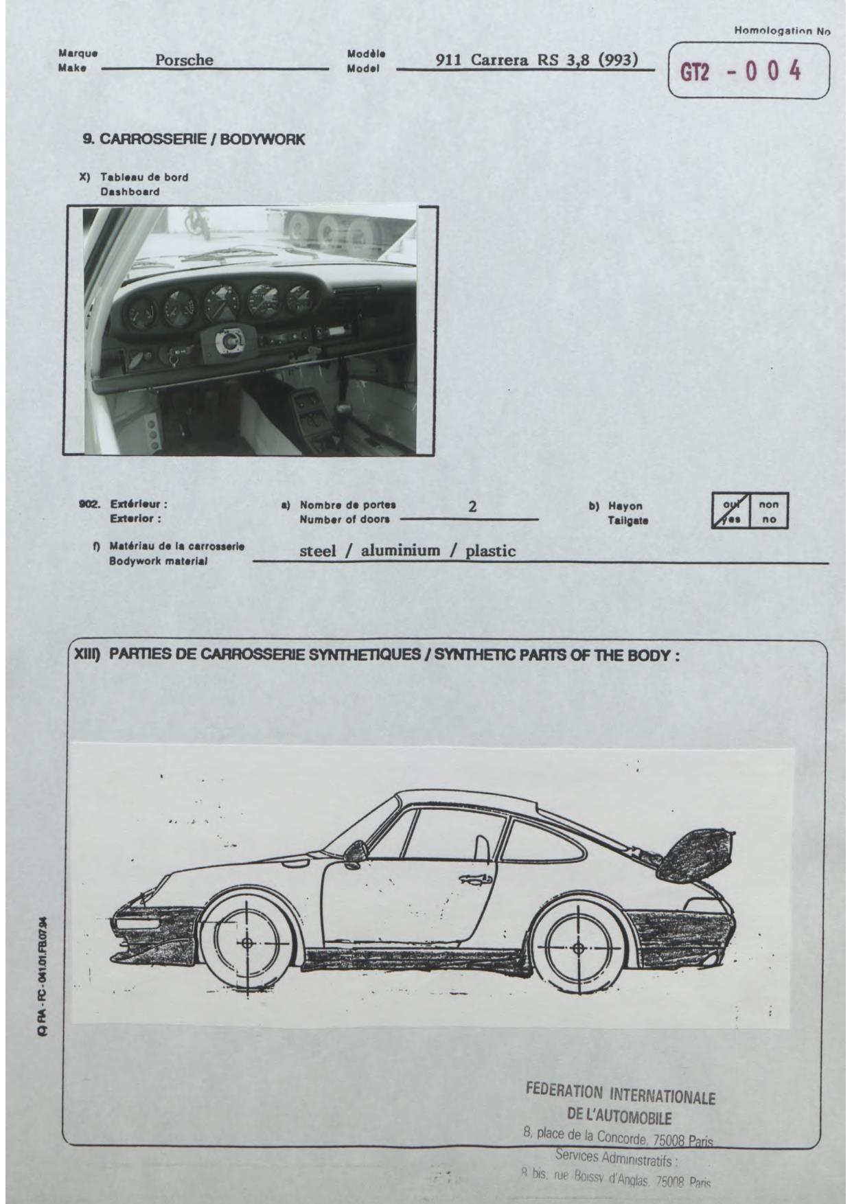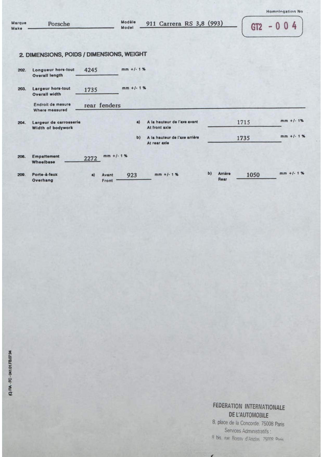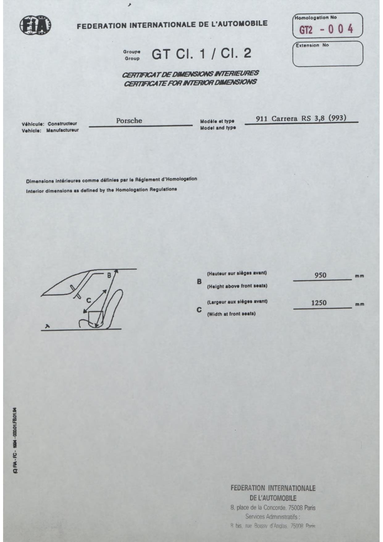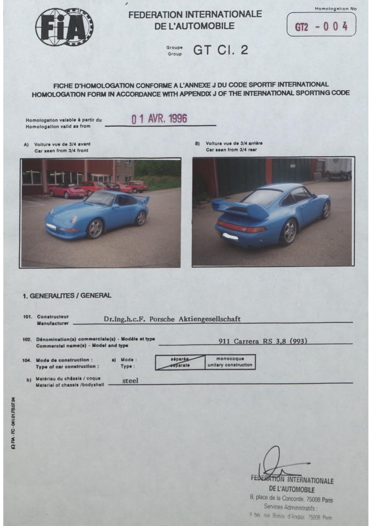FIA Homologation Protocol for Porsche-993 Carrera RS 3.8, 1996