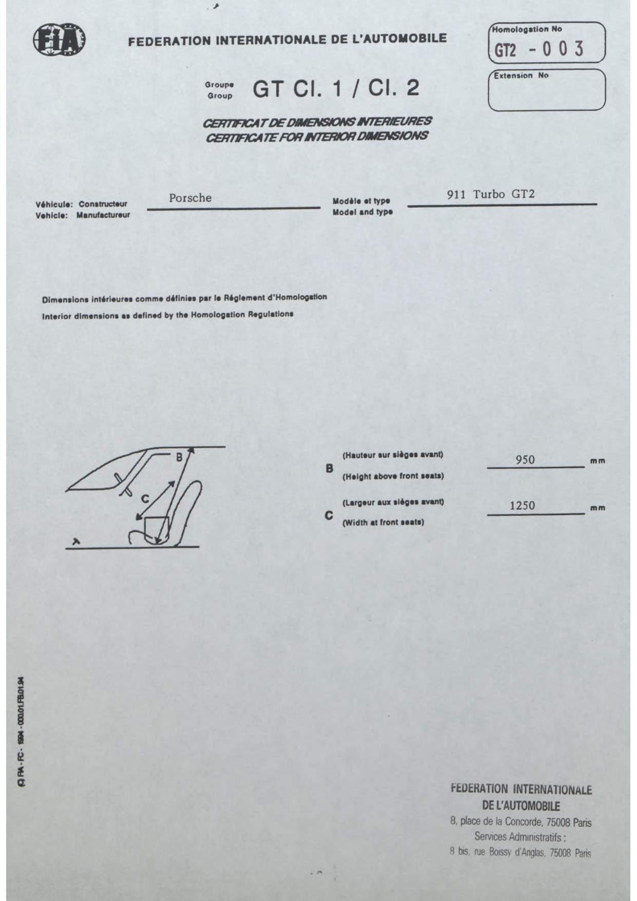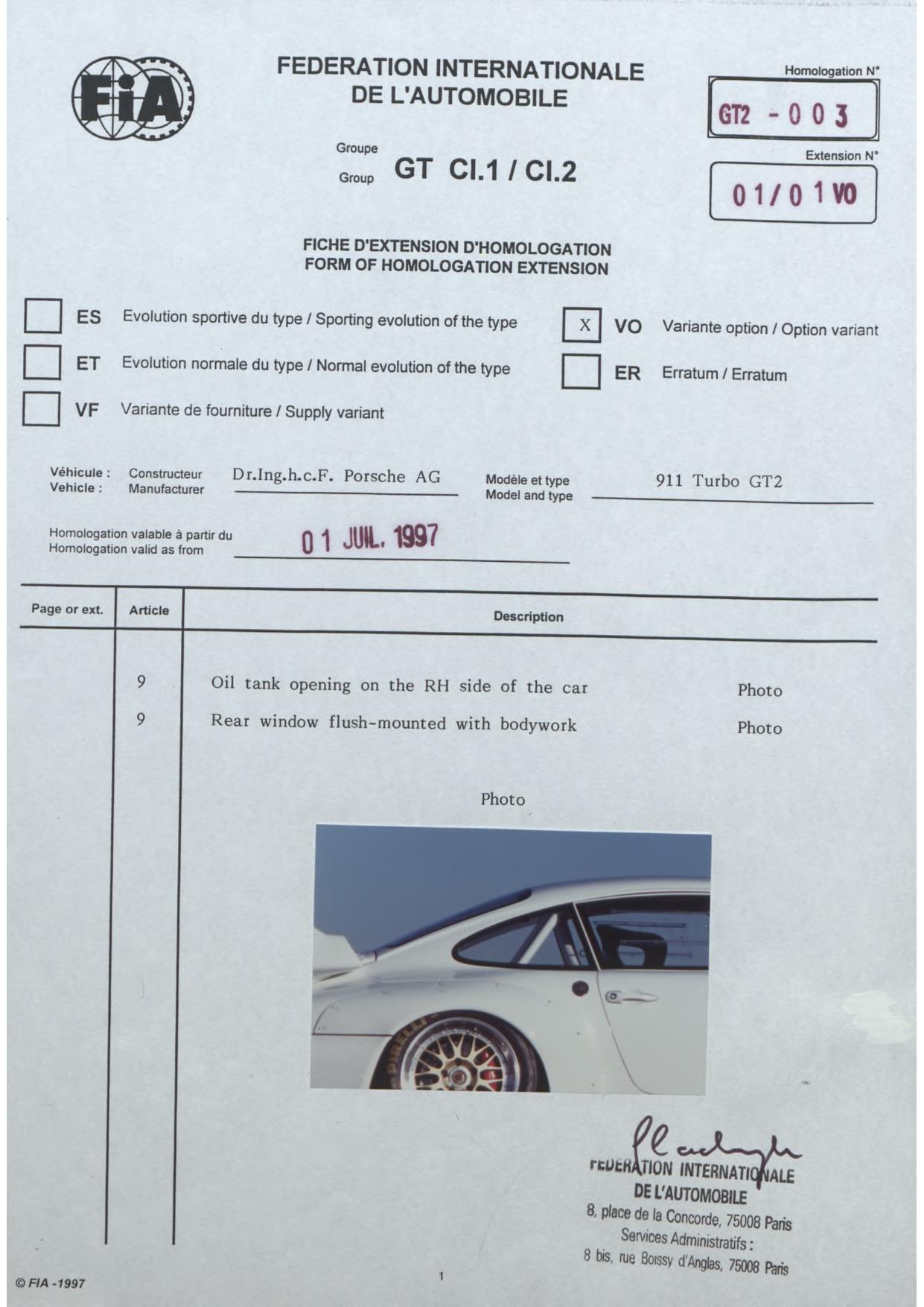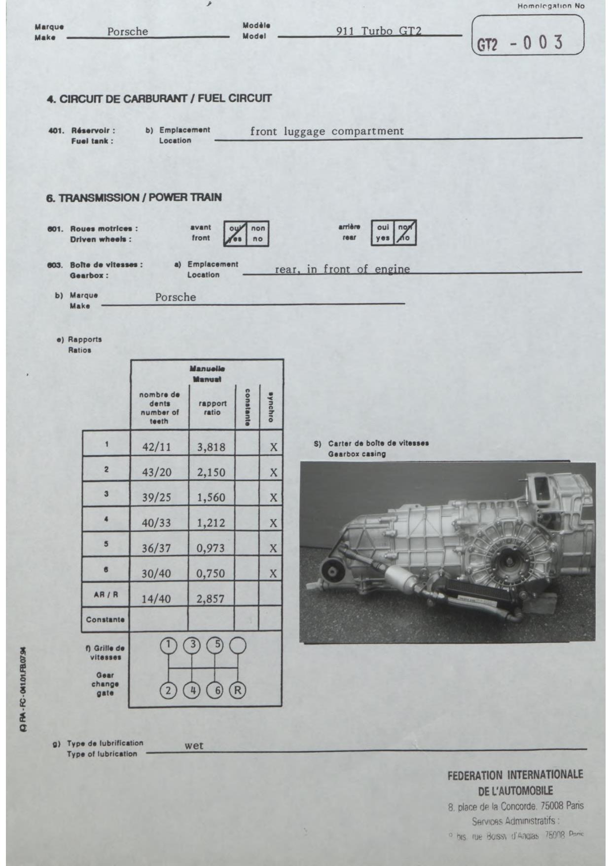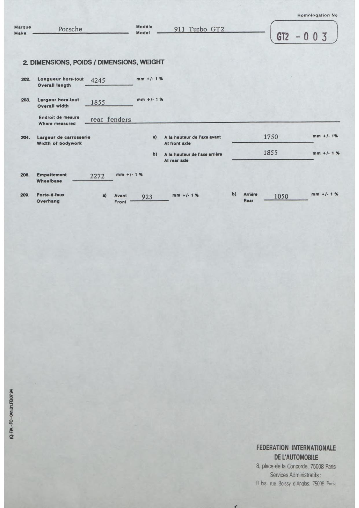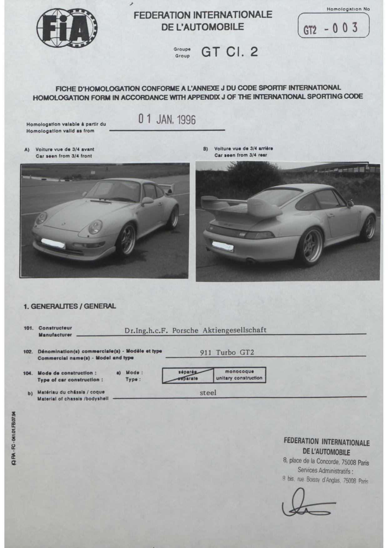 FIA Homologation Protocol for Porsche-993 GT2, 1996