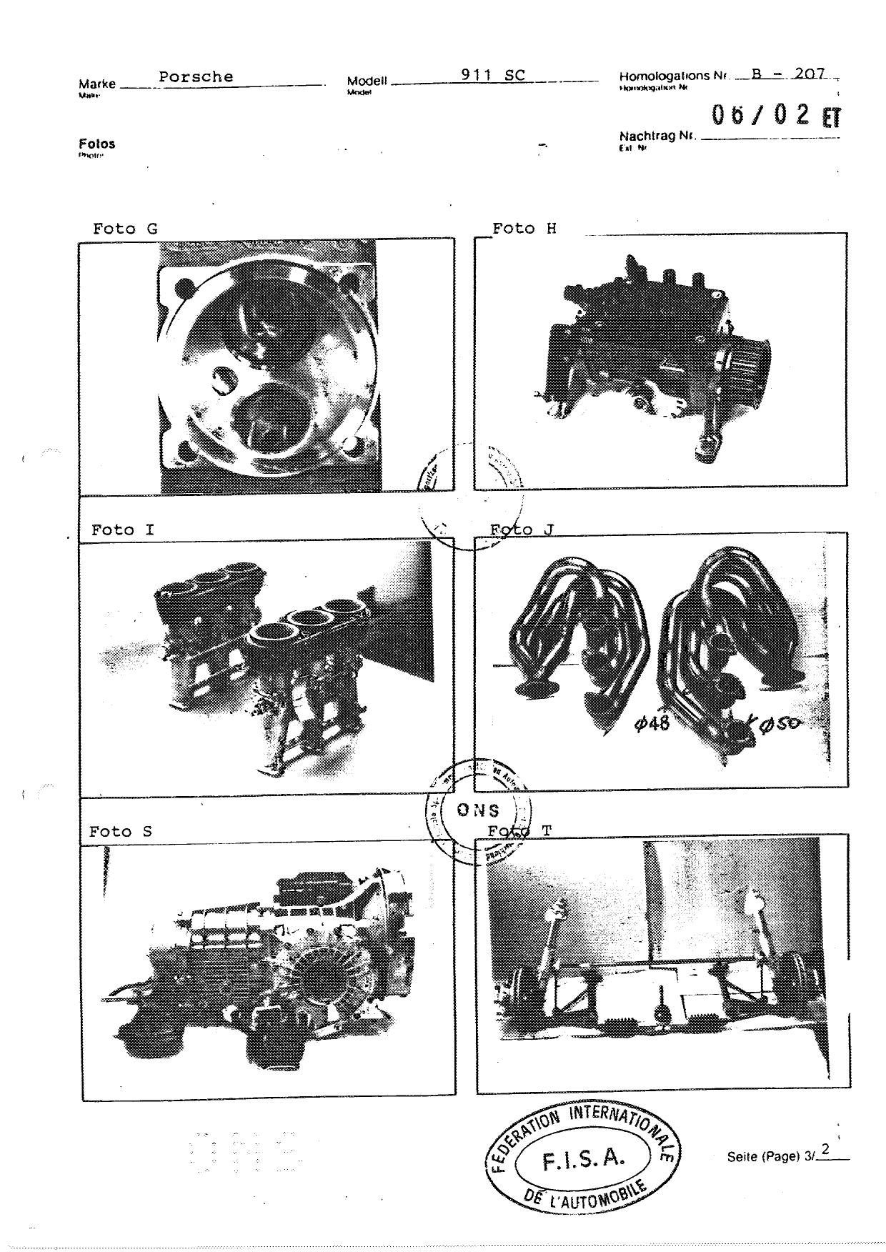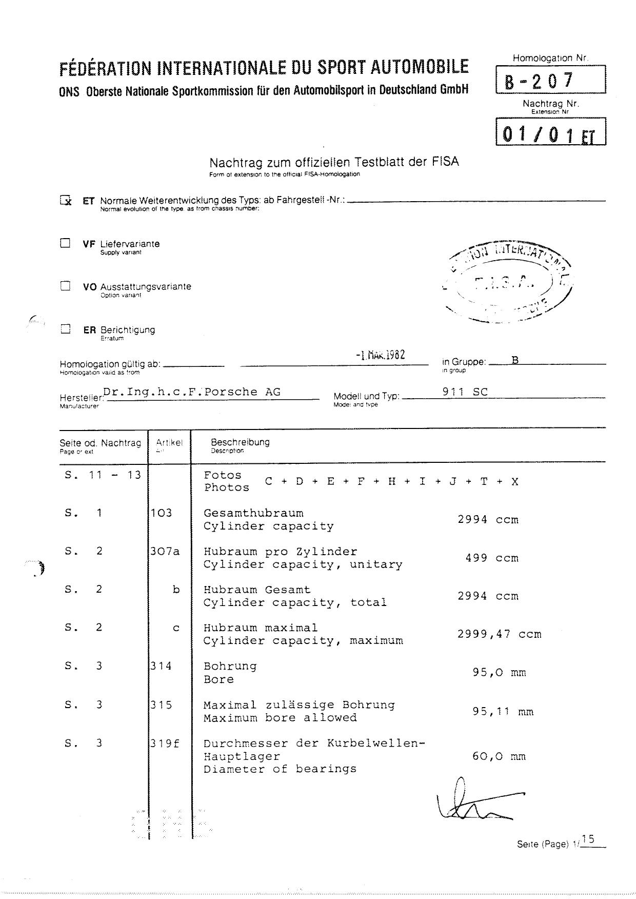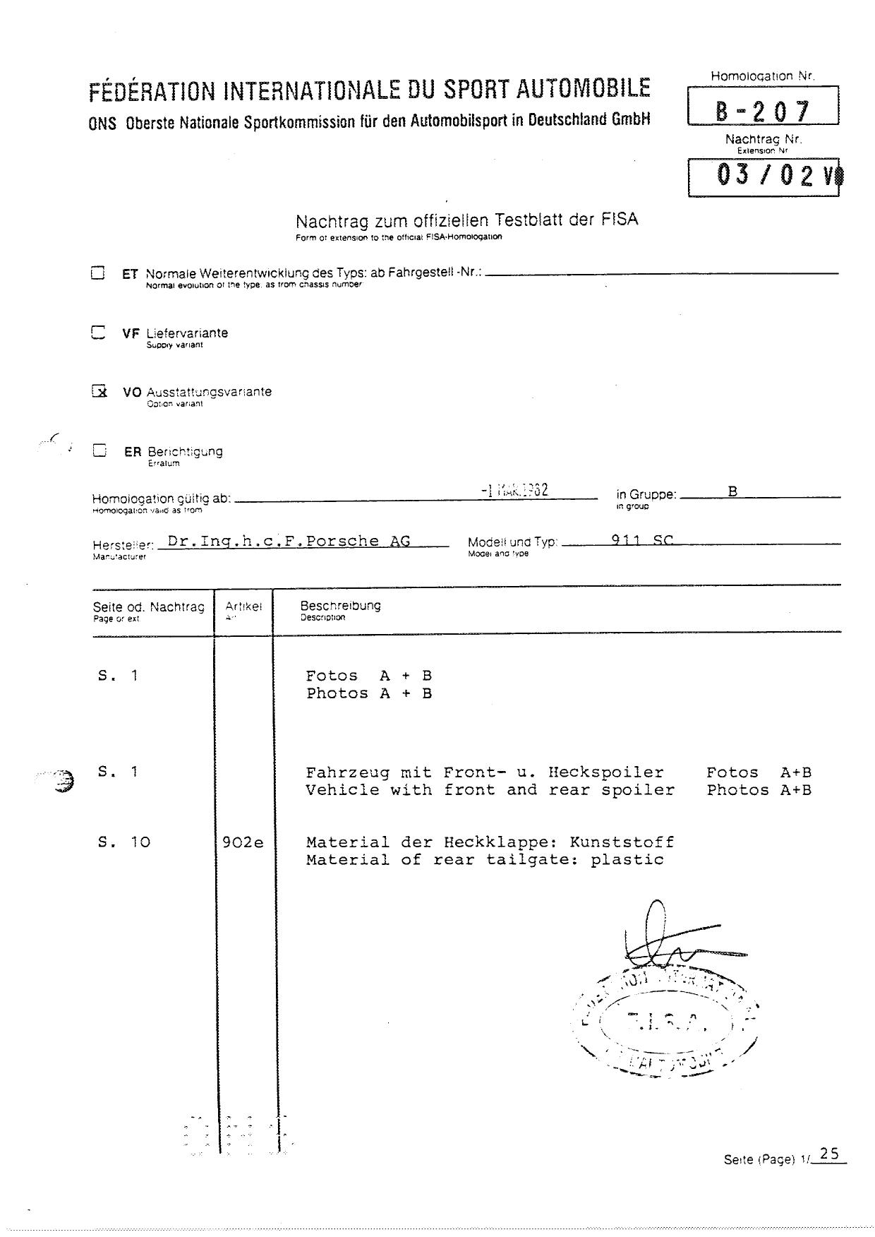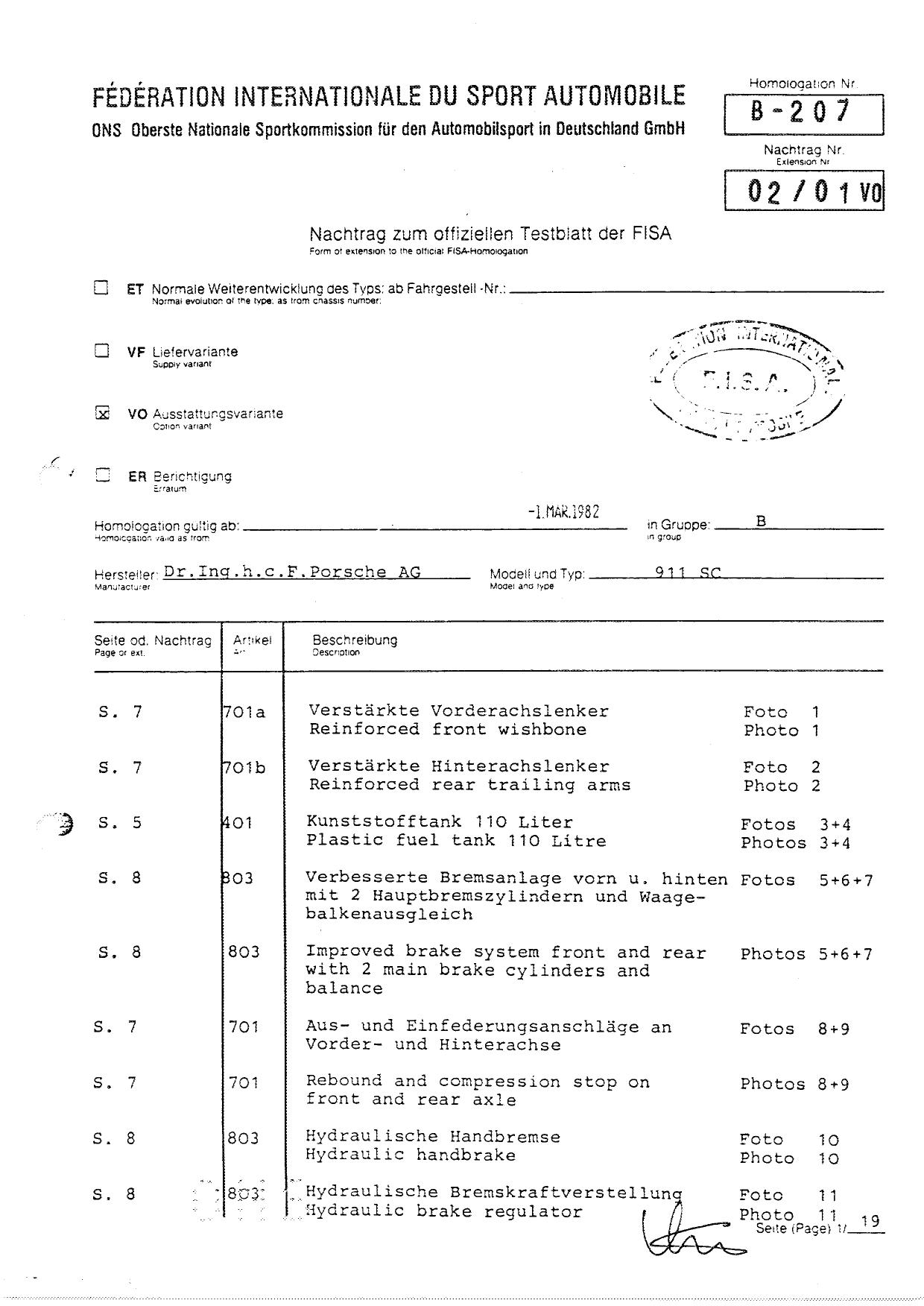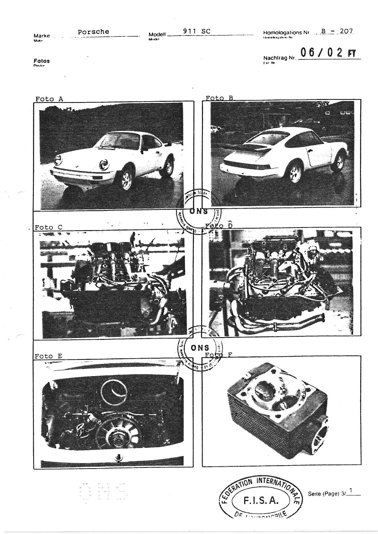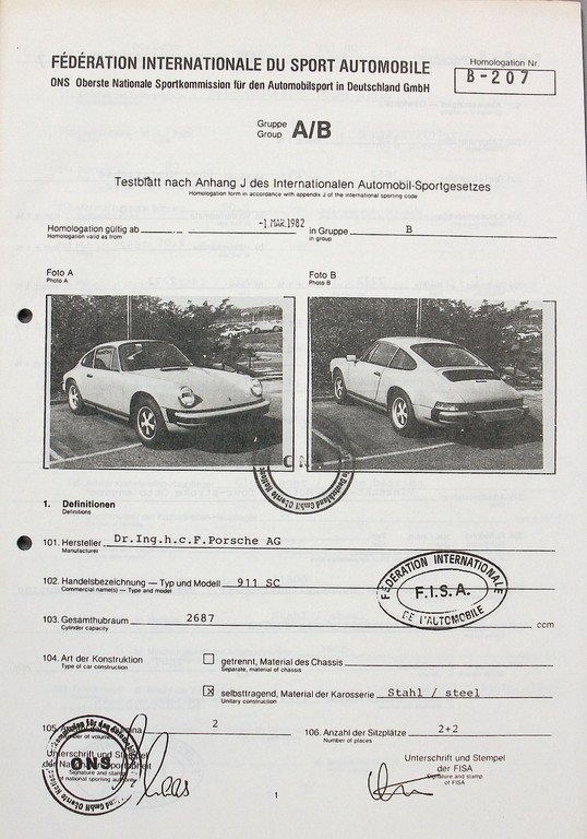 FISA Homologation Protocol for Porsche-911 SC, 1982
