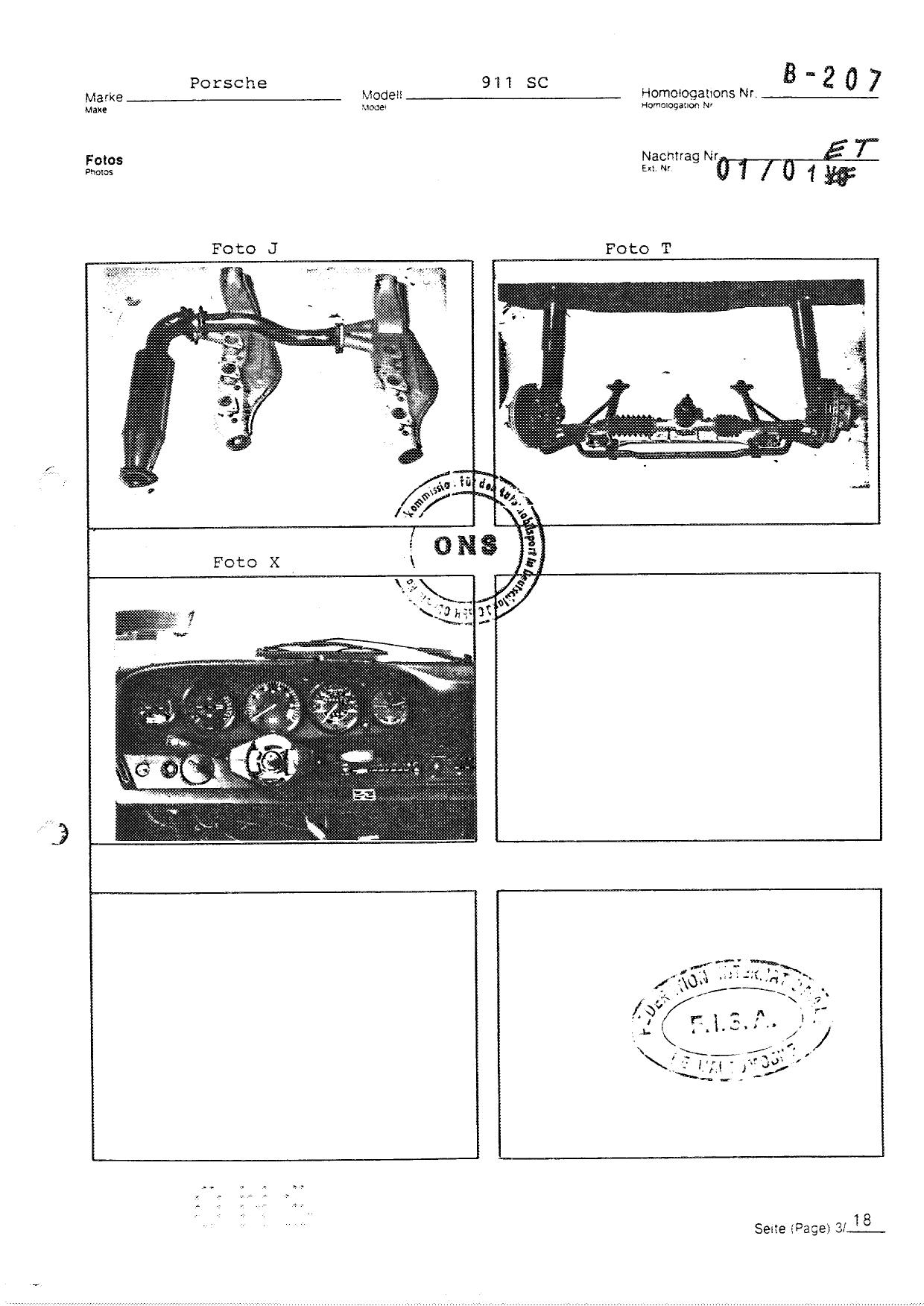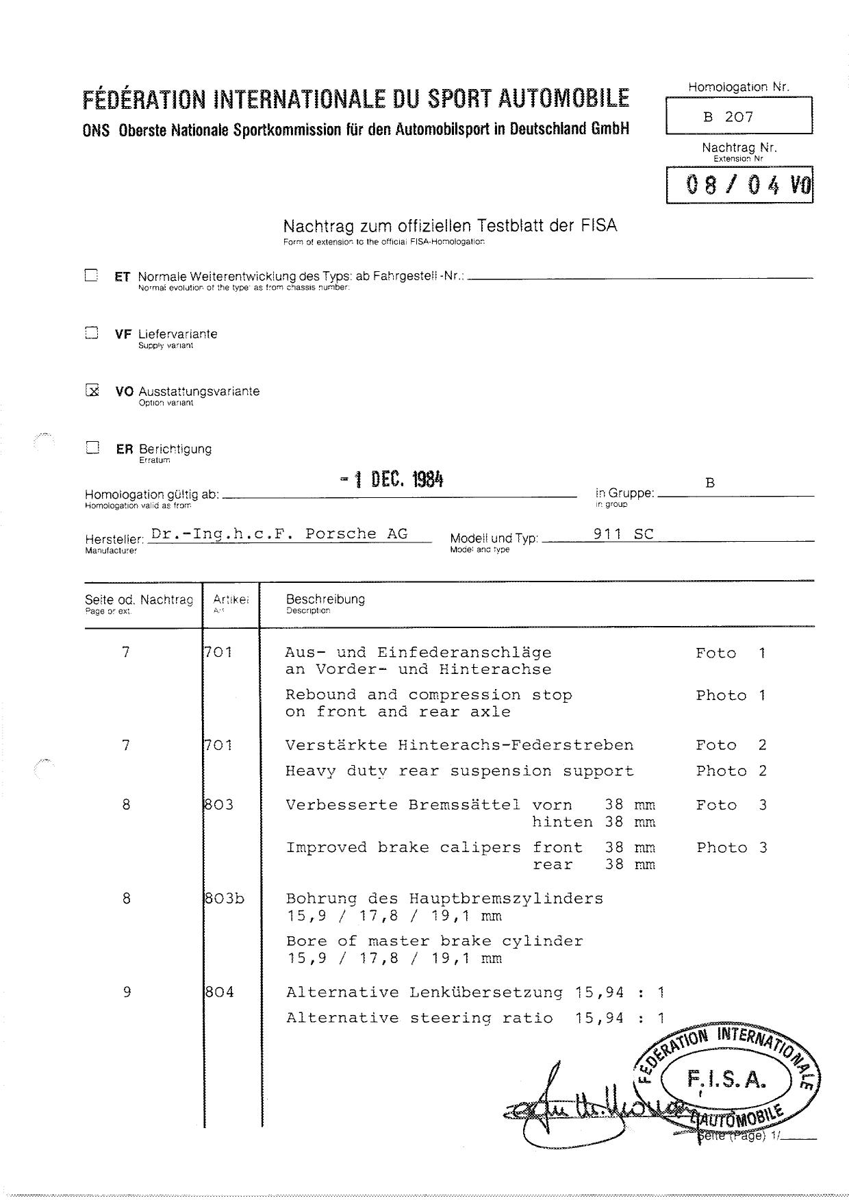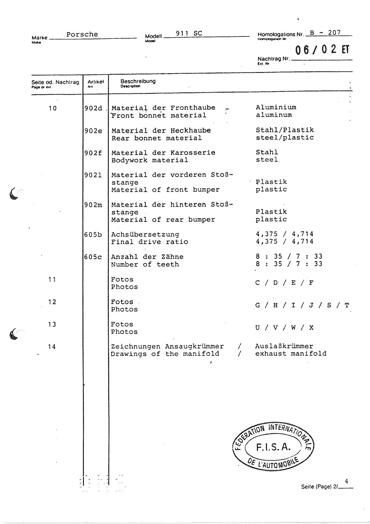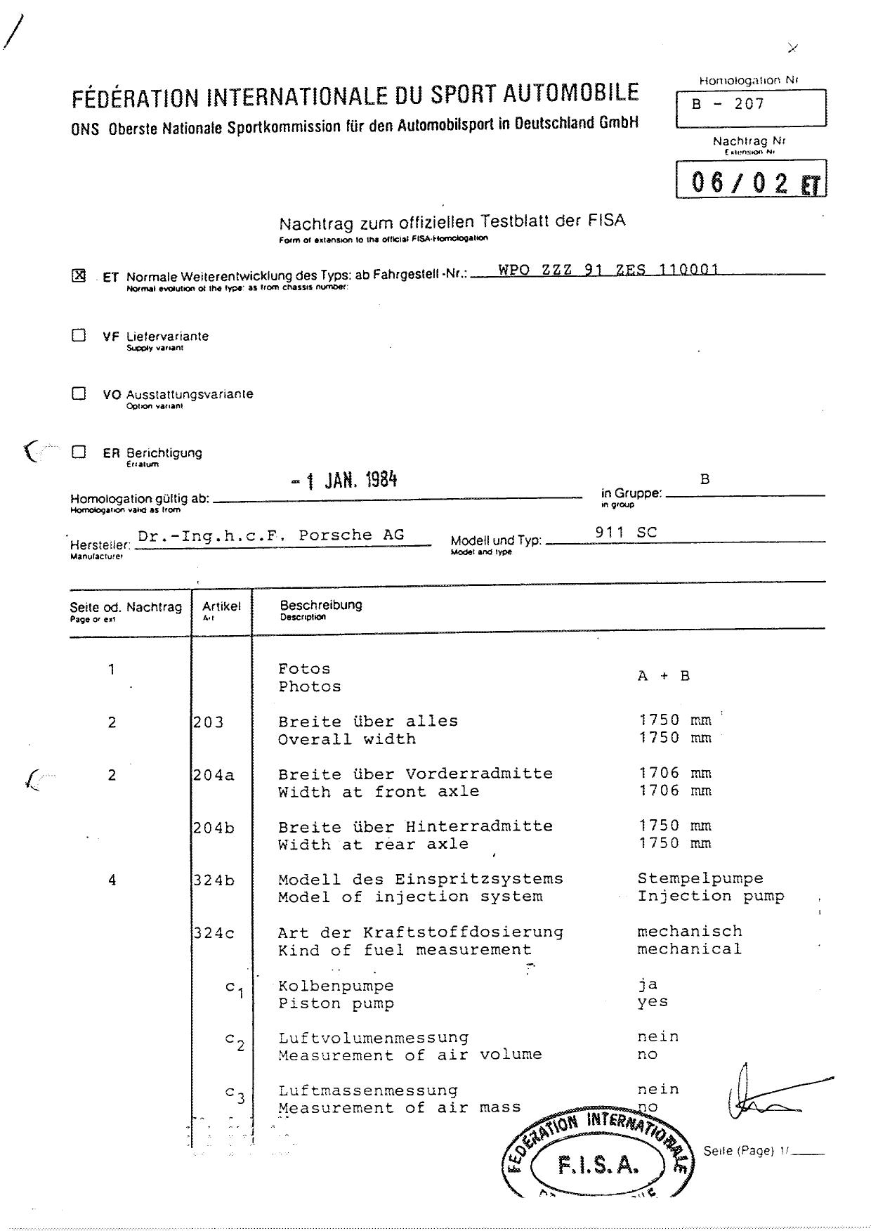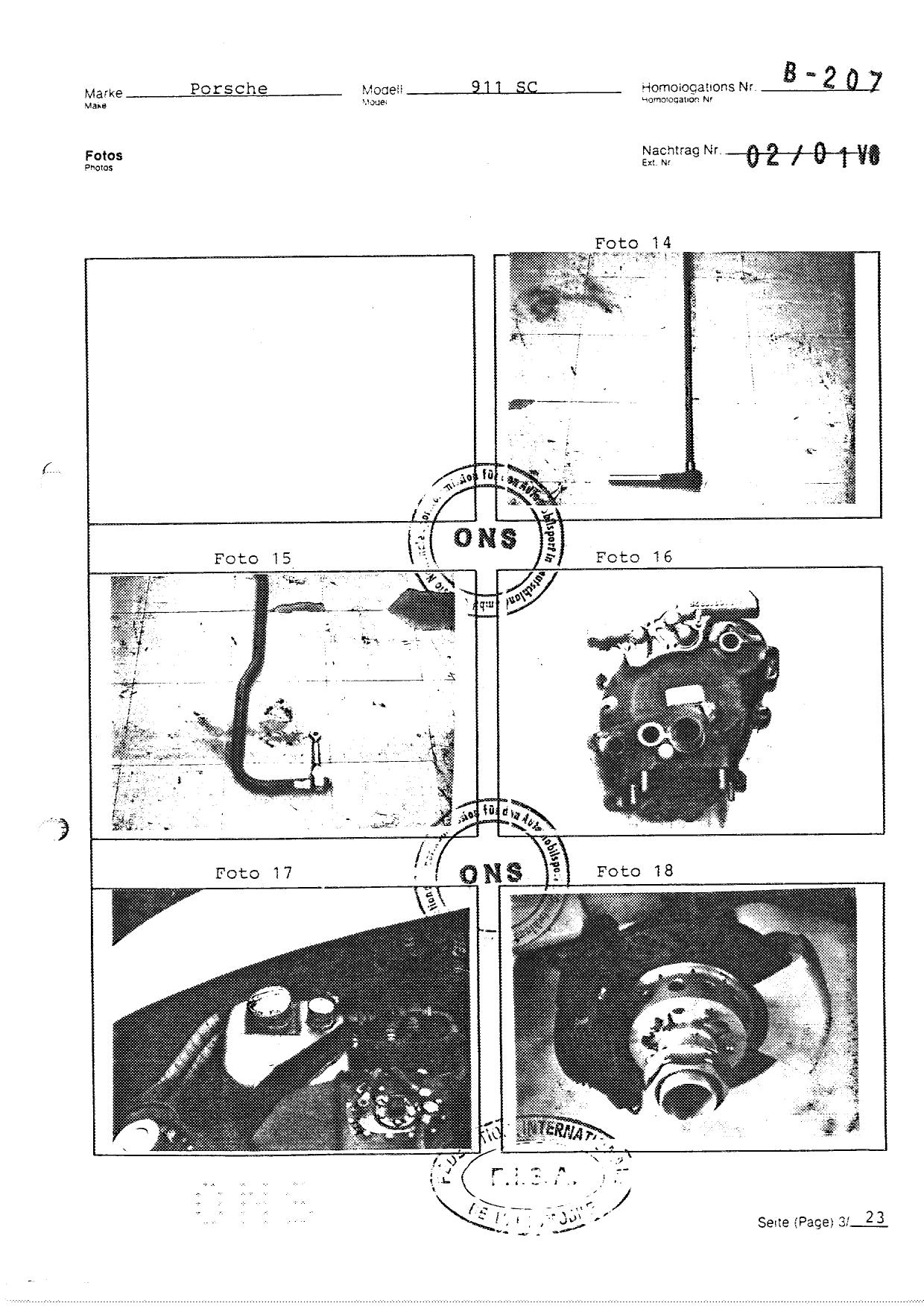 FISA Homologation Protocol for Porsche-911 SC, 1982
