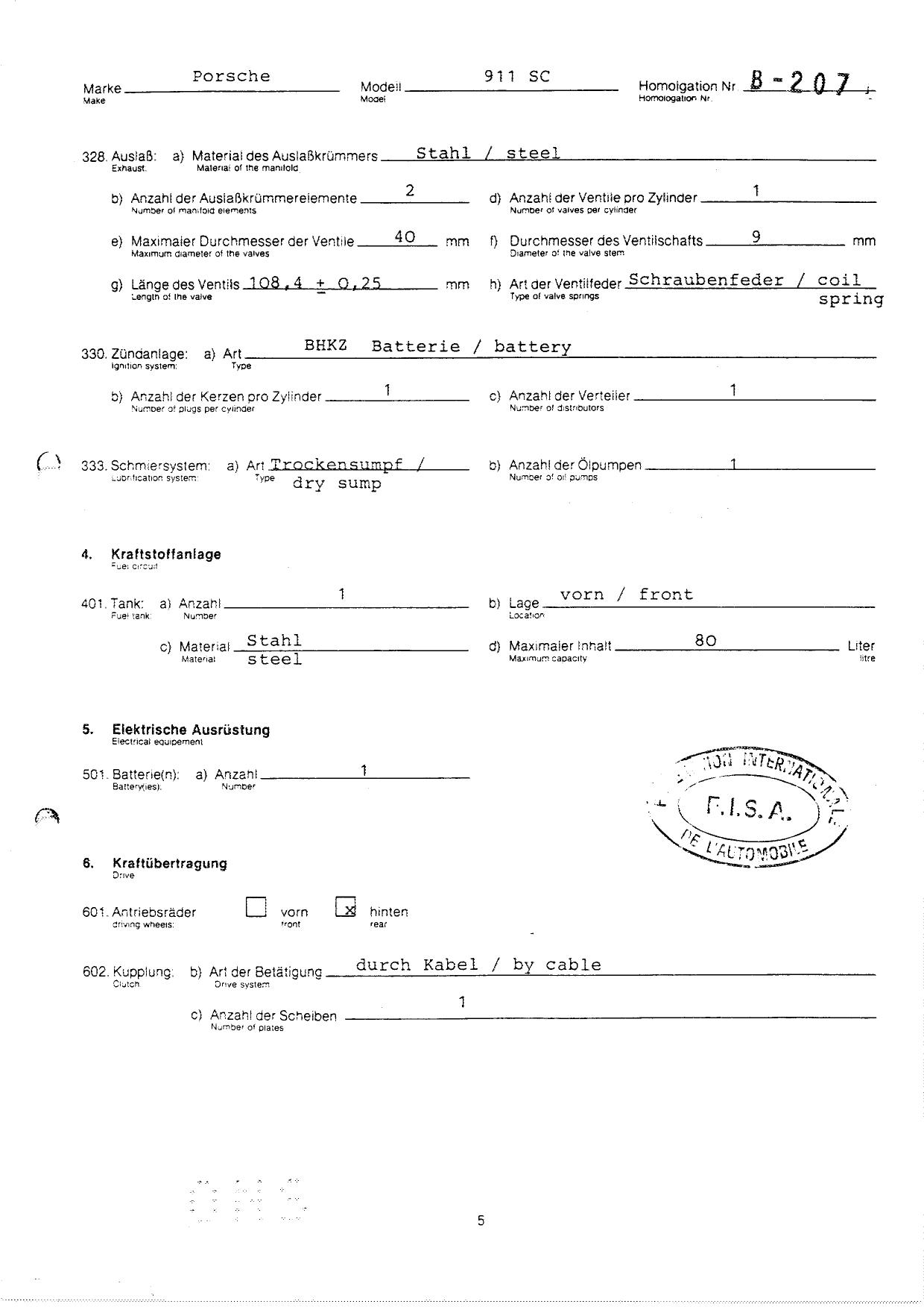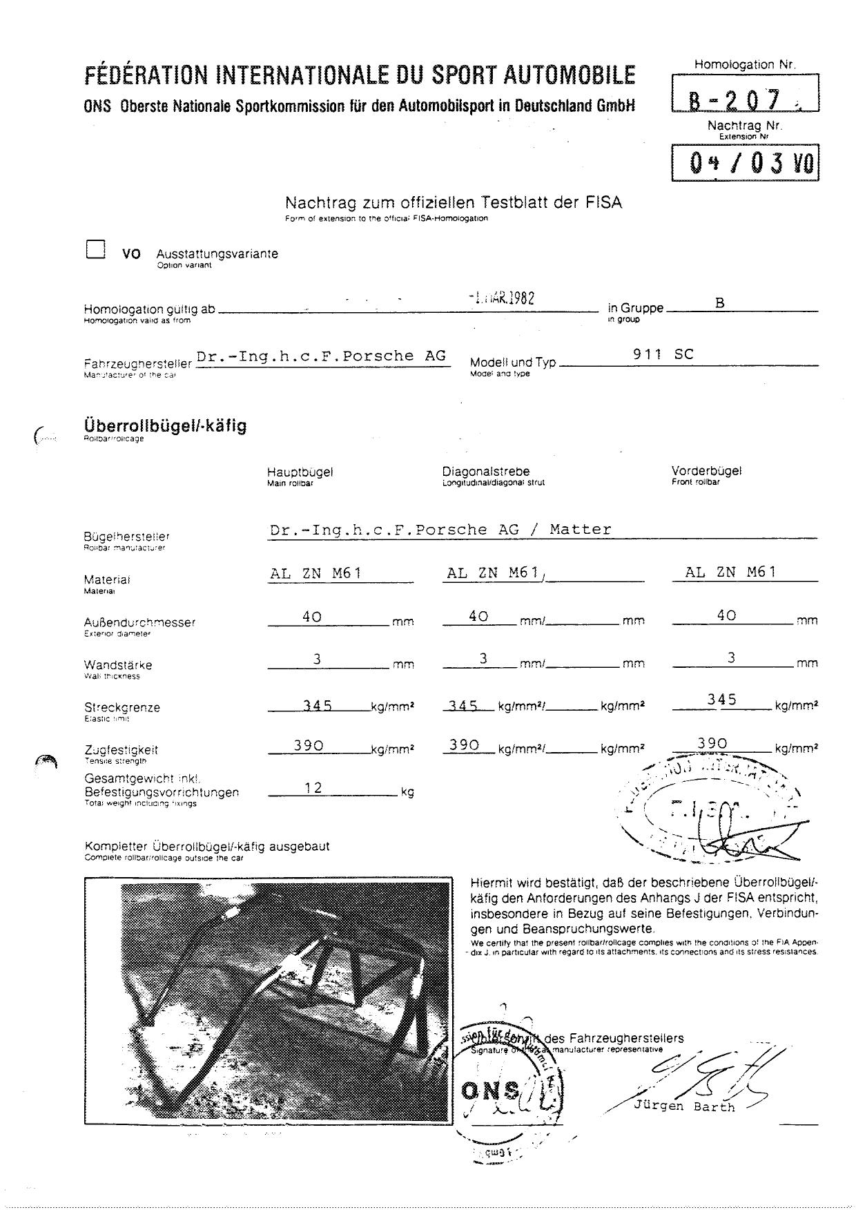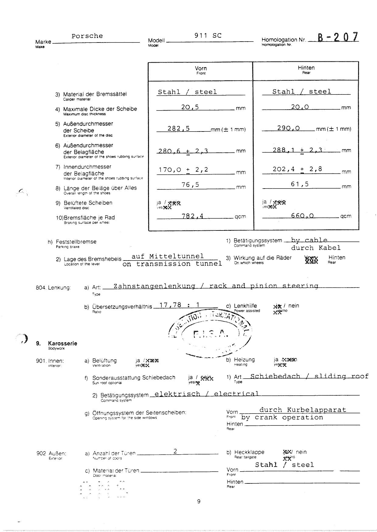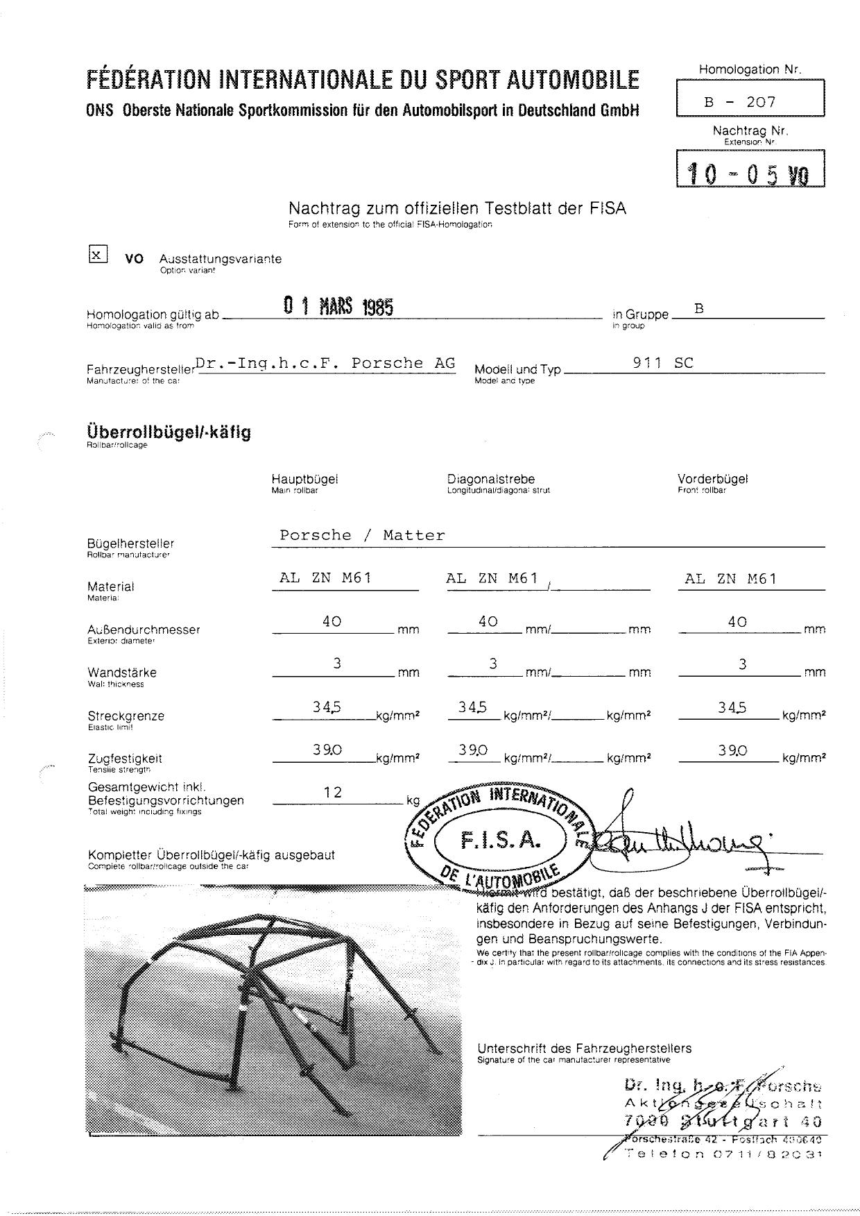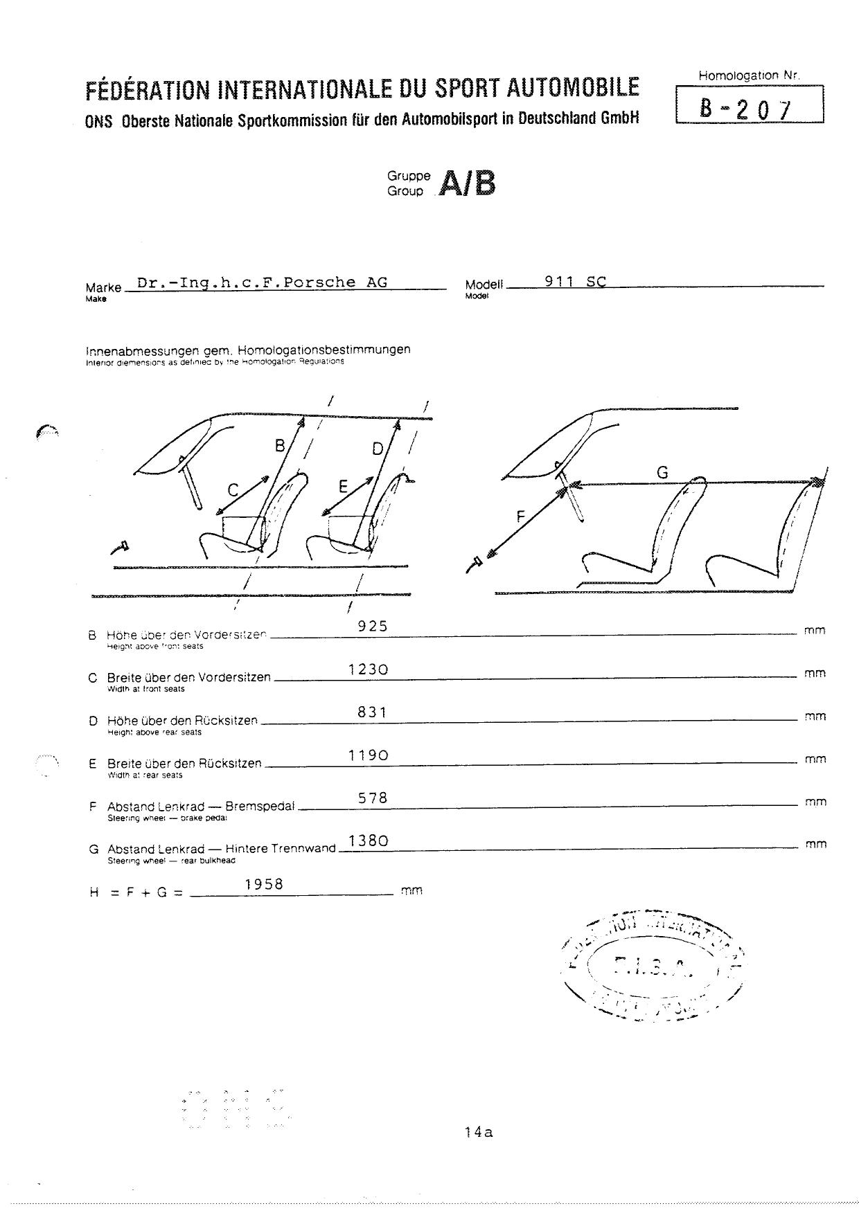 FISA Homologation Protocol for Porsche-911 SC, 1982
