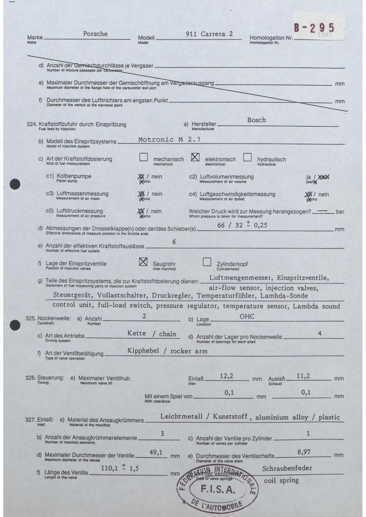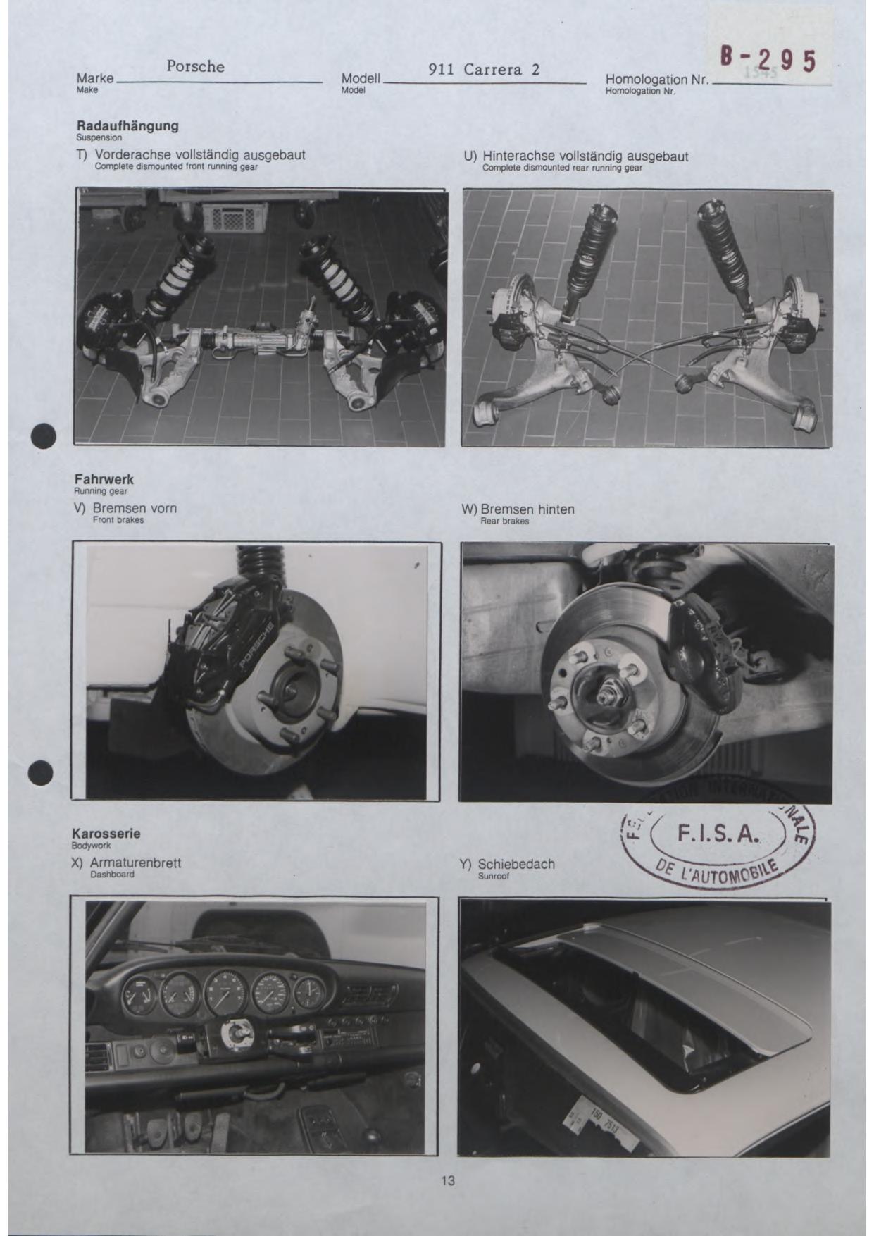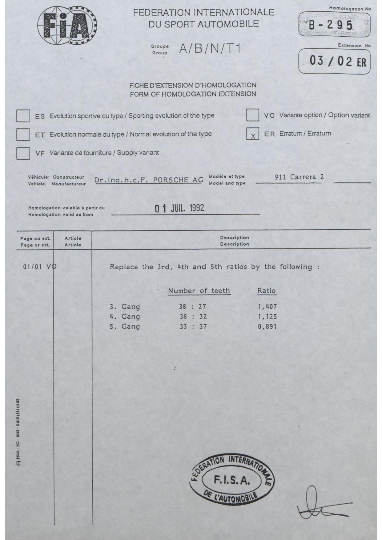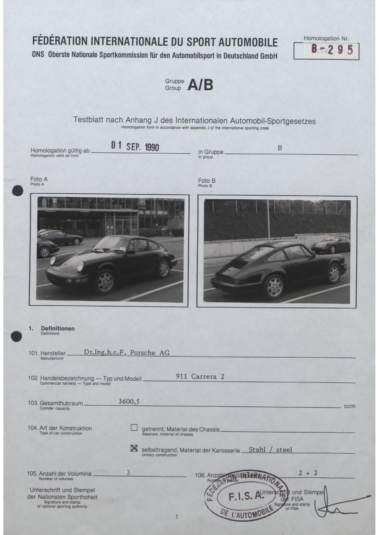 FISA Homologation Protocol for Porsche-964 Carrera 2, 1990