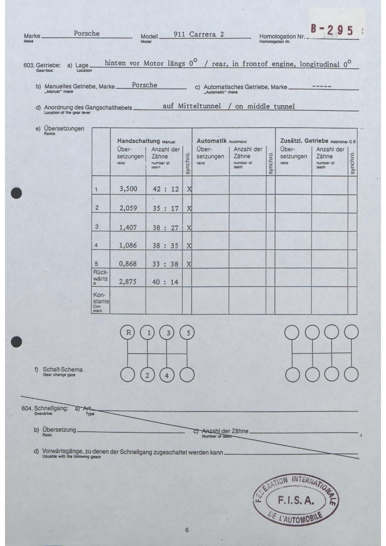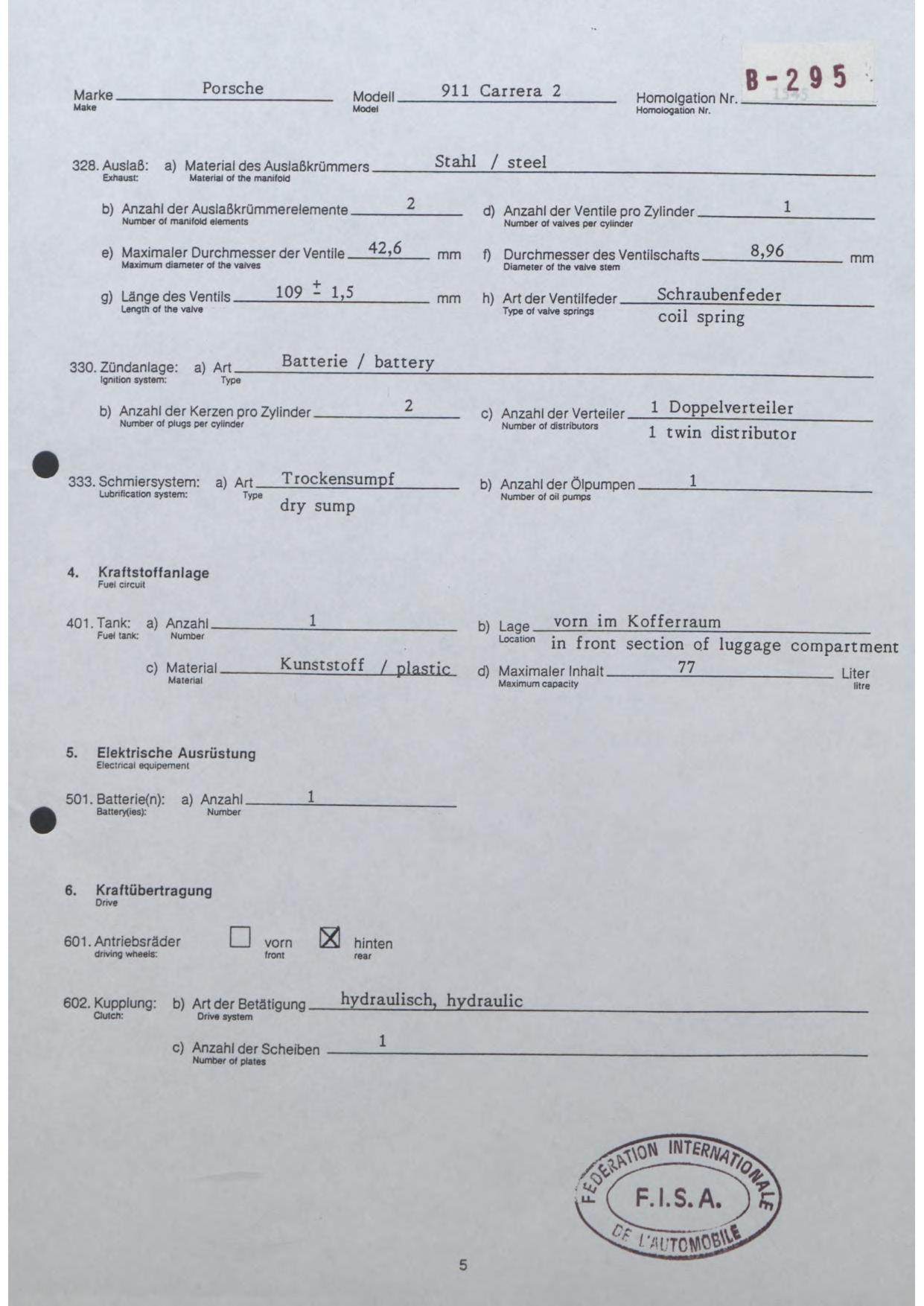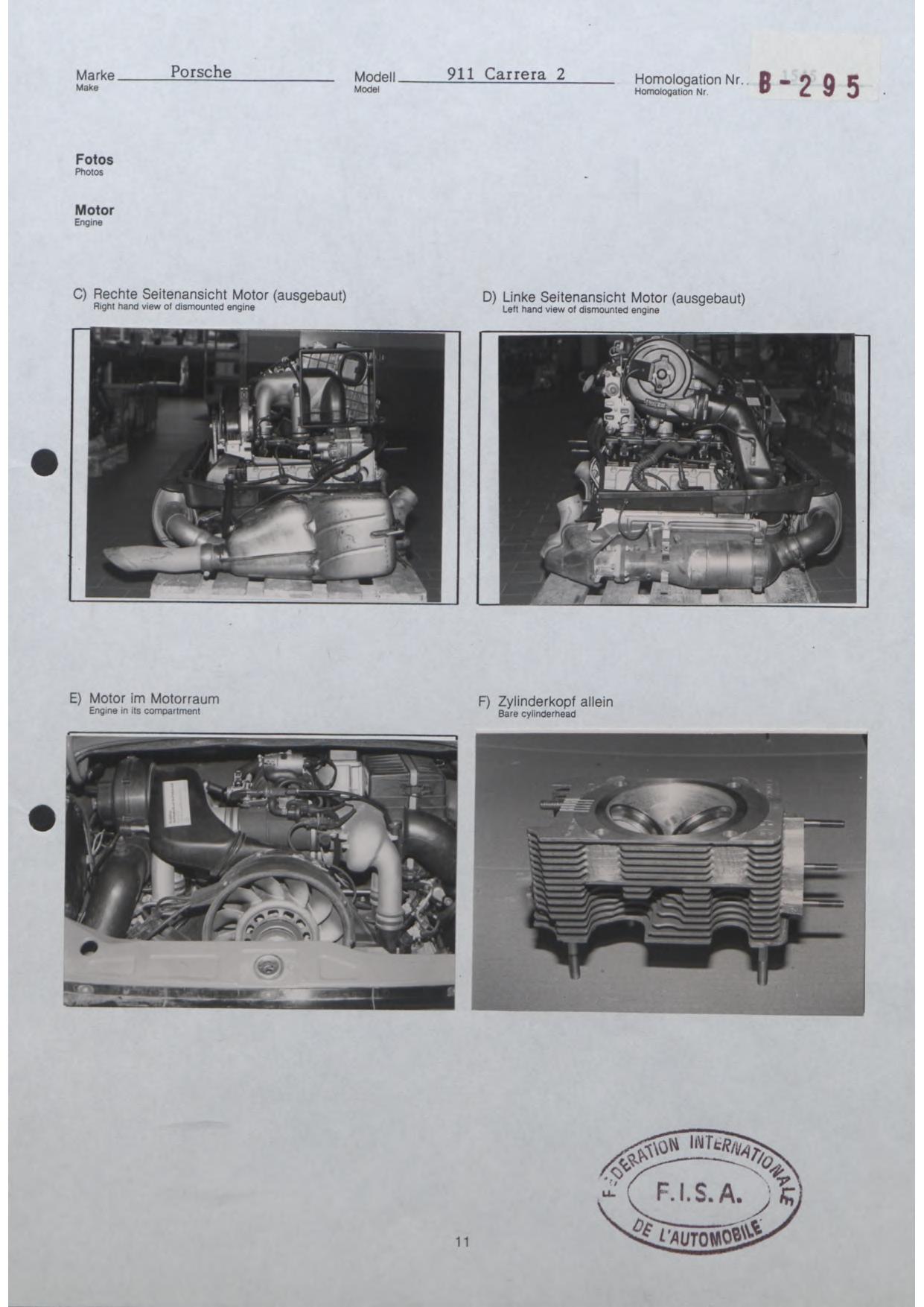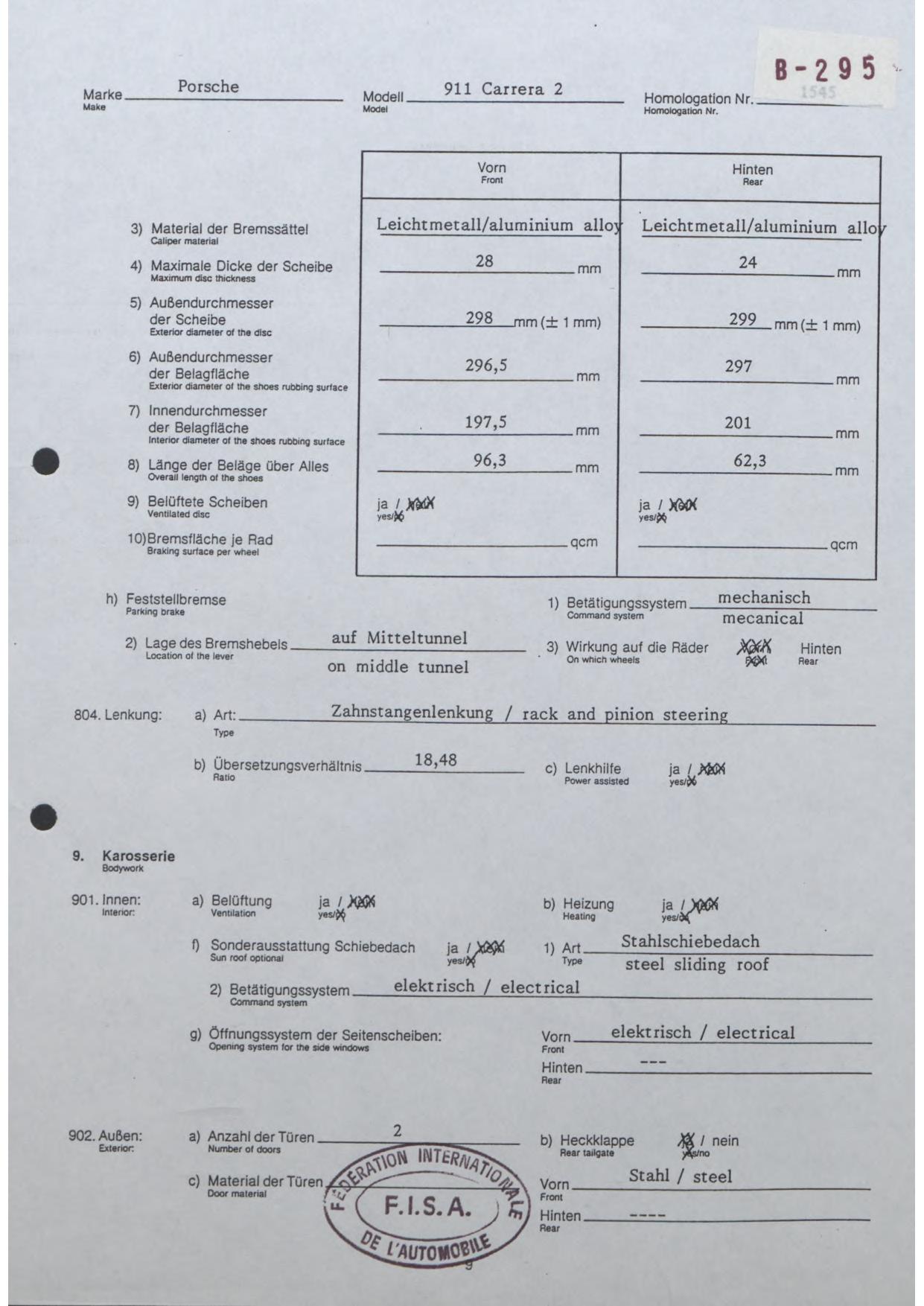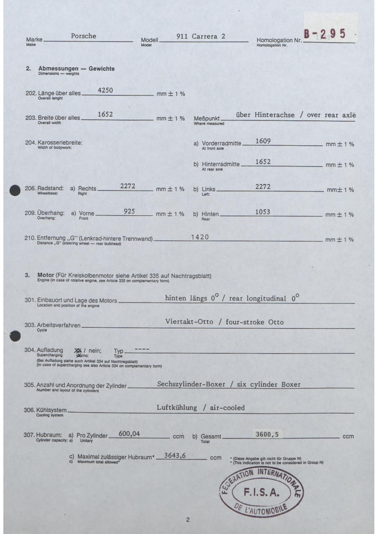 FISA Homologation Protocol for Porsche-964 Carrera 2, 1990