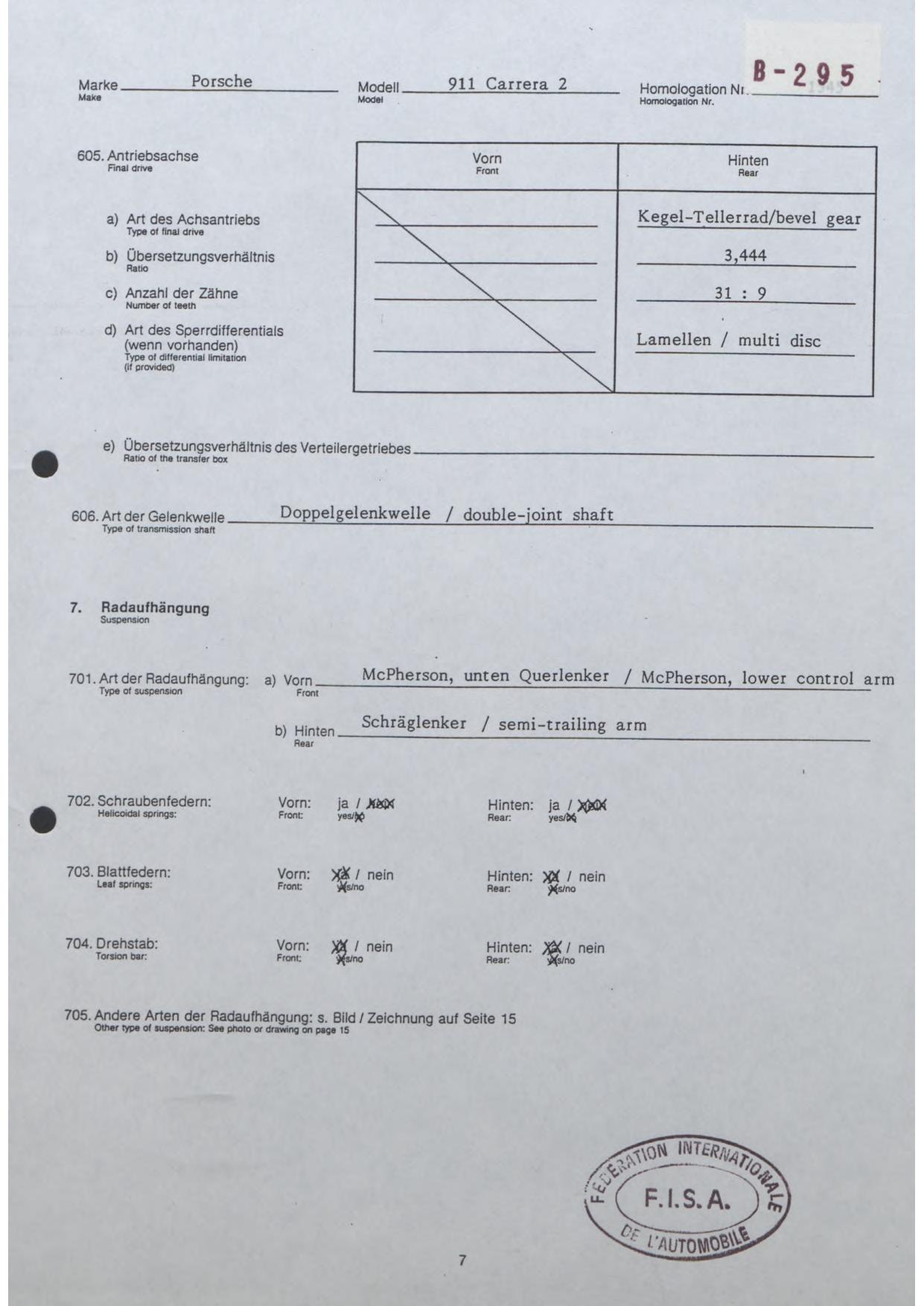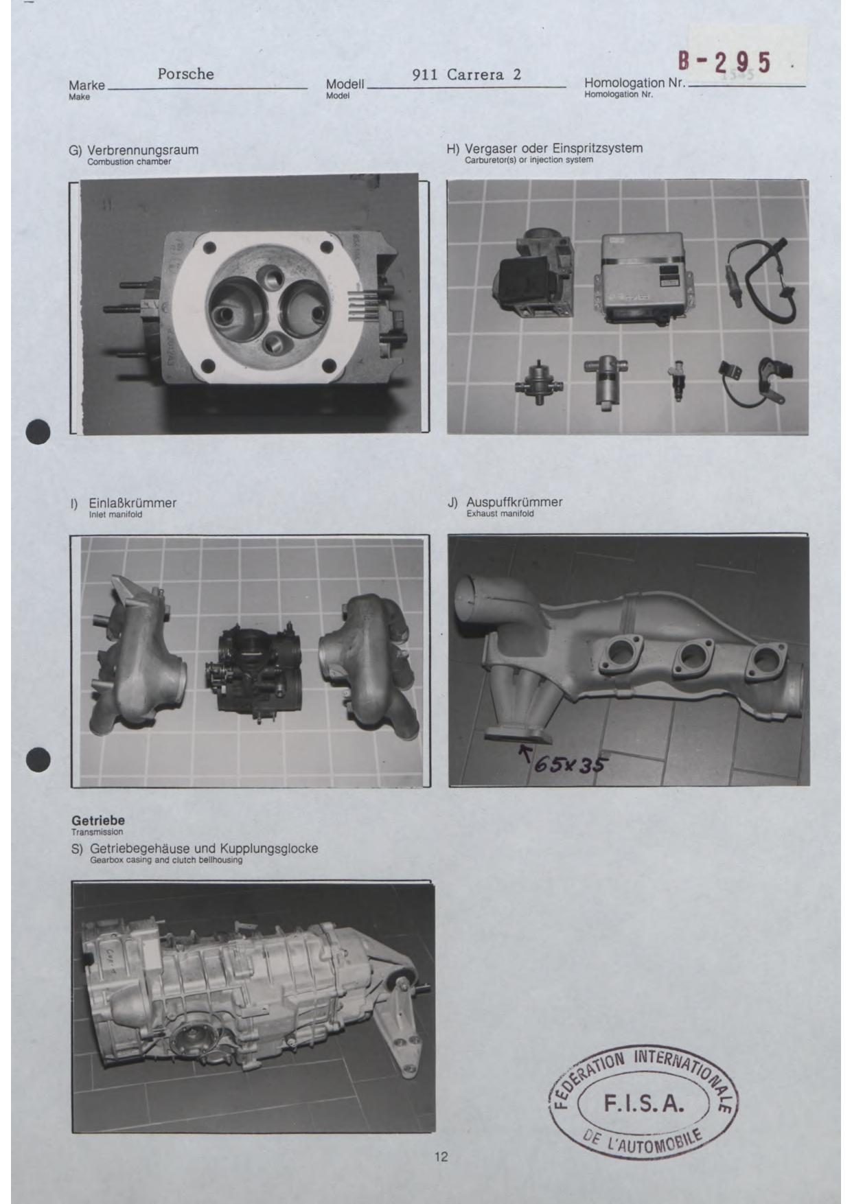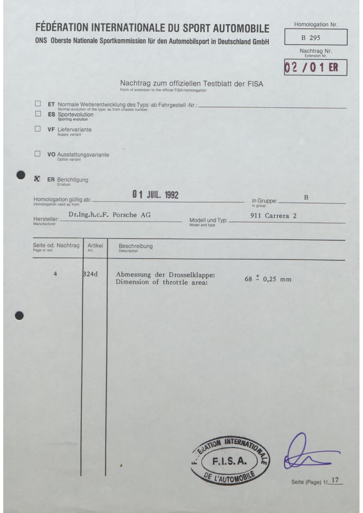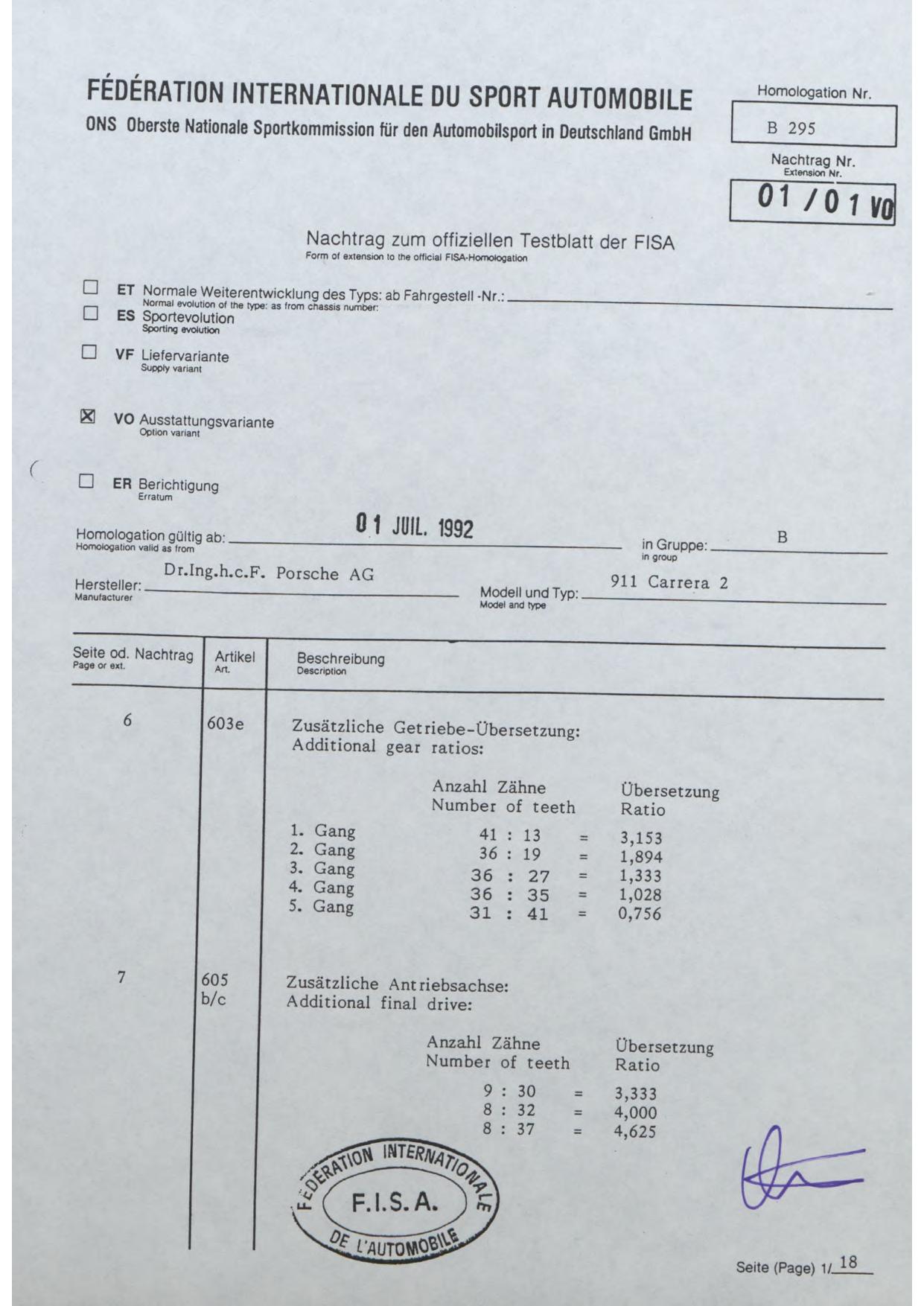 FISA Homologation Protocol for Porsche-964 Carrera 2, 1990