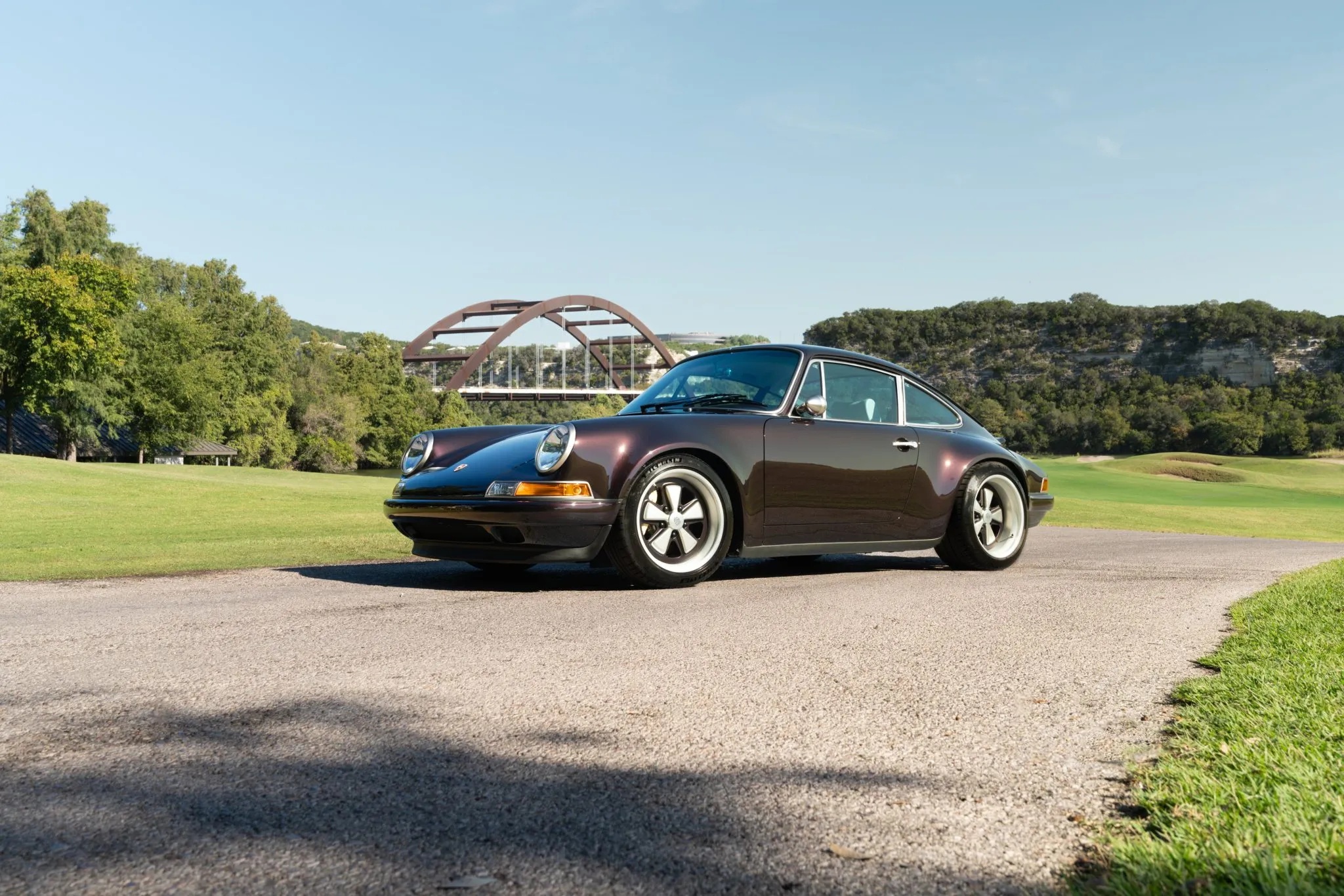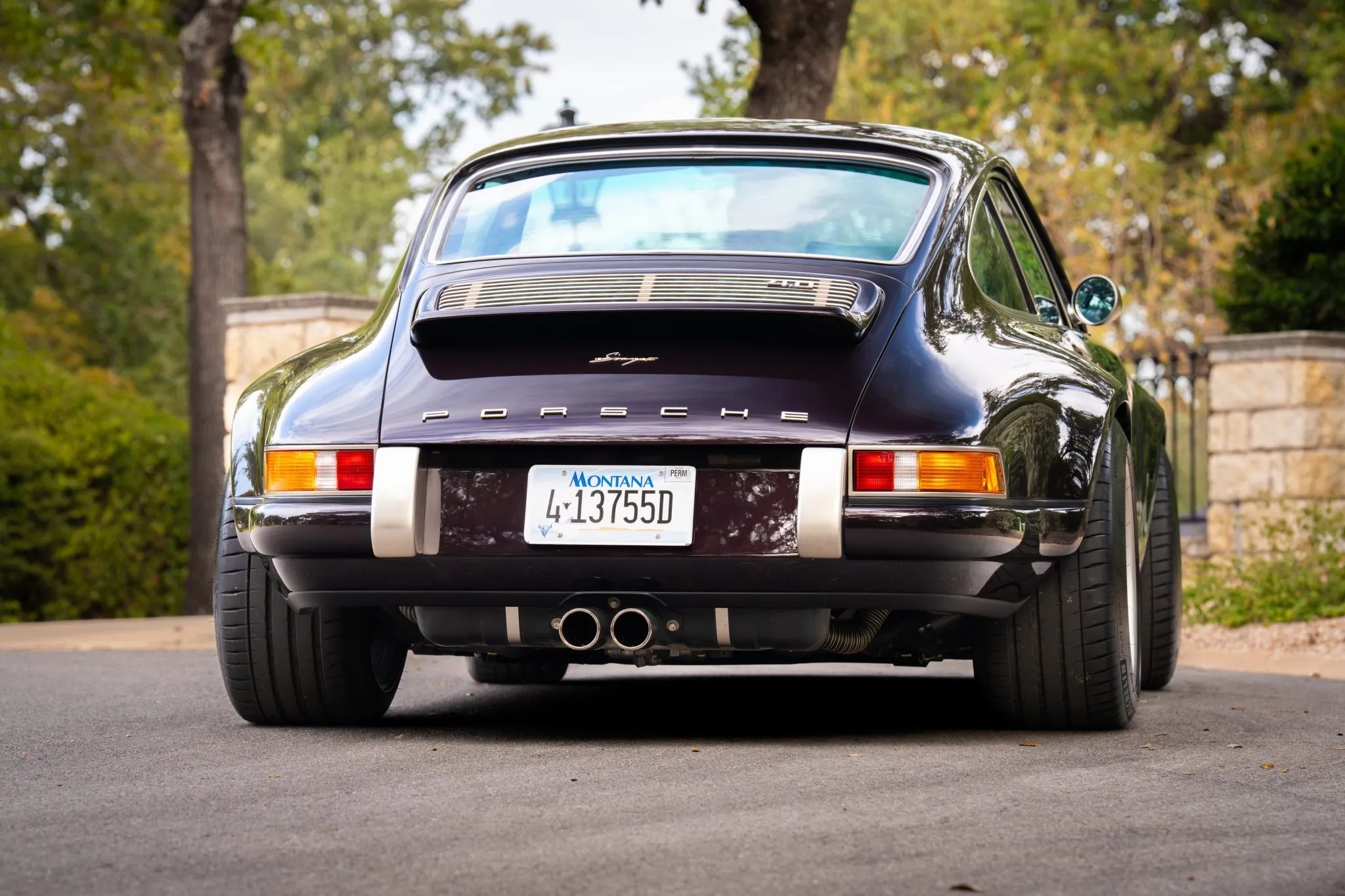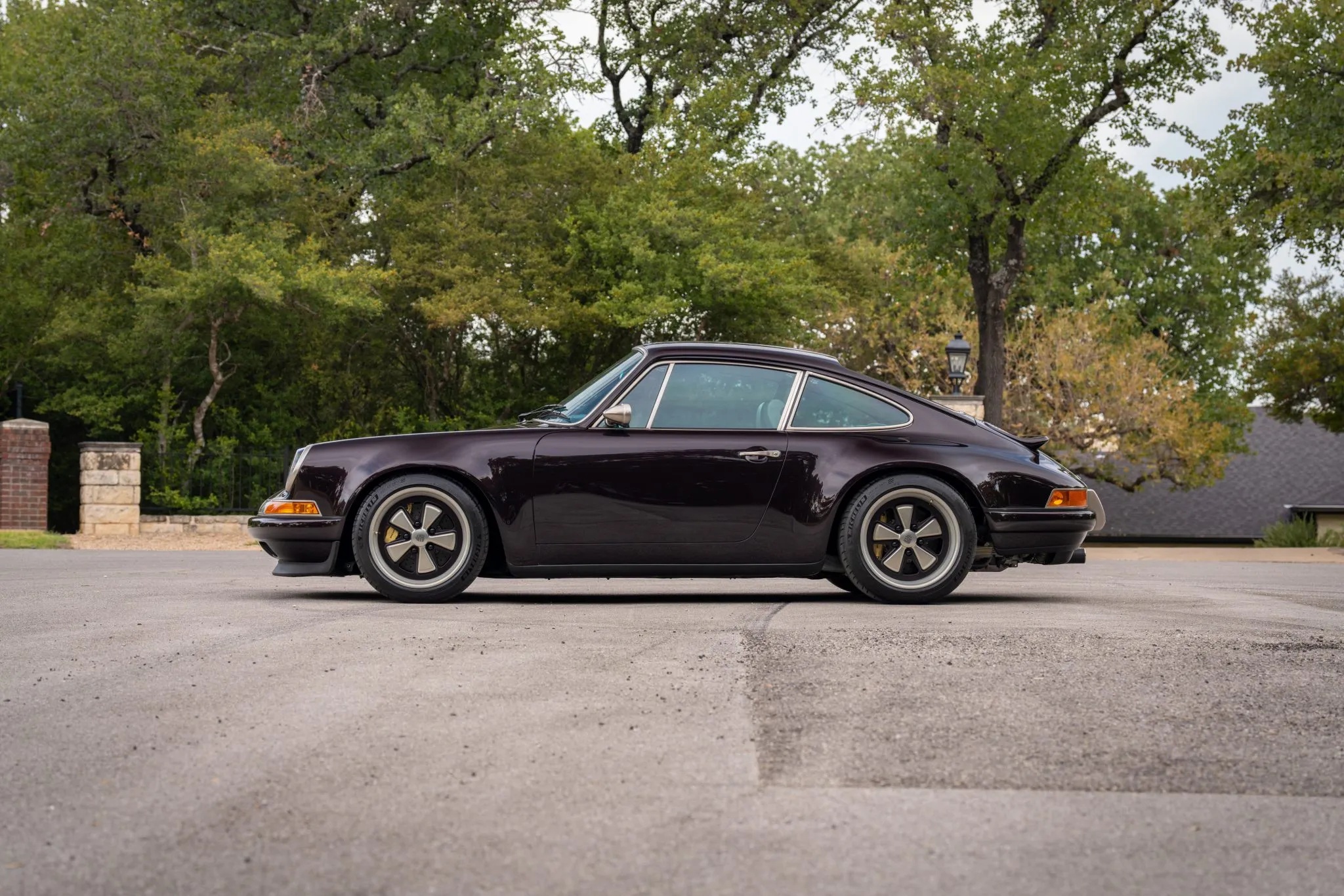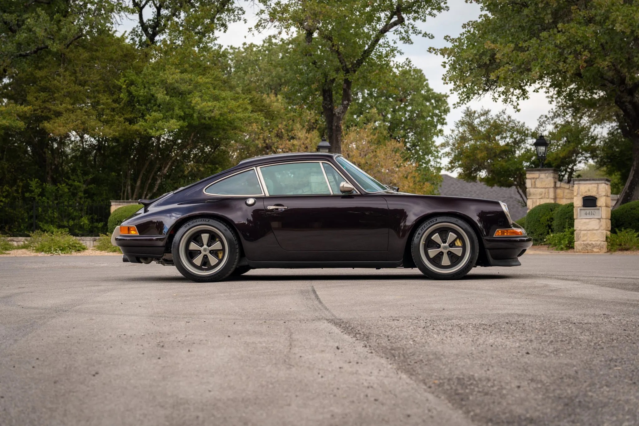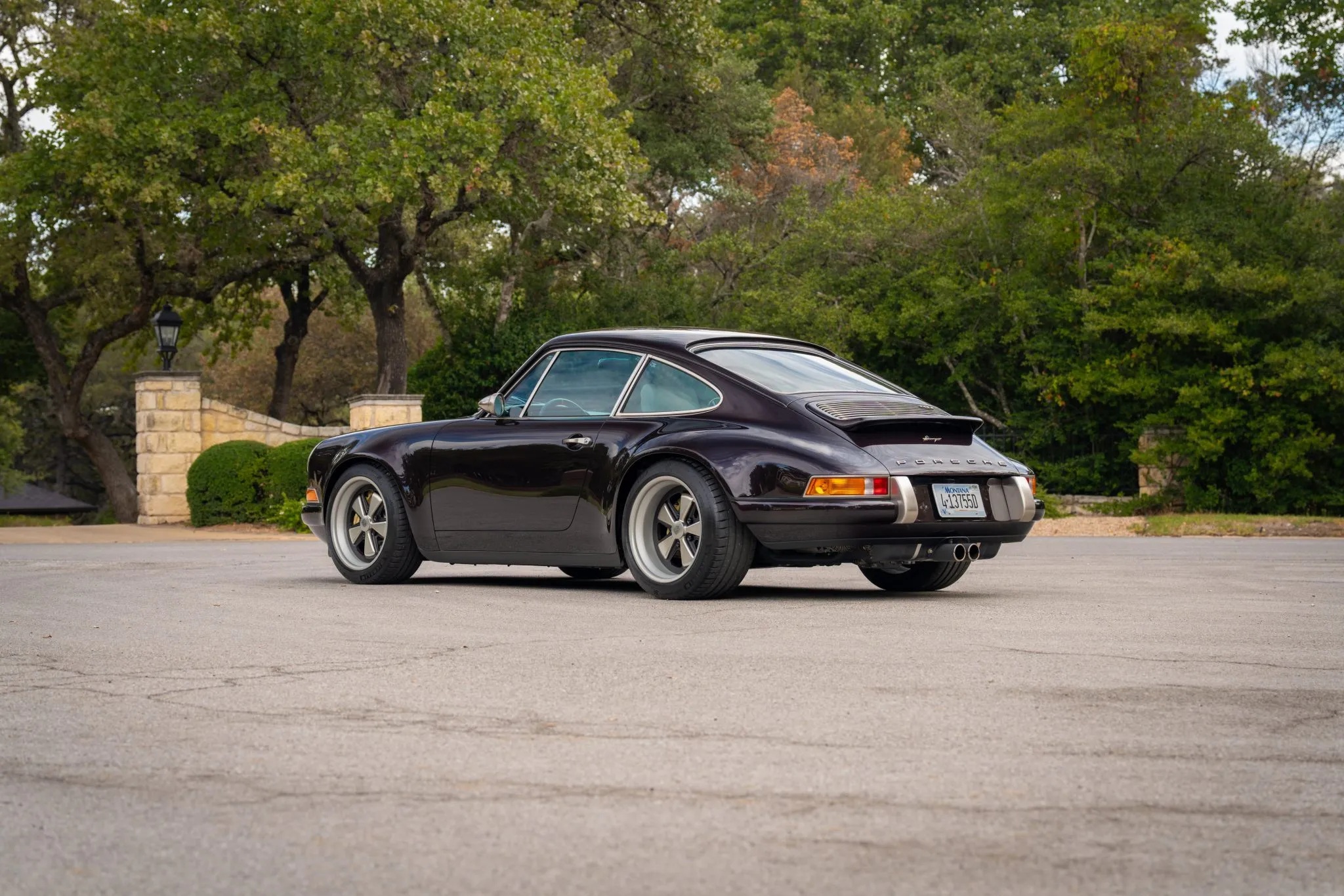 Finished in paint-to-sample Aubergine Metallic, it rides on Fuchs-style wheels with pastel yellow calipers and white Porsche script. It includes Singer’s larger steel Brembo brakes, Ohlins adjustable suspension, a carbon-fiber roof, and exposed center fuel and oil filler caps in tribute to 1972 models.