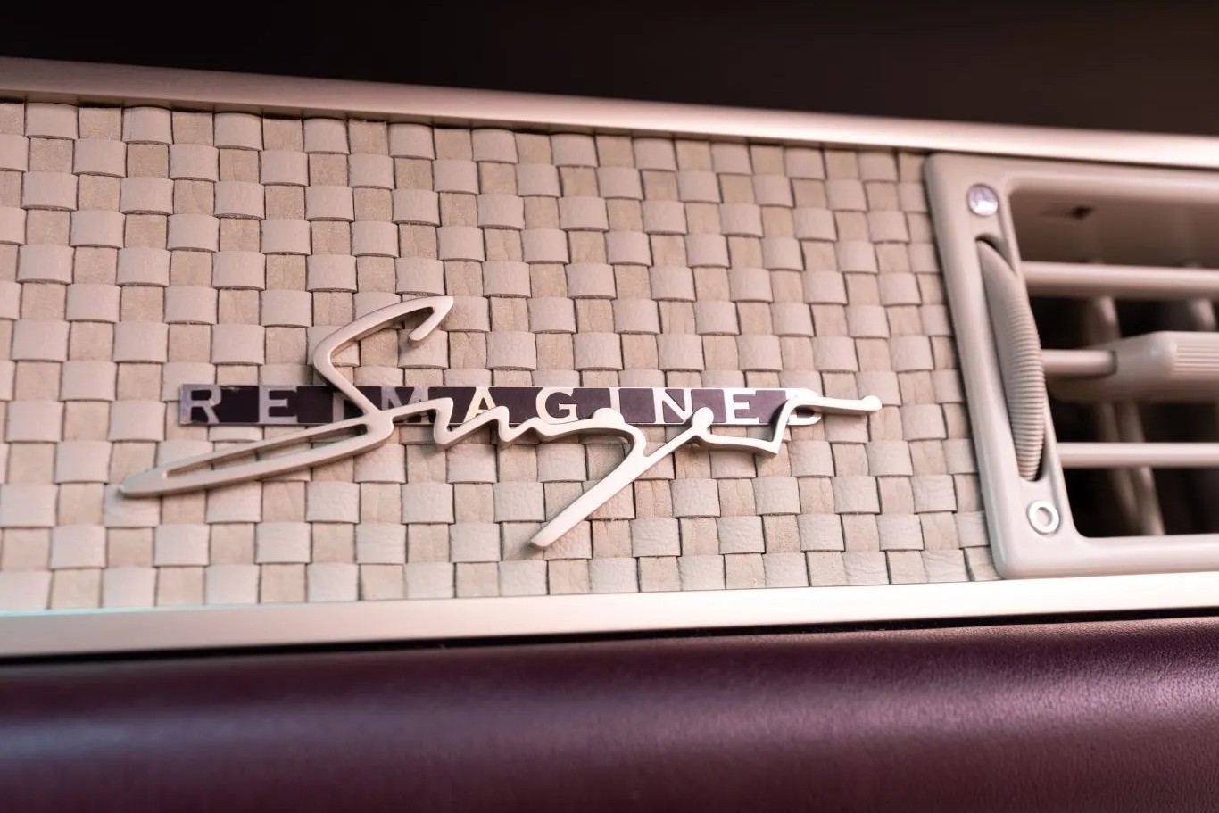 The interior is trimmed in Platero leather with leather-weave inserts, Bramante seatback accents, woven-leather dash and panels, and a gray Alcantara headliner. Aubergine Metallic carries onto the tunnel, sills, and rear surfaces. Additional details include square-weave mats, drilled pedals, and Singer’s signature dash badge.