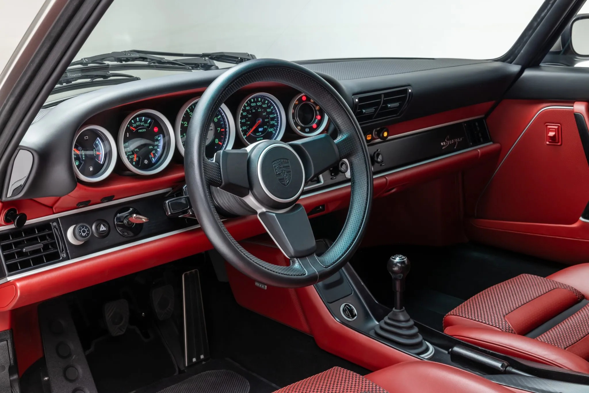 Inside, the cabin blends heritage cues with modern luxury. Photon Red upholstery, inspired by classic 930 “tombstone” seats, is paired with black wood accents, velour carpeting, and satin aluminum trim. Features include air conditioning, power windows, wireless charging, and a premium audio system with navigation.