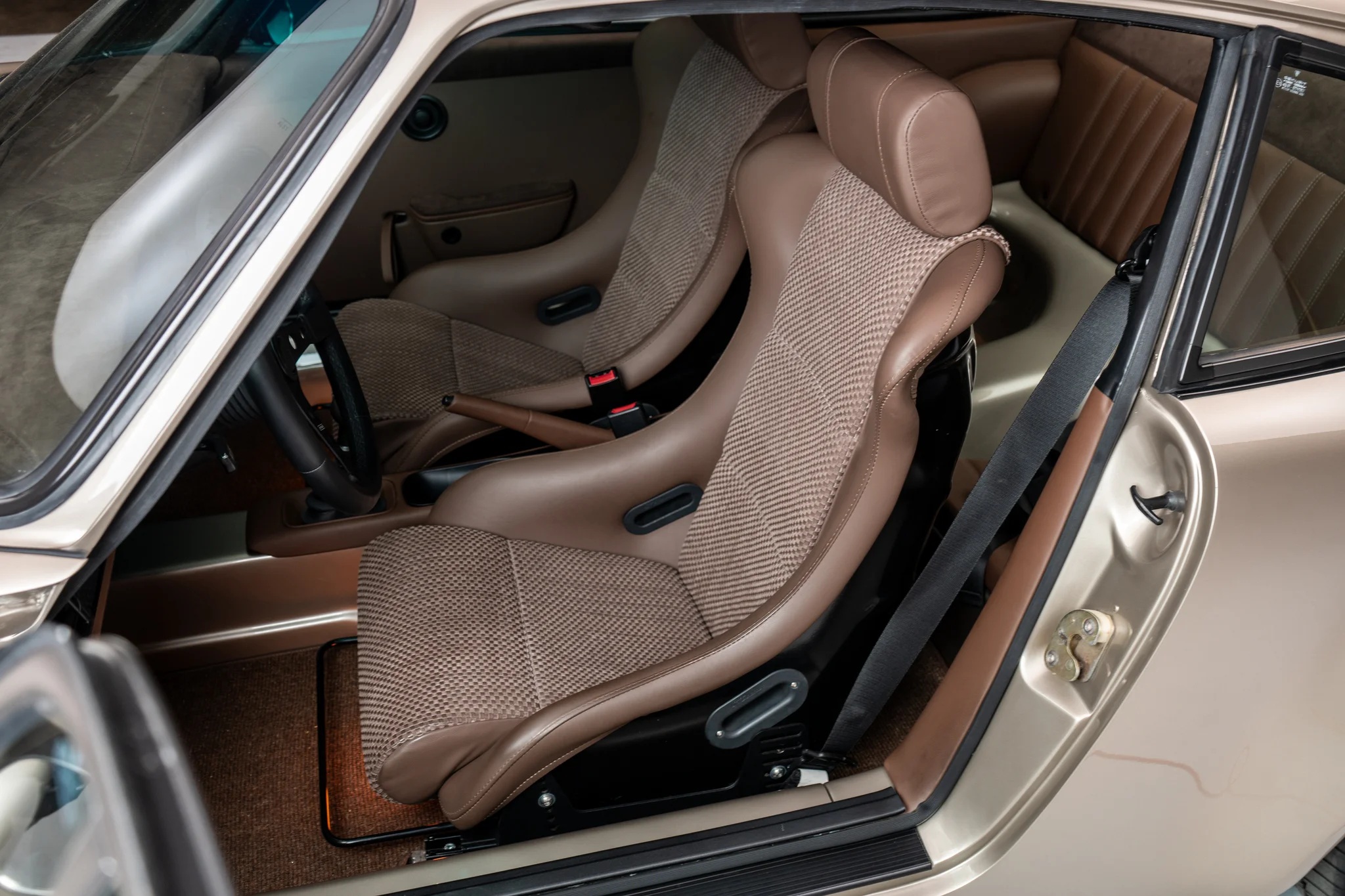 Inside, the cabin has been fully restored in brown leather and Alcantara with extensive insulation. Carbon fiber tubs match the exterior, lined with brown wool carpeting. RS-style GTS Classics sport seats, basketweave inserts, drilled aluminum pedals, billet shift knob, and a MOMO Prototipo steering wheel complement backdated gauges and a custom central tachometer. Functional A/C, power windows, and pre-wiring for audio complete the cabin, while the front luggage area mirrors the interior’s finish.