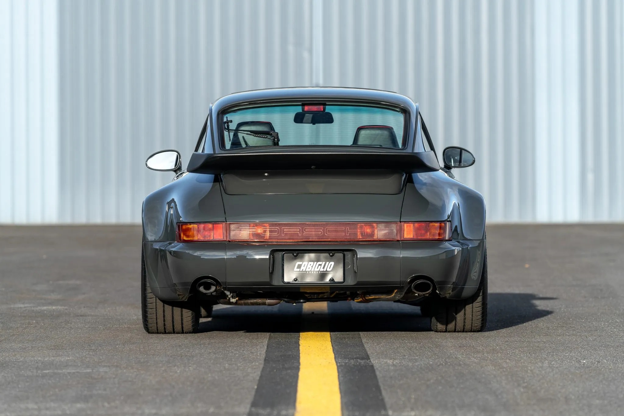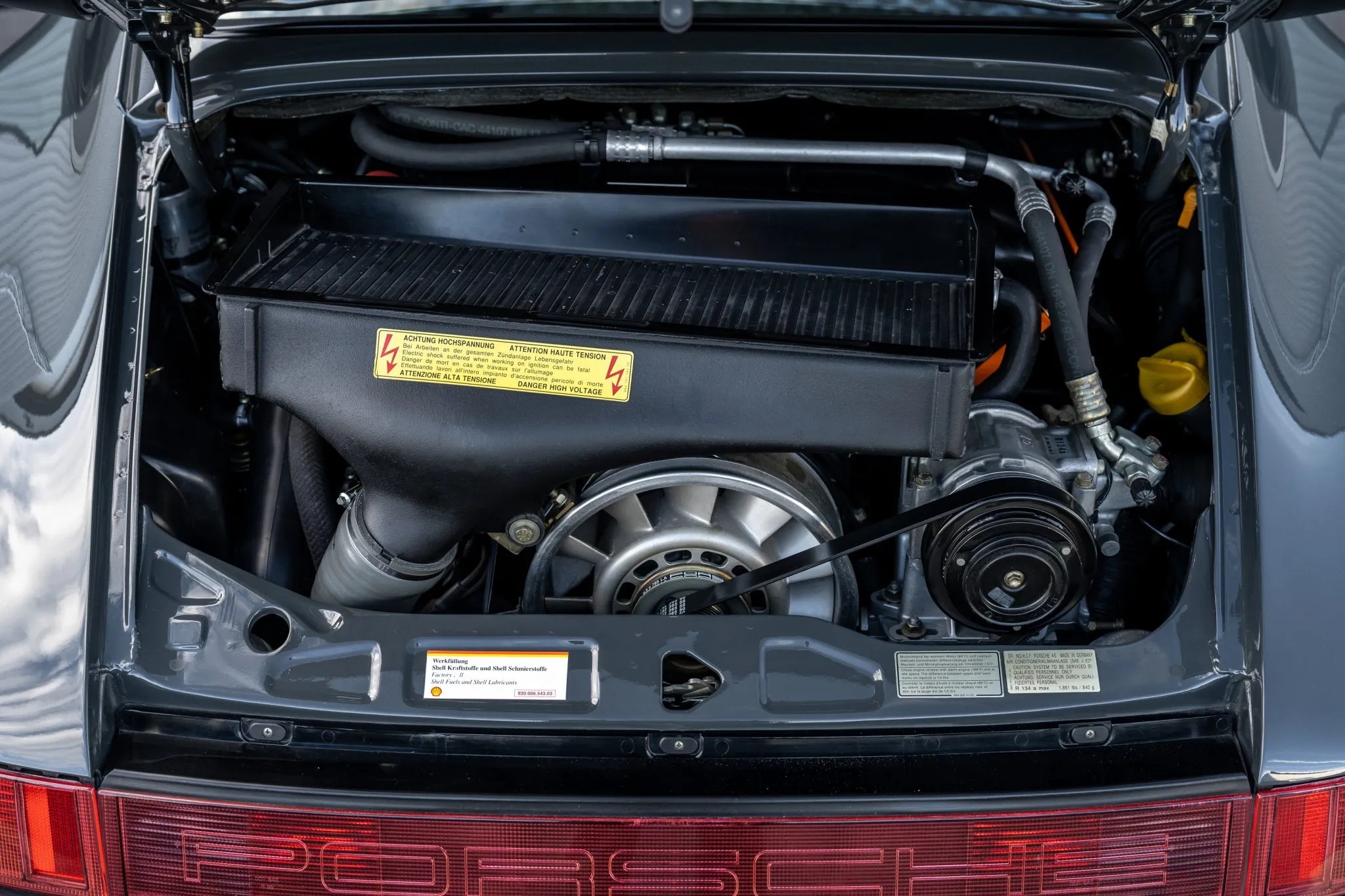 The 3.6-liter flat-six carries extensive performance upgrades. It features high-lift camshafts, a professional twin-plug conversion, an upgraded intercooler, and an auxiliary injection system that preserves the CIS fuel delivery setup. A custom turbocharger, custom exhaust, and painted valve covers and engine fan round out the enthusiast-oriented powertrain enhancements.