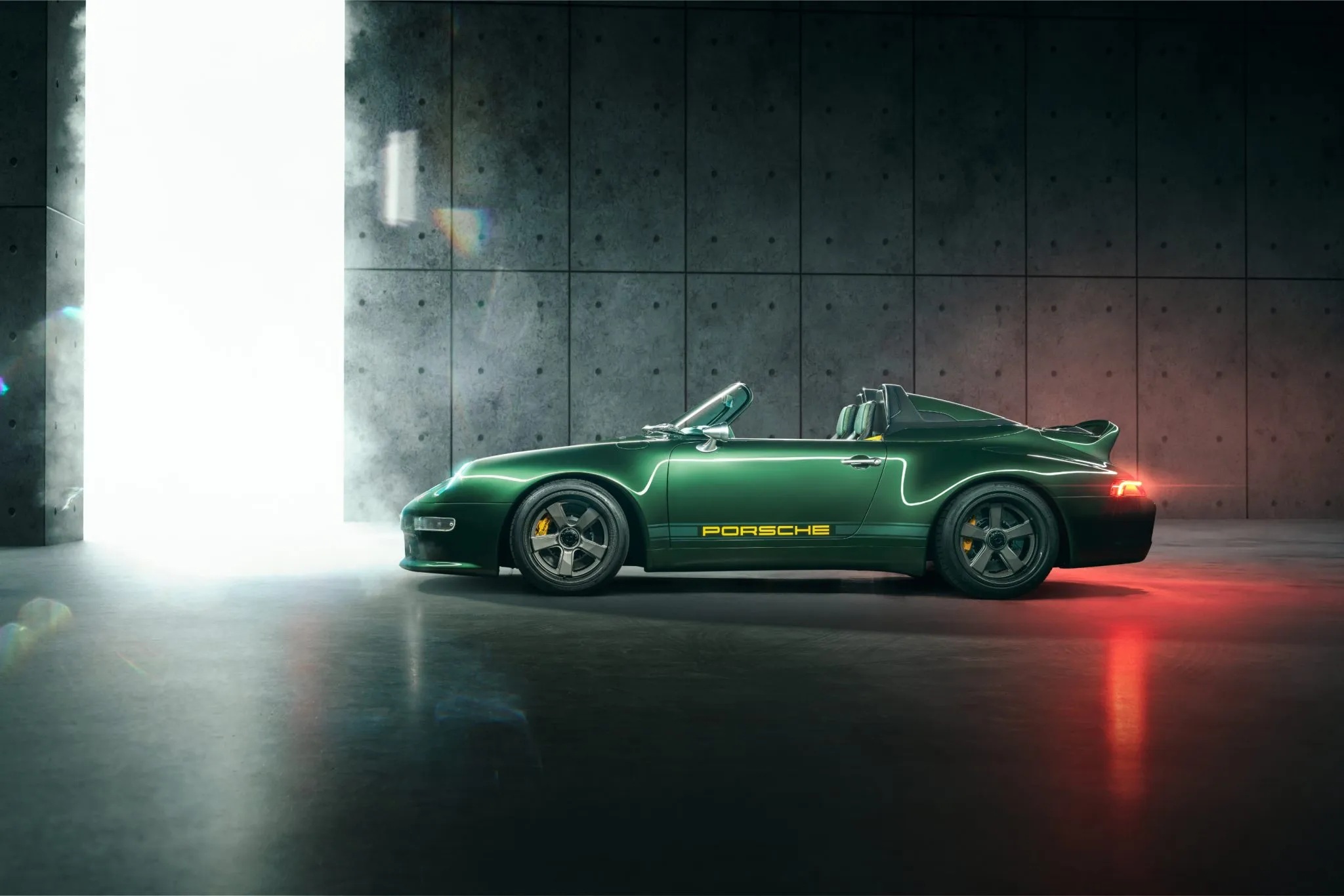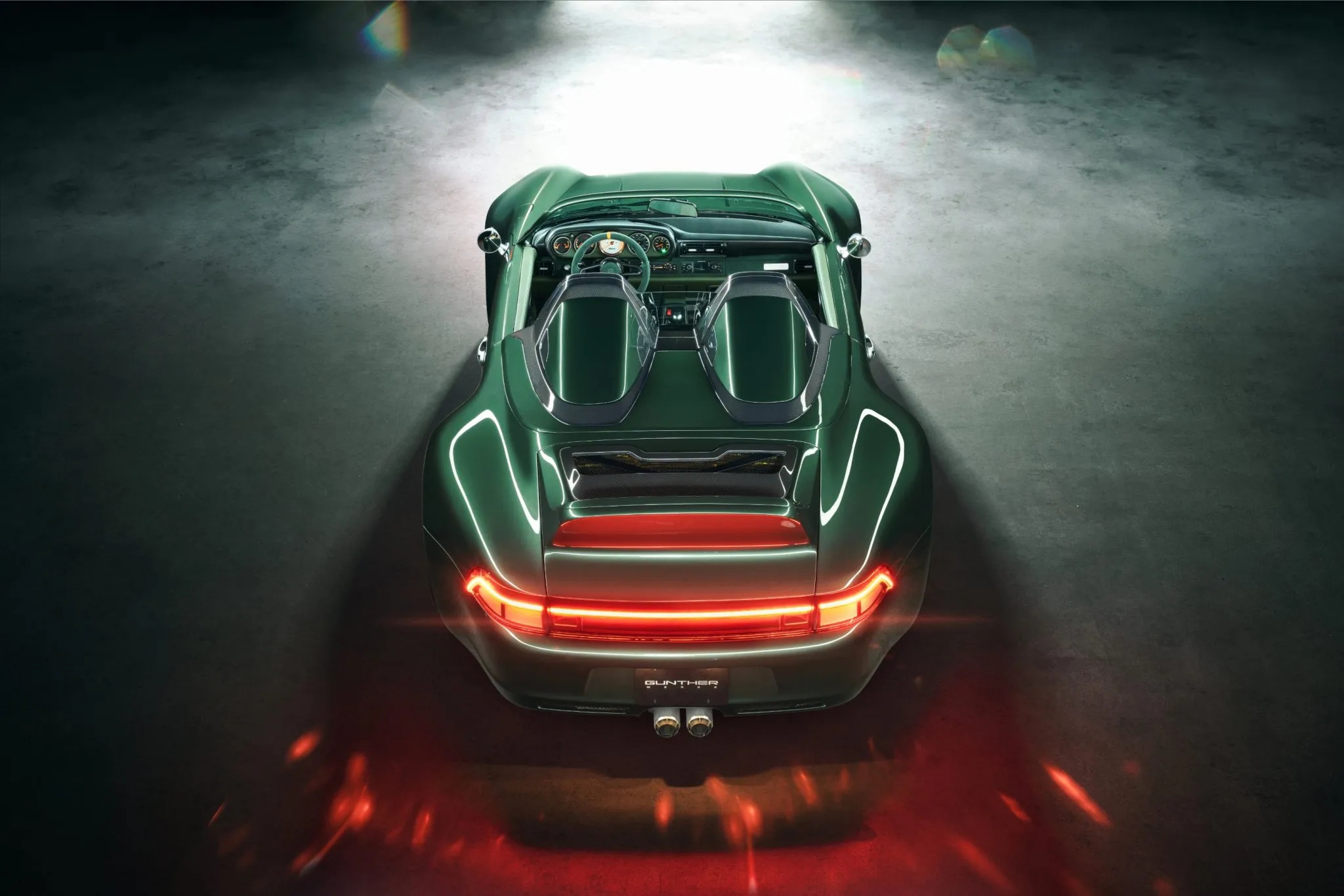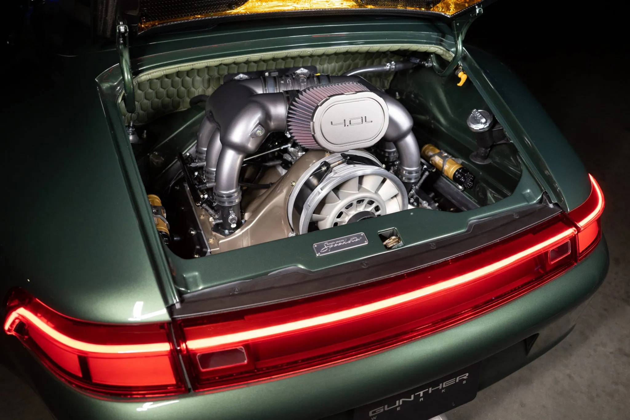 Based in Huntington Beach, California, Gunther Werks is known for transforming air-cooled Porsche 911s into what the brand’s 993 might resemble had its development continued into the modern era. Carbon fiber is extensively integrated into both the chassis and body structure, complemented by a tailored suspension system featuring DGR computer-controlled active coilovers, revised suspension geometry, stiffer anti-roll bars, lightweight uprights, and a hydraulic front-lift setup.