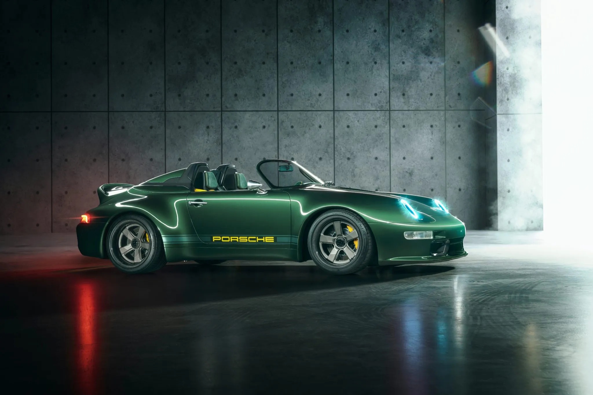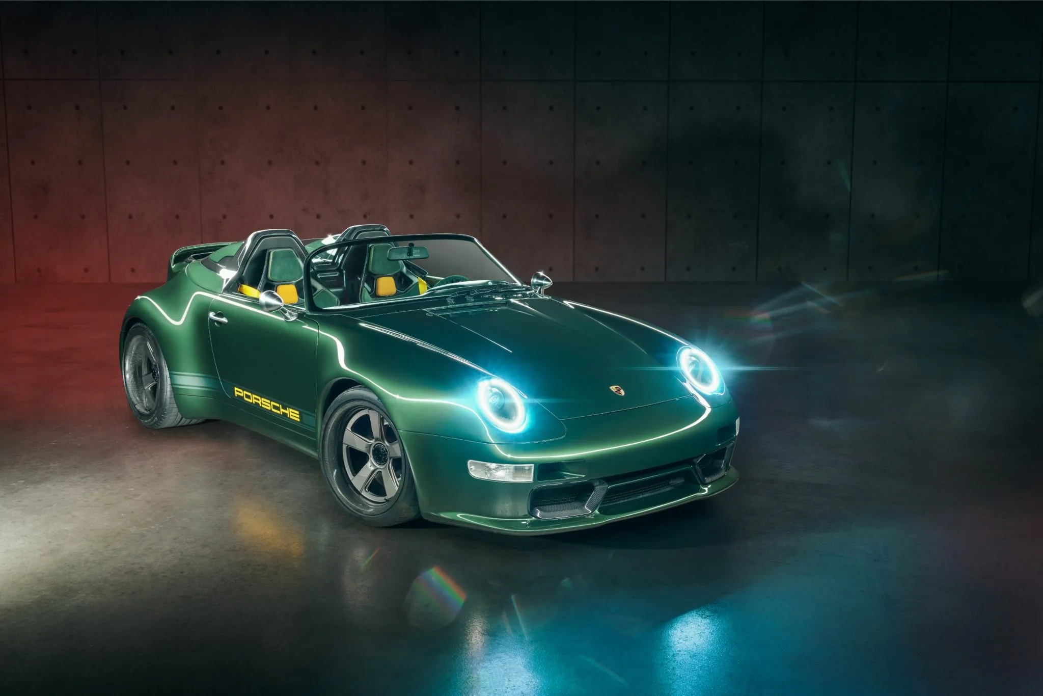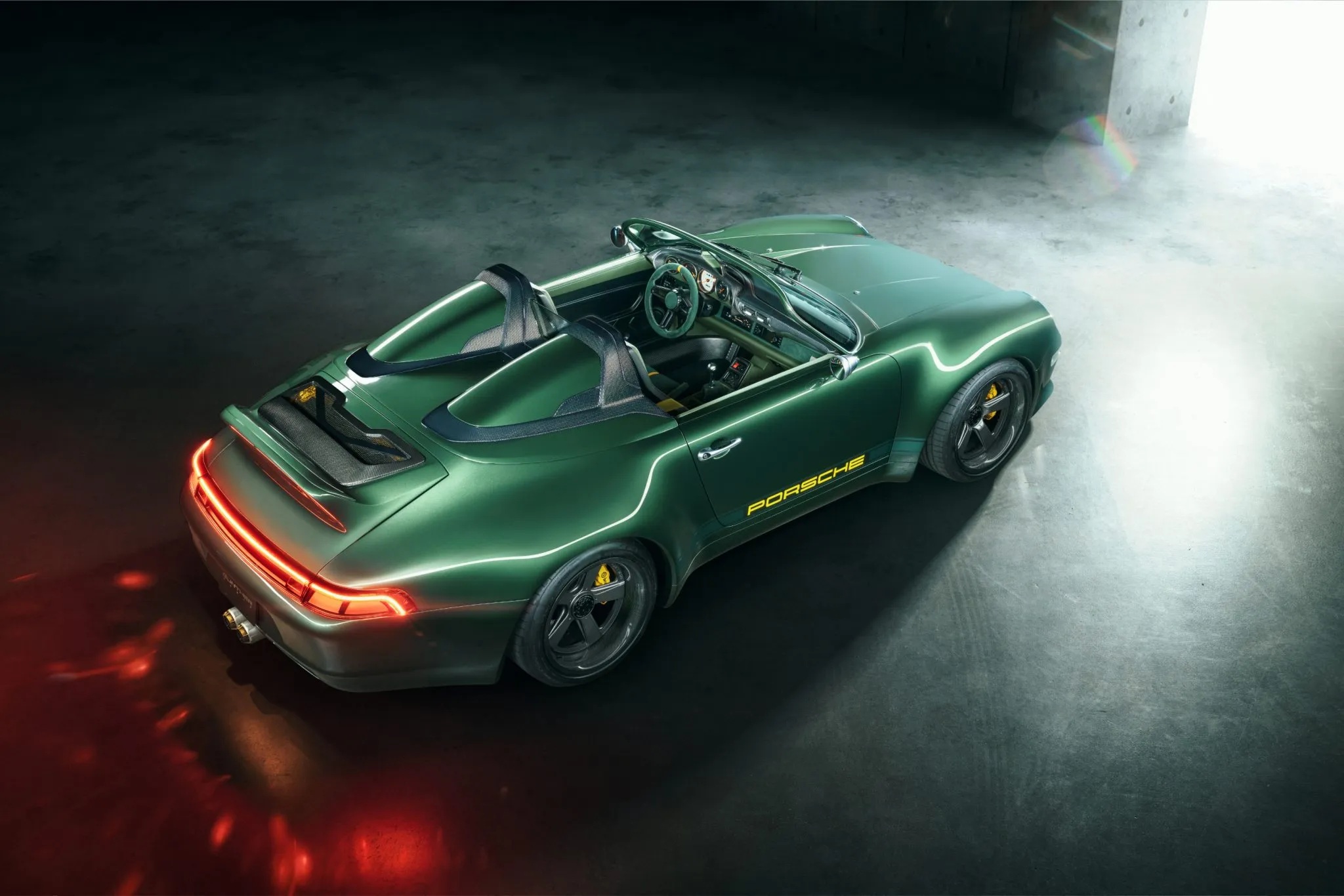 Exterior details include a carbon windshield frame, billet nickel mirrors and door handles, dual roll hoops, a carbon ducktail, bi-LED headlights, LED taillights, mesh grilles, yellow Porsche graphics, yellow Brembo calipers, and 18-inch two-piece forged magnesium wheels with titanium hardware.
