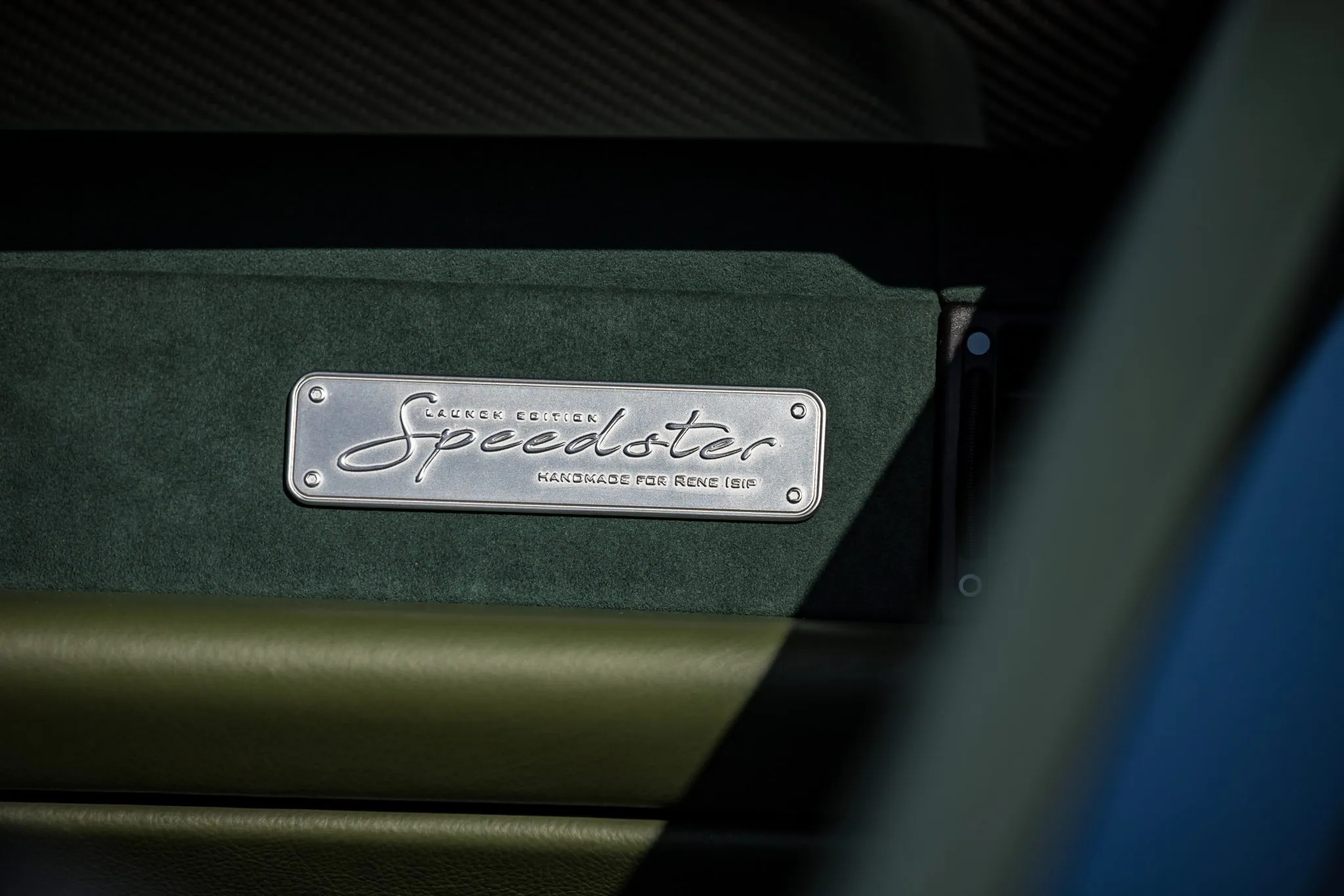 Inside, the tailored two-seat cabin features green leather on the door caps, lower dashboard, and center console, while the carbon-fiber bucket seats are upholstered in multi-tone green leather and Alcantara with yellow leather accents. The rear bulkhead wears exposed carbon fiber with “Launch Edition” branding, echoed by a matching badge on the dashboard, while the rear seats have been removed entirely.