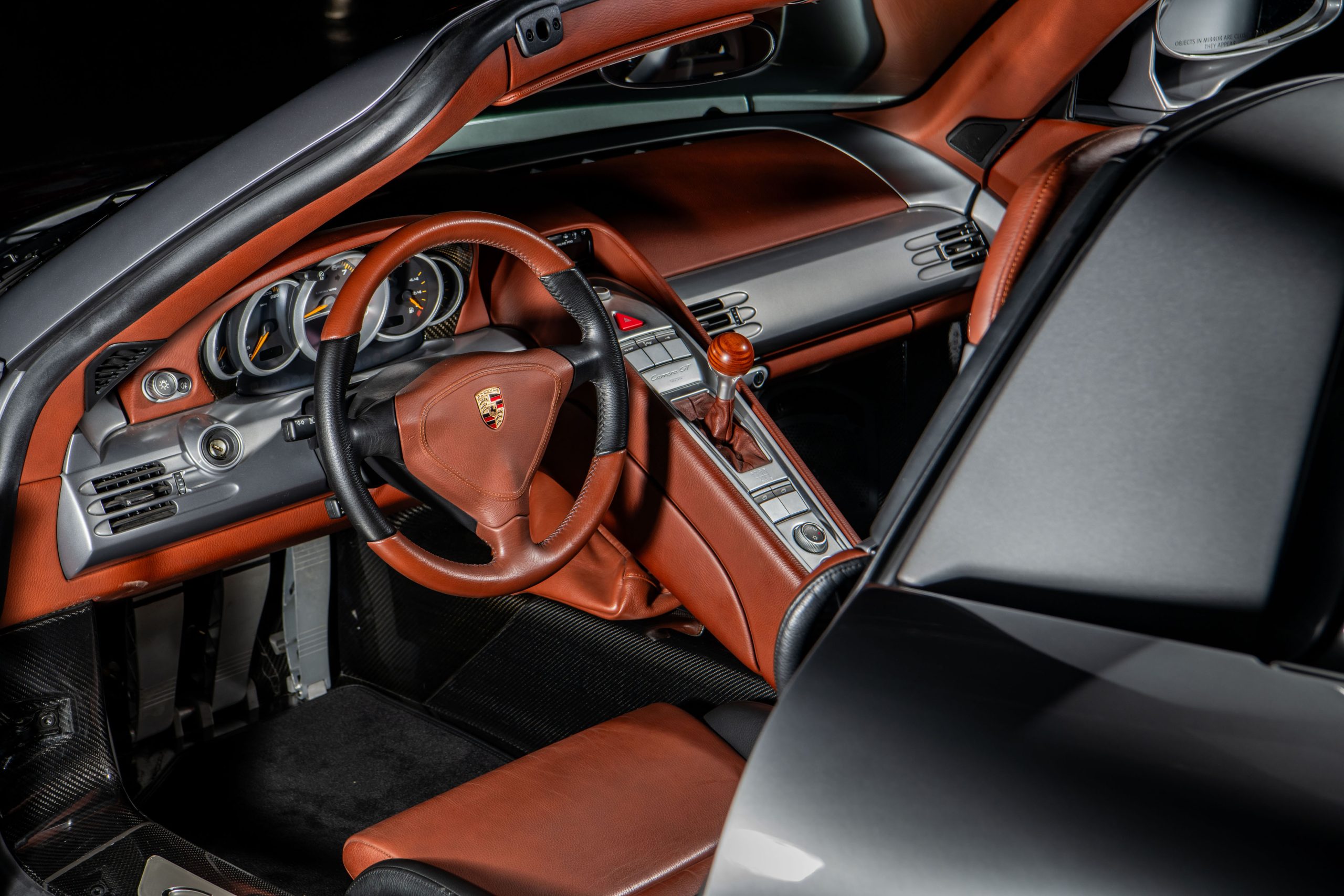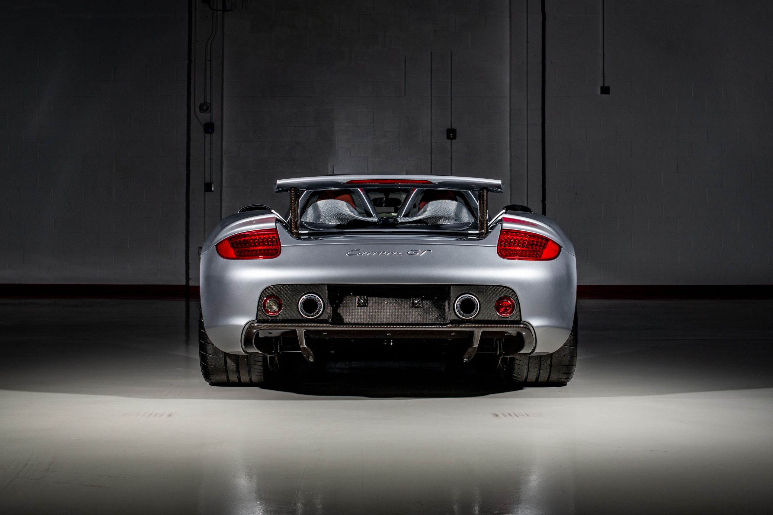 The Carrera GT’s engineering is race-derived, featuring a carbon-fiber monocoque and safety cell, aluminum subframes, ceramic composite clutch and brakes, and carbon-reinforced mounts. Forged magnesium wheels and Porsche Ceramic Composite Brakes complement a pushrod suspension system and an automatically deploying rear wing.