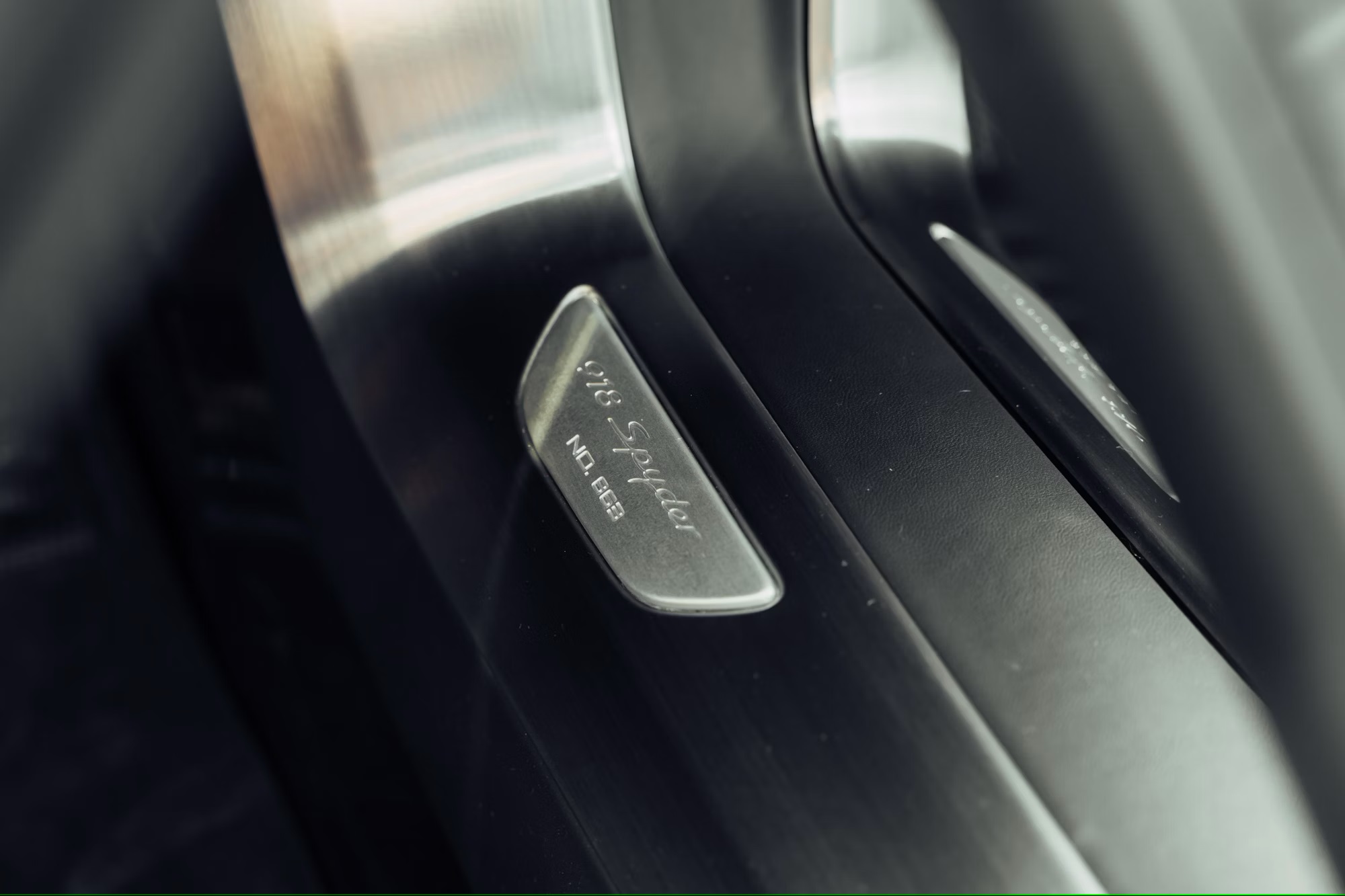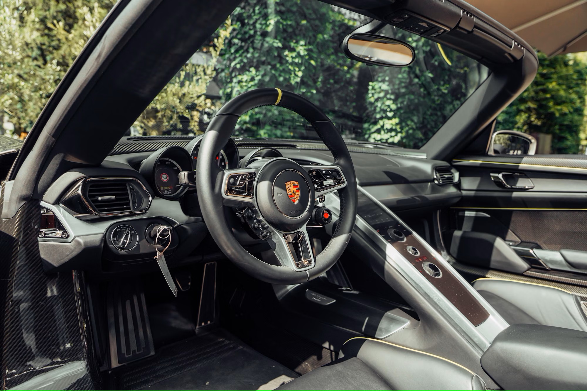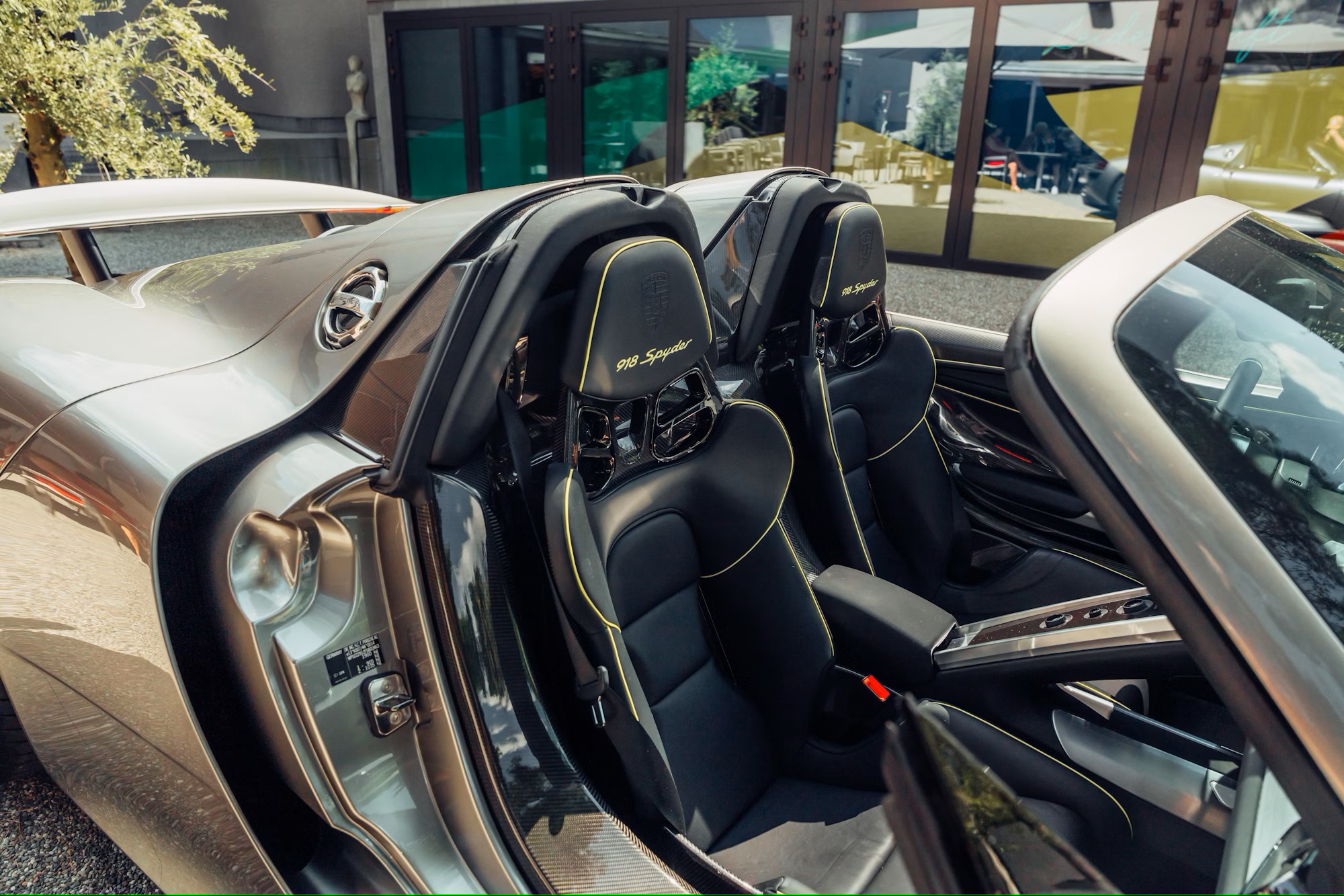 This particular 2014 Porsche 918 Spyder, No. 863 of 918 produced, is finished in Liquid Metal Silver with a black leather-trimmed interior featuring embossed headrests, yellow piping, headrest embroidery, and extensive carbon-fiber inlays.