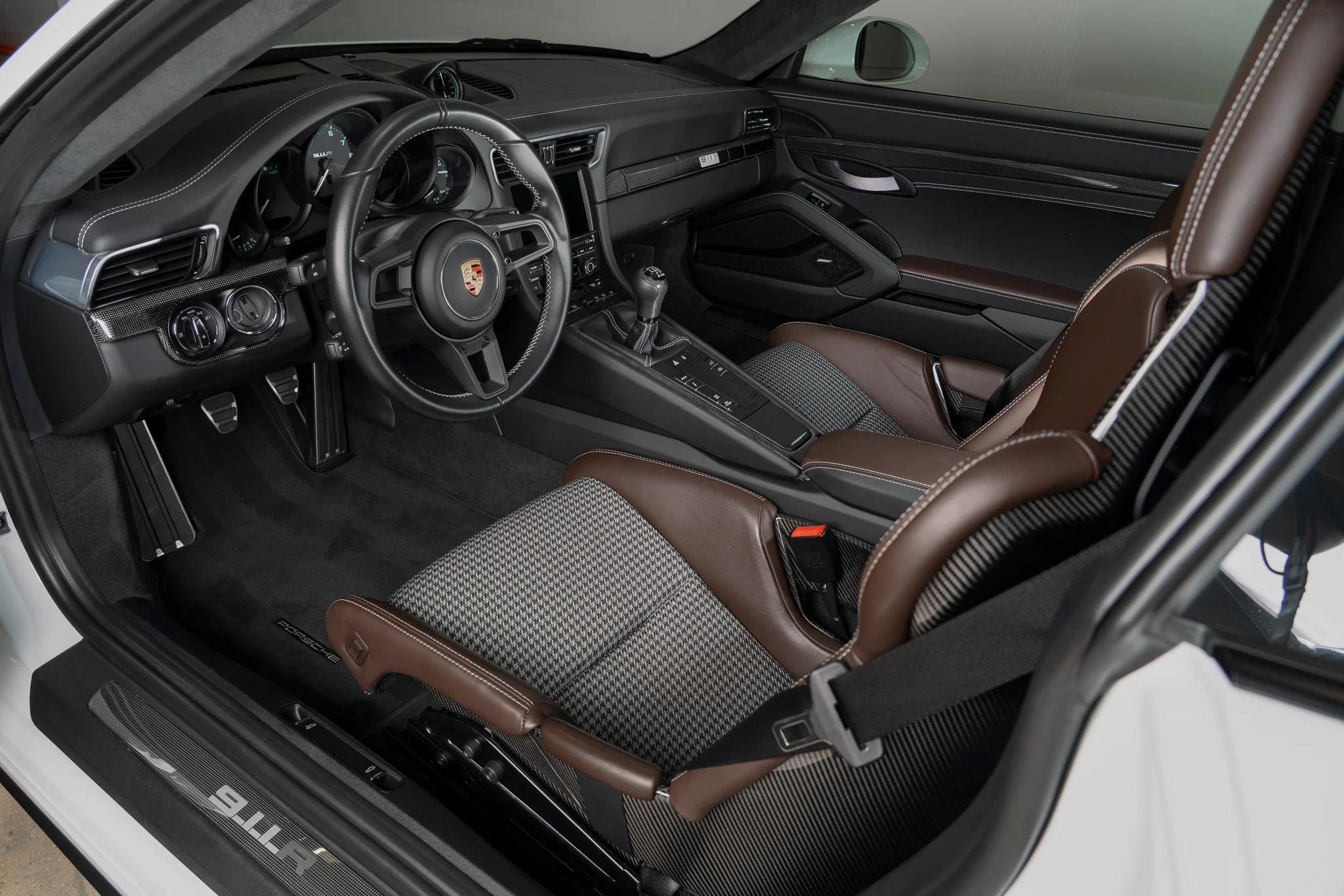 Inside, it features black leather with GT Silver stitching, pull straps, carbon trim, and Tarpan Brown bucket seats with Pepita inserts. Retro-style green-marked gauges, a 360mm Sport steering wheel, embroidered headrests, illuminated carbon sills, and a numbered badge highlight the cabin. Options include automatic climate control, Bose audio, PCM, and a passenger-footwell luggage net.