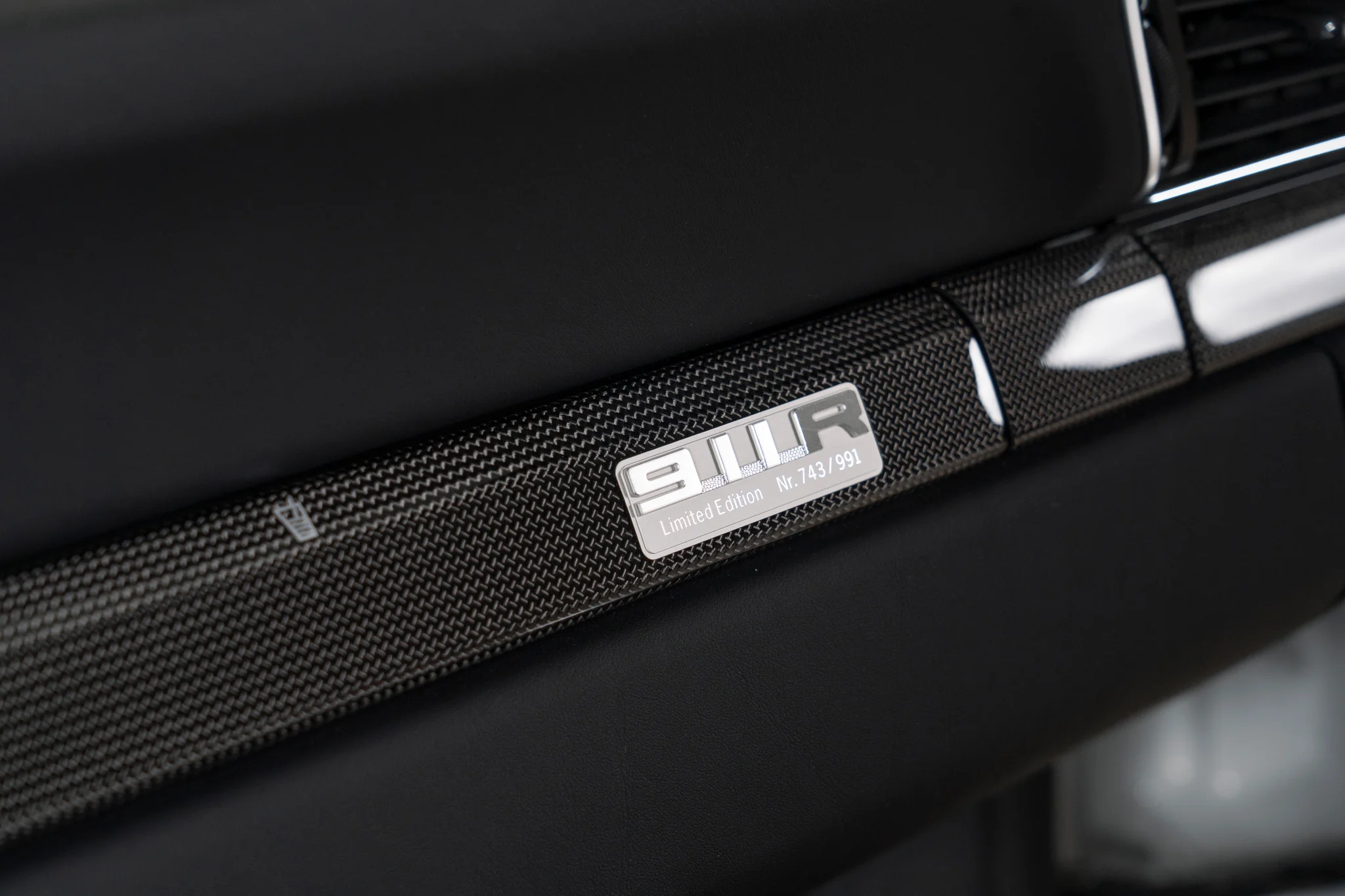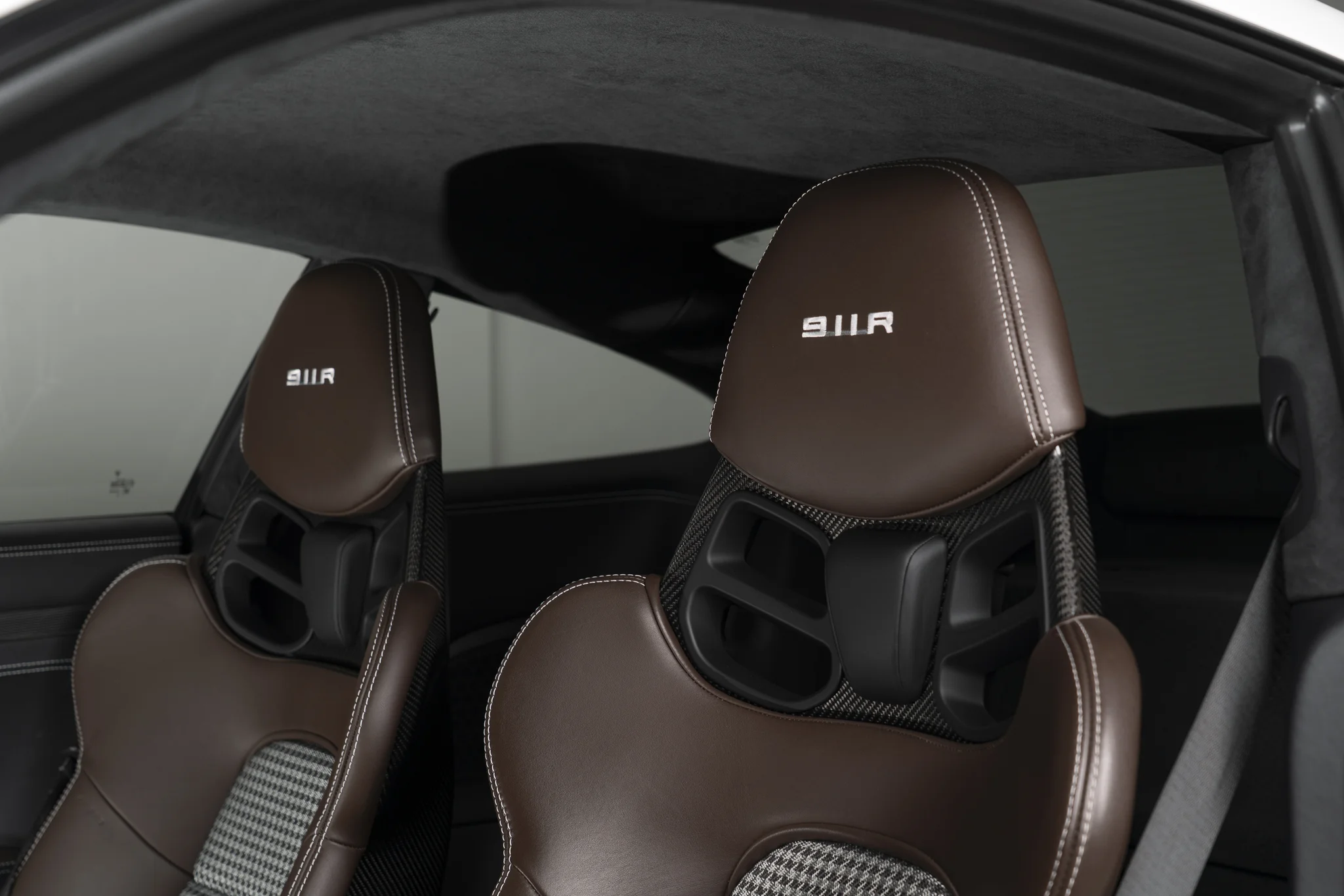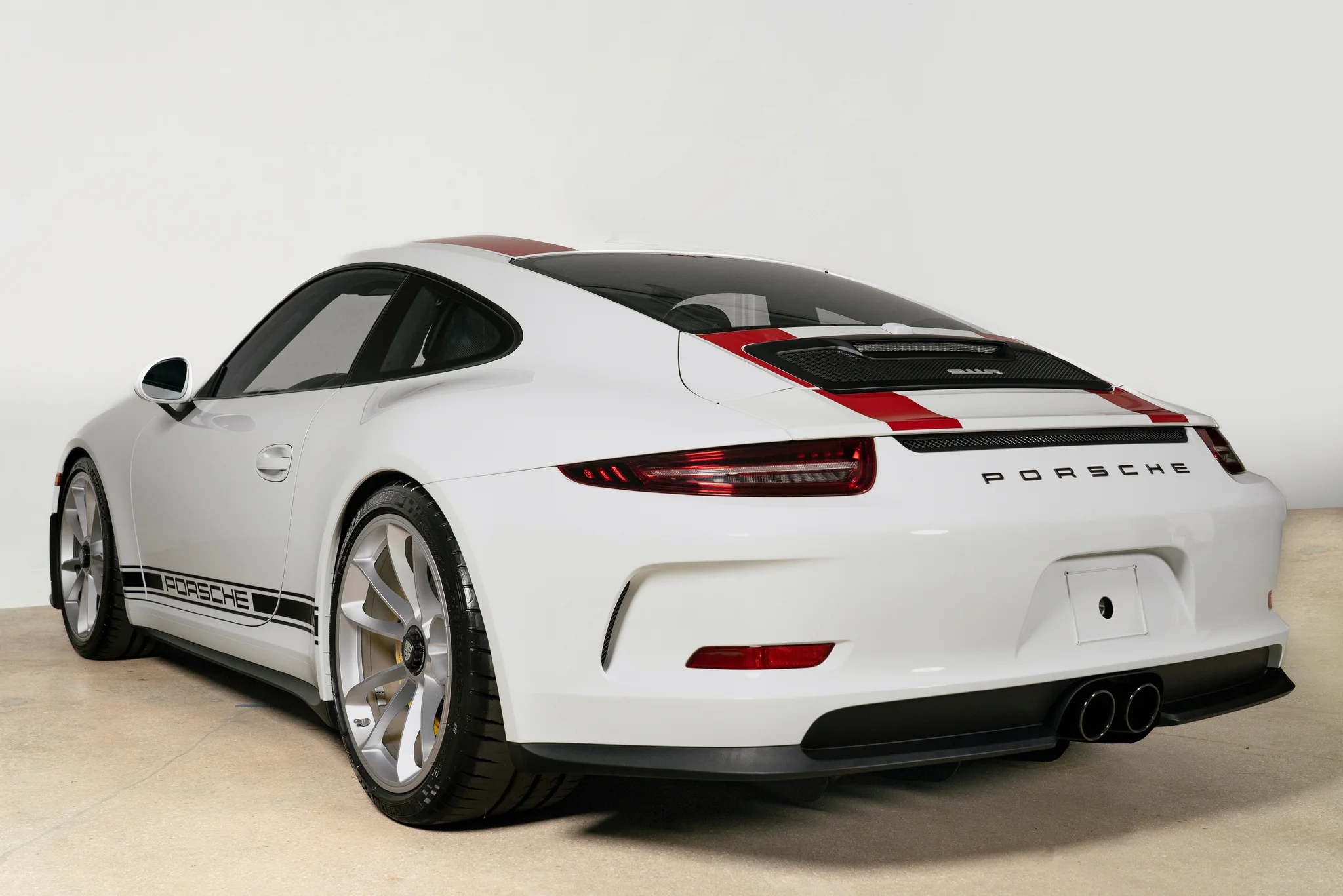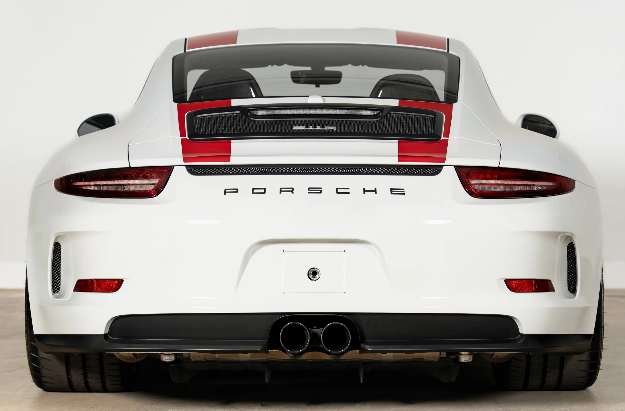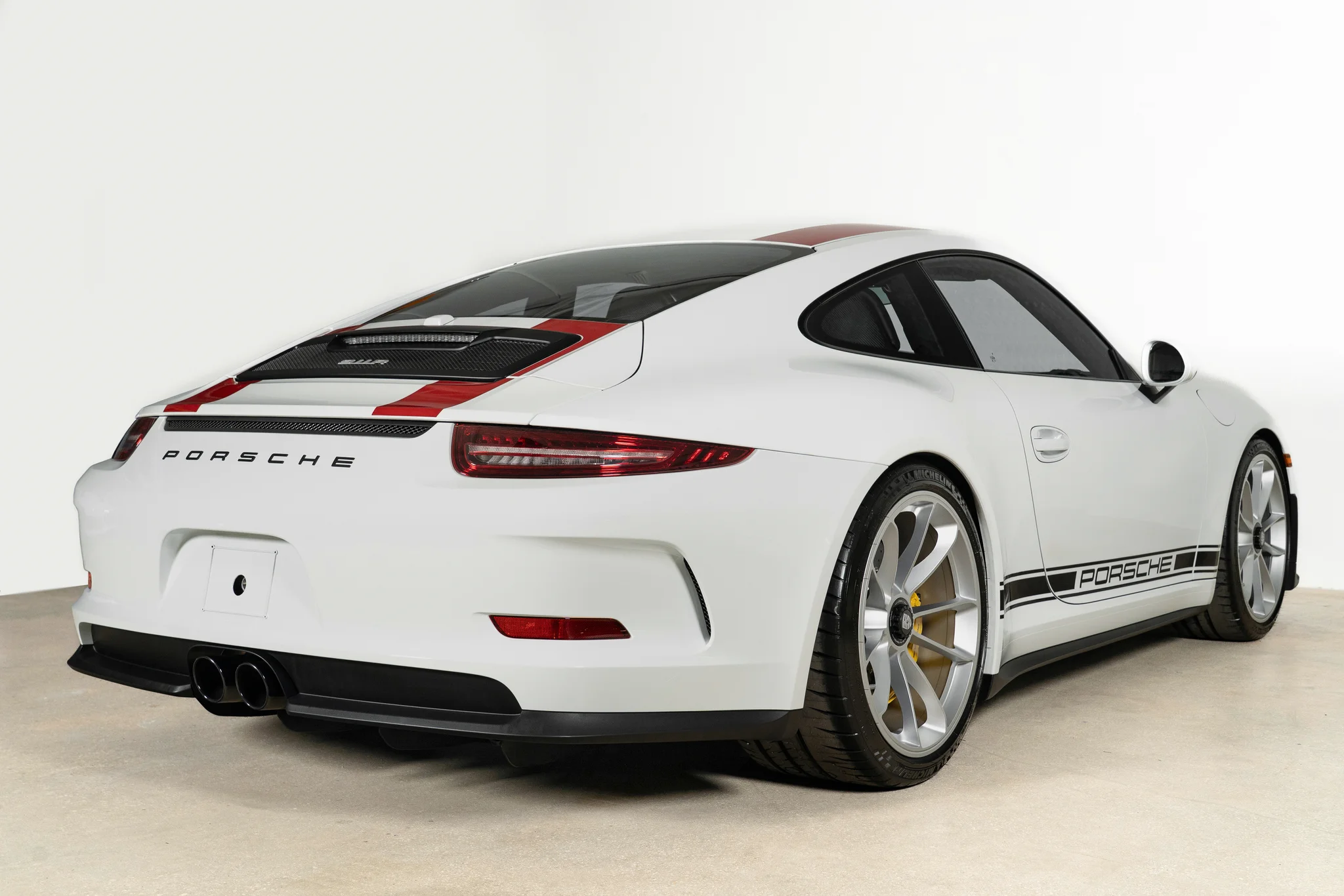 Although mechanically close to the GT3 RS, the 911 R adopts a cleaner look without the large rear wing and features revised suspension and steering. It shares most bodywork with the 991 GT3 but adds a carbon-fiber hood, magnesium roof, carbon-fiber front fenders, lightweight windows, a retractable rear spoiler, and an aluminum decklid grille.