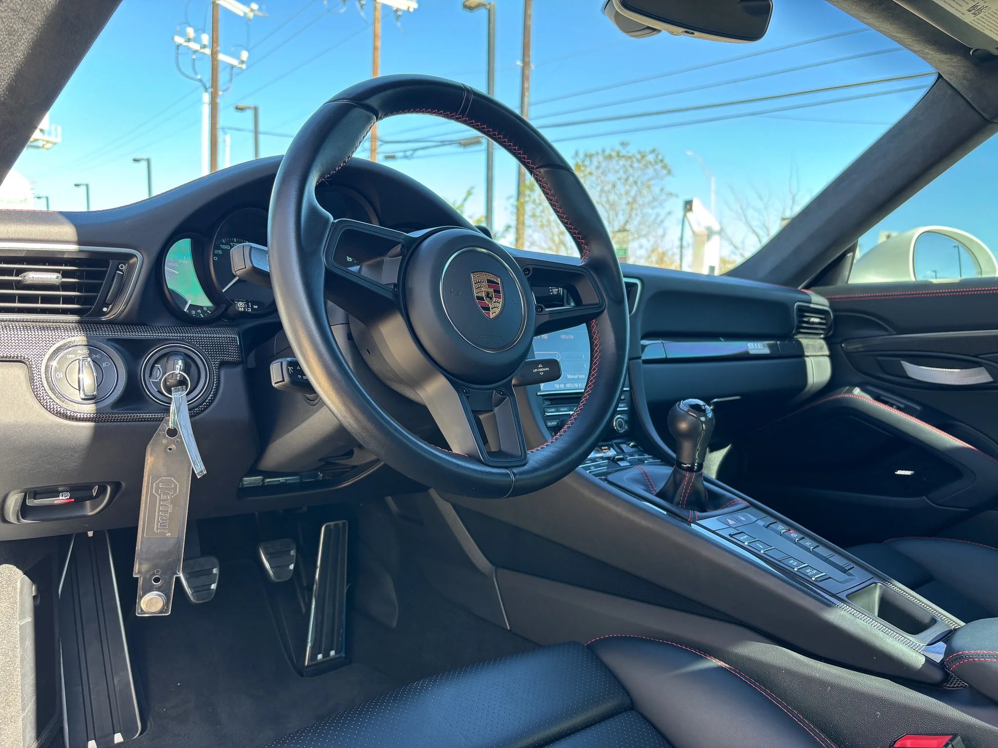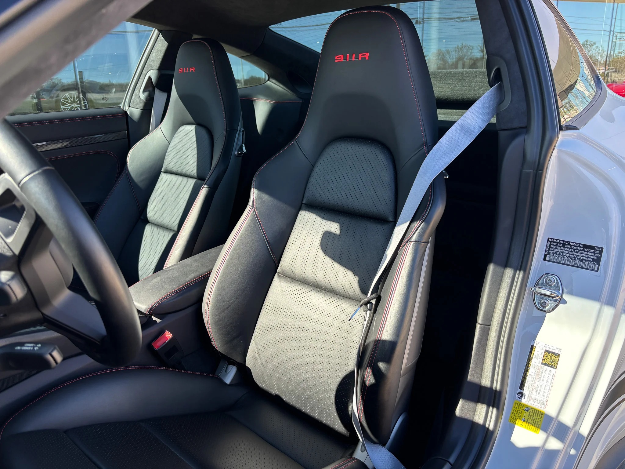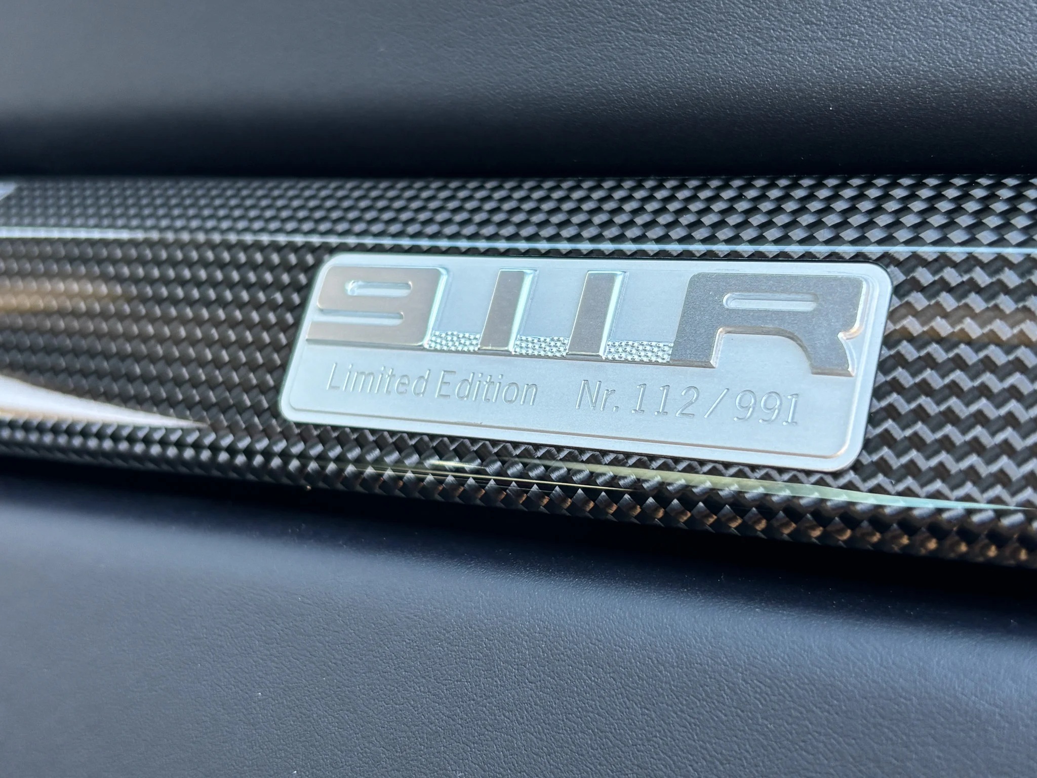 Borrowed GT3 hardware includes Porsche Active Suspension Management, rear-axle steering, Ceramic Composite Brakes with yellow calipers, and Michelin Pilot Sport Cup 2 tires. An extended-range fuel tank, aluminum-look fuel filler cap, front-axle lift system, and additional carbon fiber detailing complete this highly refined and collectible 911 R.