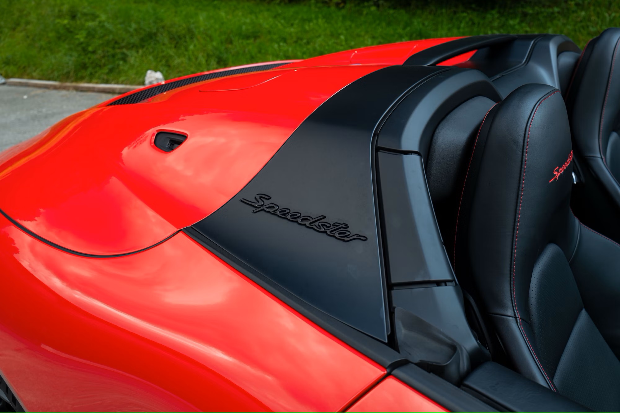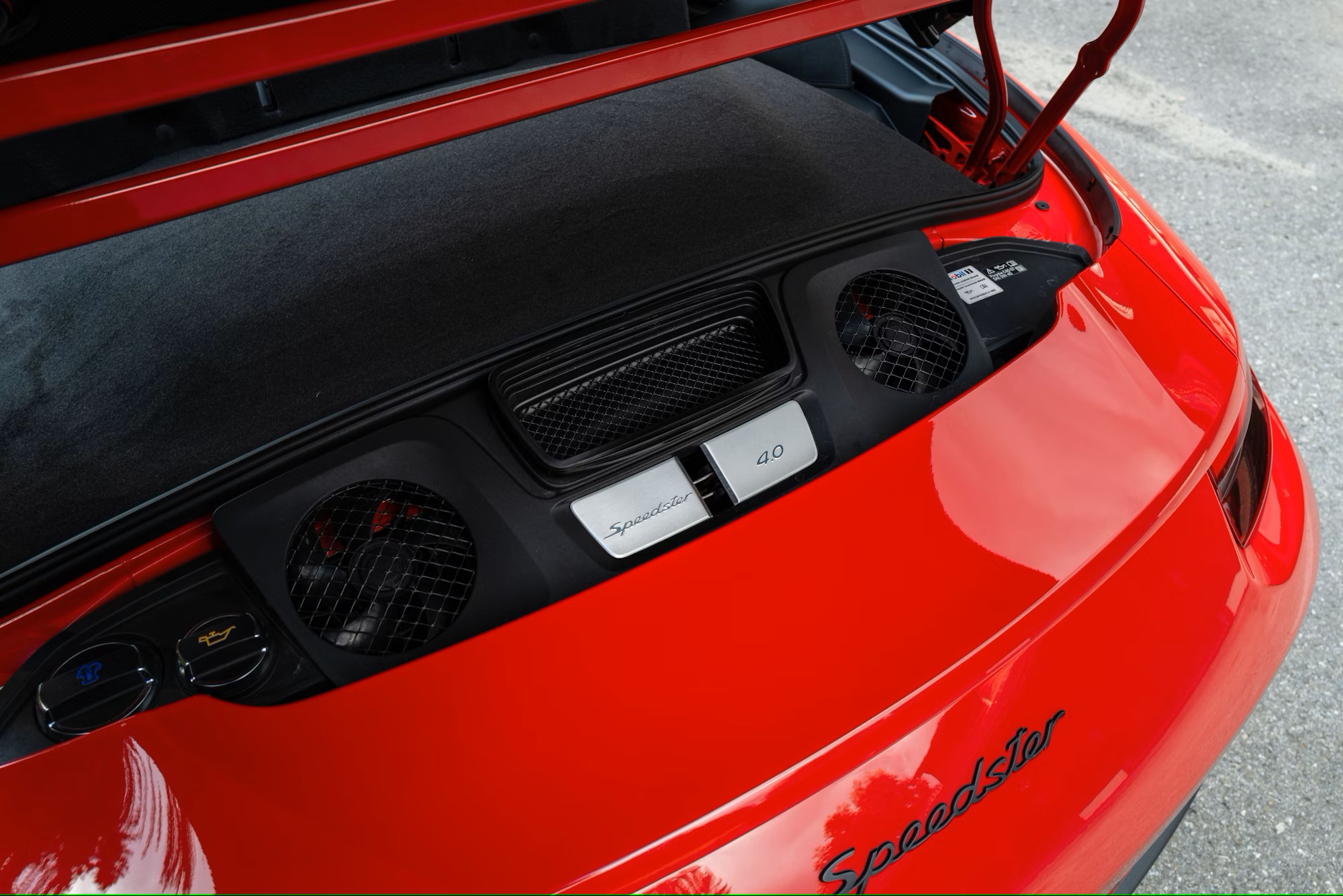 The Speedster is powered by a 4.0L naturally aspirated flat-6 engine producing 502 horsepower, featuring parts borrowed from the GT3 R, such as individual throttle bodies, a high-pressure injection system, and a lightweight exhaust. It is only available with a 6-speed manual transmission from the 911R, with no PDK option.