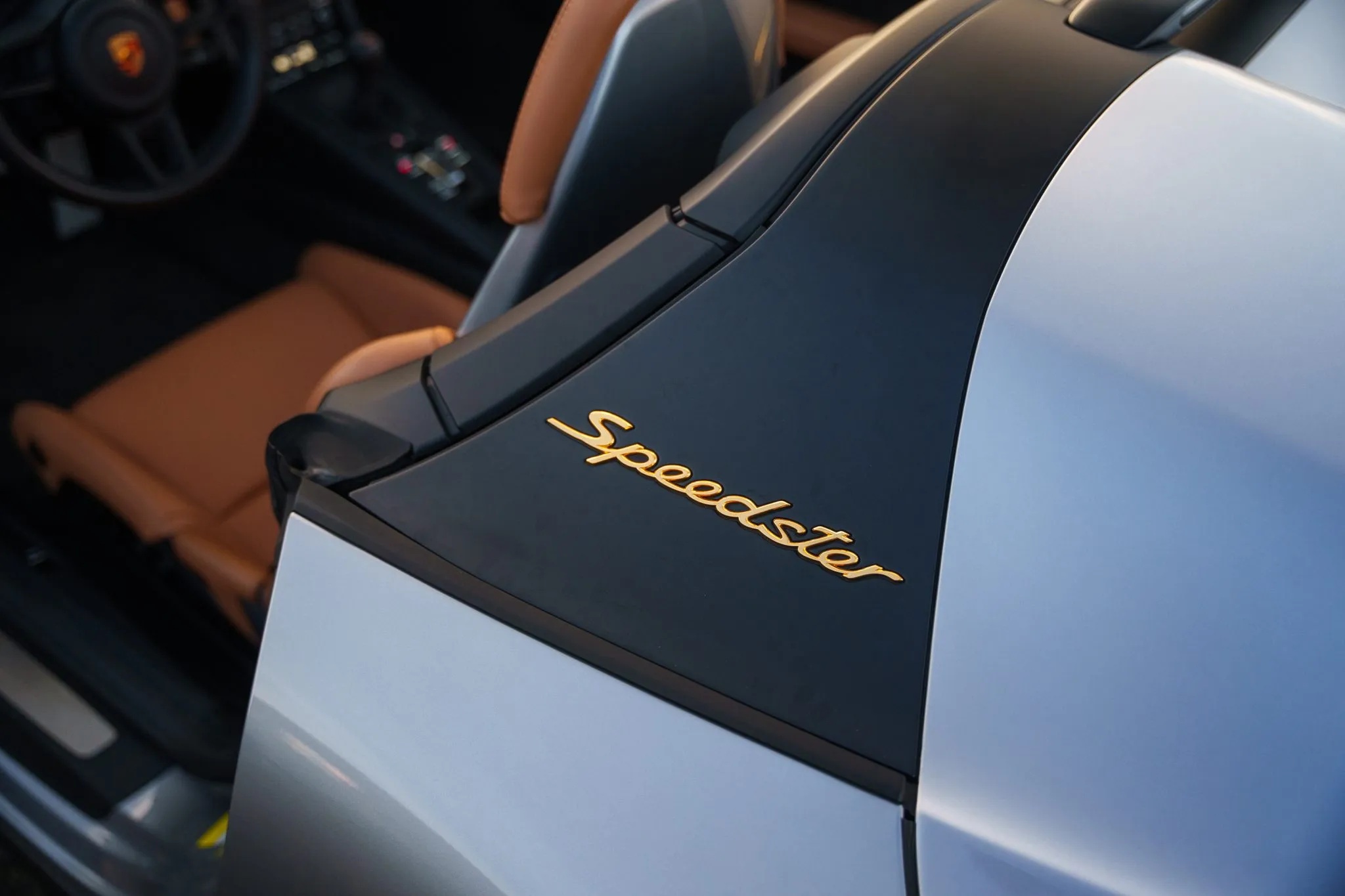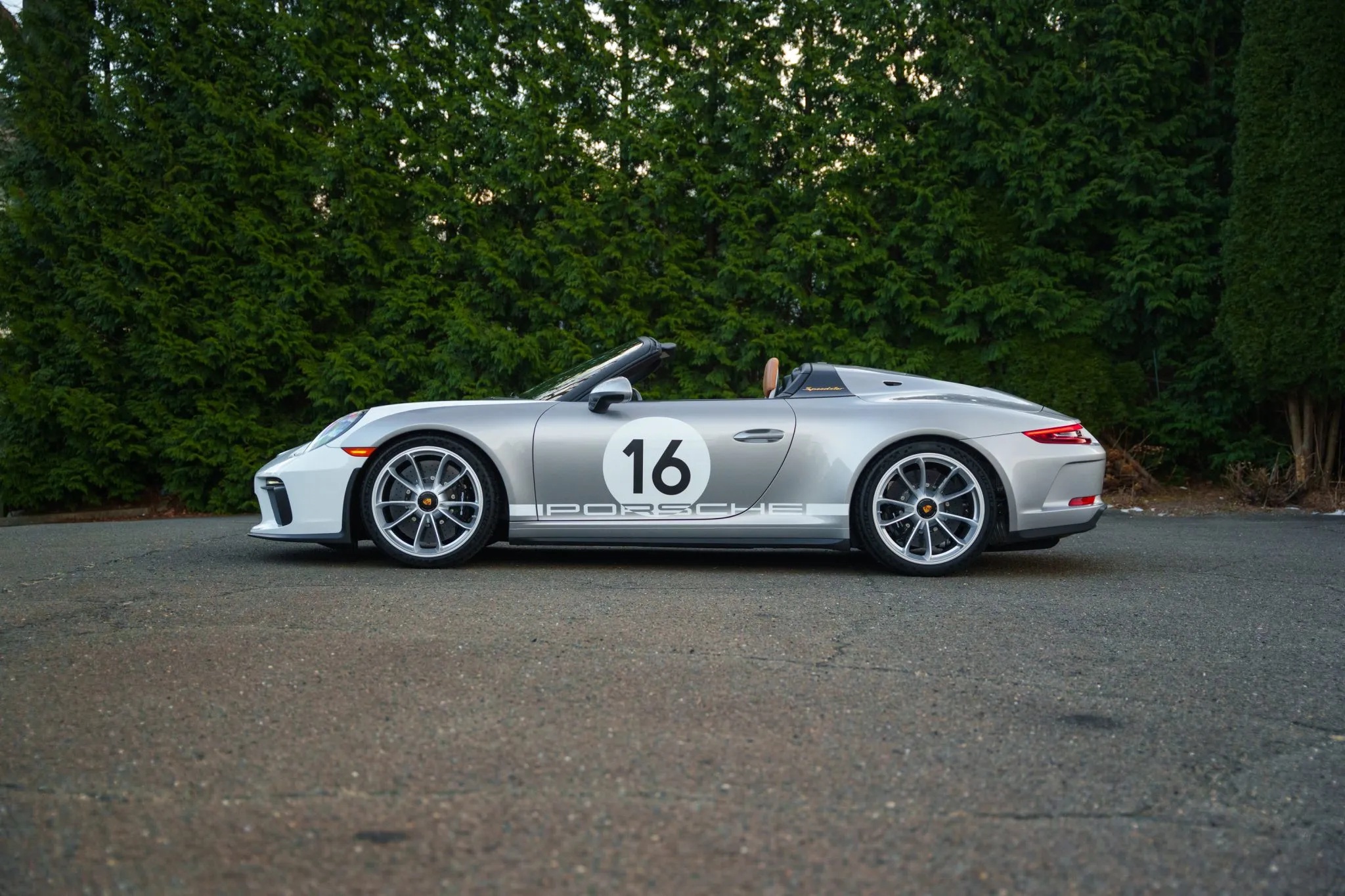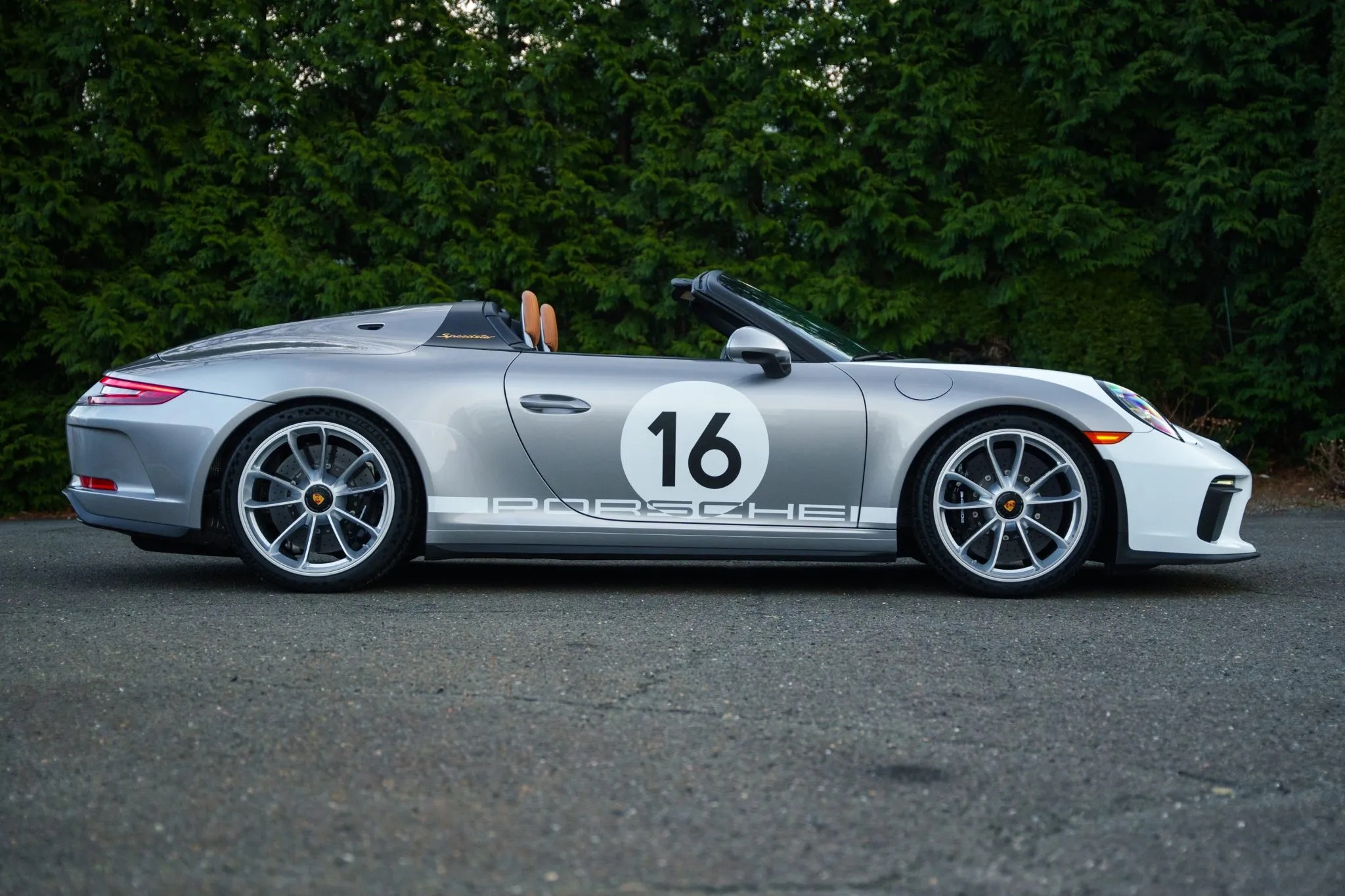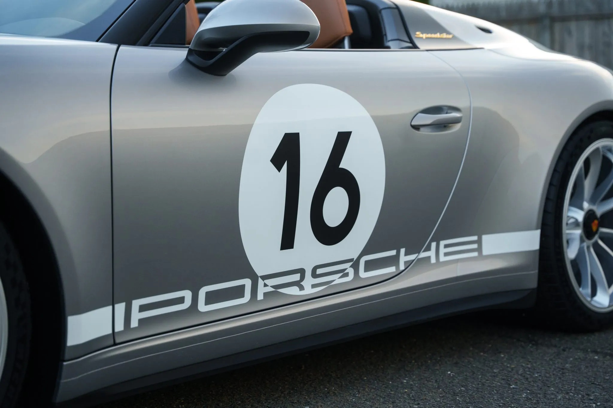 One standout option for the Speedster was the Heritage Design Package, which celebrated Porsche’s motorsport legacy. This package featured a striking livery inspired by factory-built 356 race cars, including a partially white front section, white motorsport graphics, and gold Speedster badging. The GT Silver Metallic paint echoed the era when race cars were painted in elemental silver, while the 20-inch satin platinum wheels with black centre locks added a modern touch.