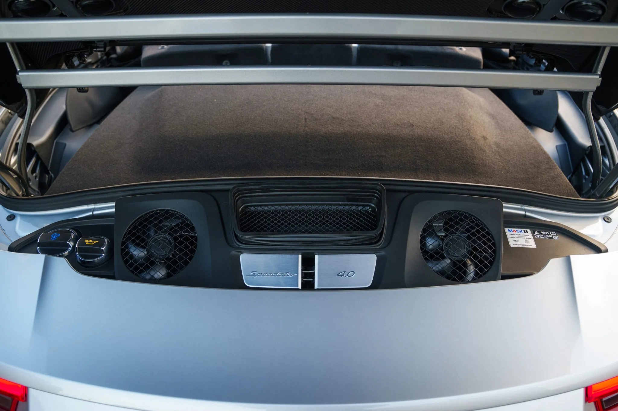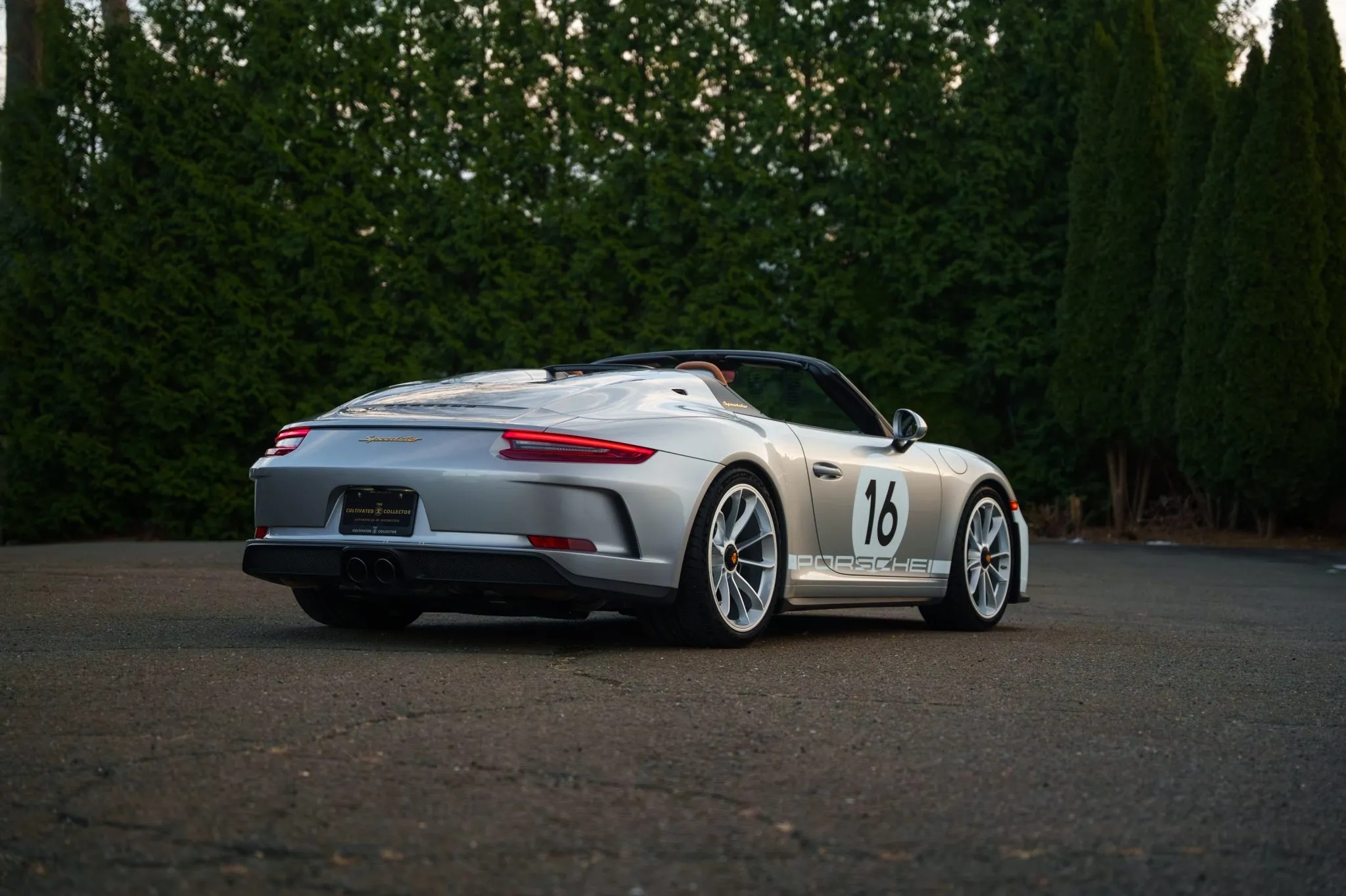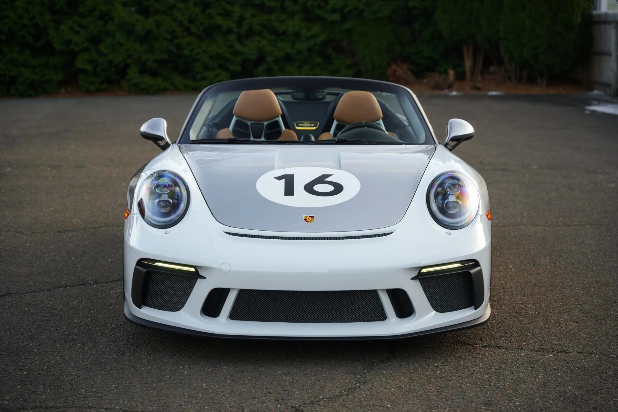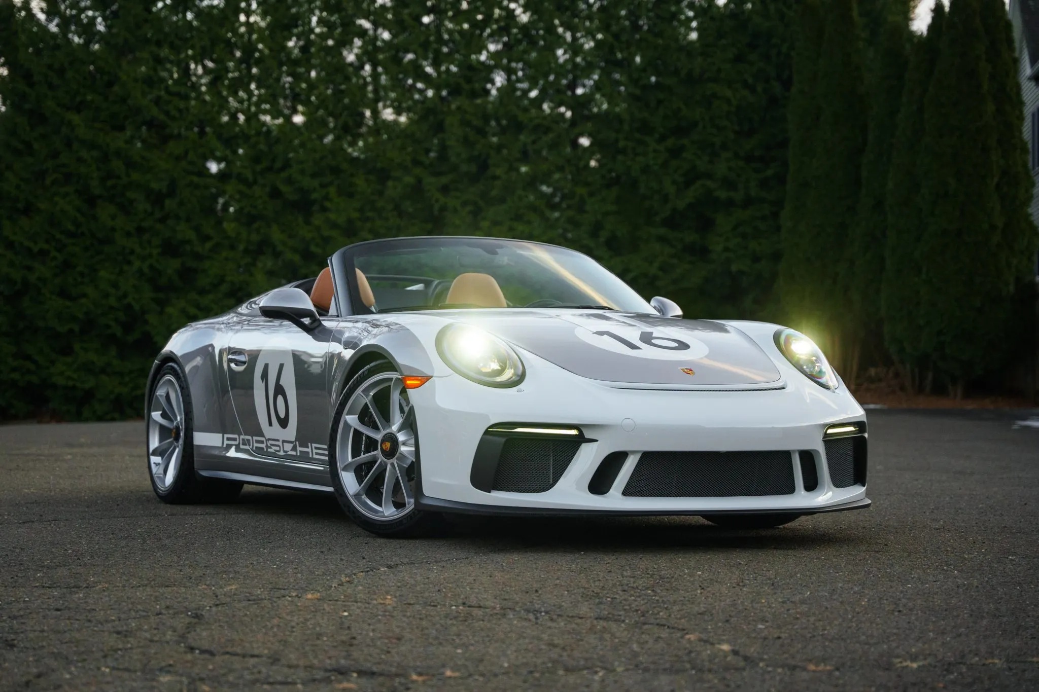 One standout option for the Speedster was the Heritage Design Package, which celebrated Porsche’s motorsport legacy. This package featured a striking livery inspired by factory-built 356 race cars, including a partially white front section, white motorsport graphics, and gold Speedster badging. The GT Silver Metallic paint echoed the era when race cars were painted in elemental silver, while the 20-inch satin platinum wheels with black centre locks added a modern touch.