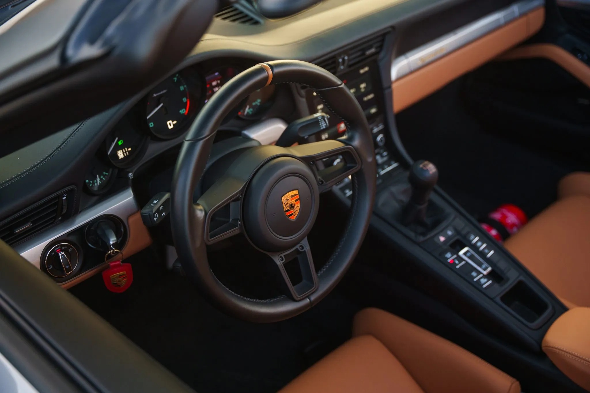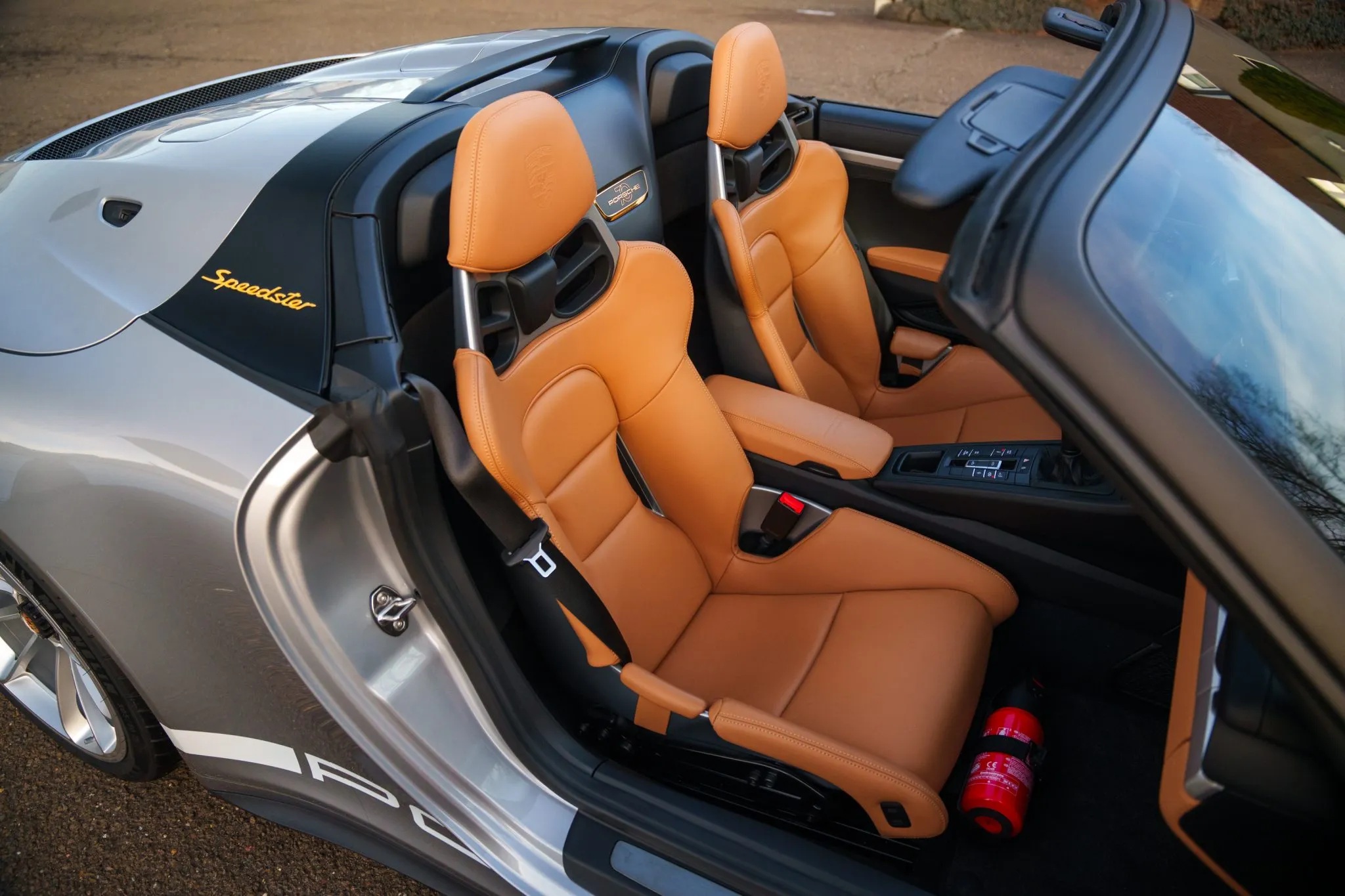 The interior is equally impressive, featuring Cognac leather bucket seats, black leather accents, high-end appointments like a Bose surround sound system, Porsche Communication Management with navigation, and the Light Design Package. A fire extinguisher in the passenger footwell adds a nod to motorsport practicality.