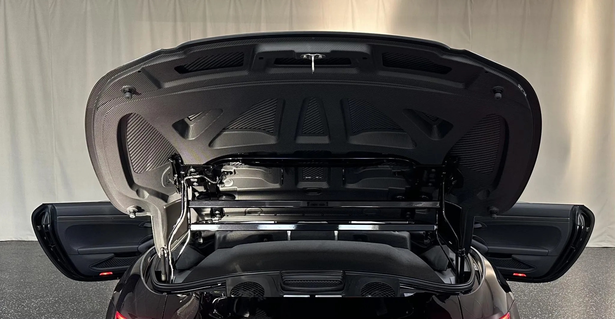 The interior features carbon-fiber full bucket seats trimmed in black leather extending throughout the cabin, complemented by carbon-fiber accents. Equipment includes the Chrono Package, Bose sound system, illuminated carbon-fiber door sills, Voice Control, auto-dimming mirrors, Light Design Package, fire extinguisher, PCM with navigation, dual-zone climate control, and cruise control.