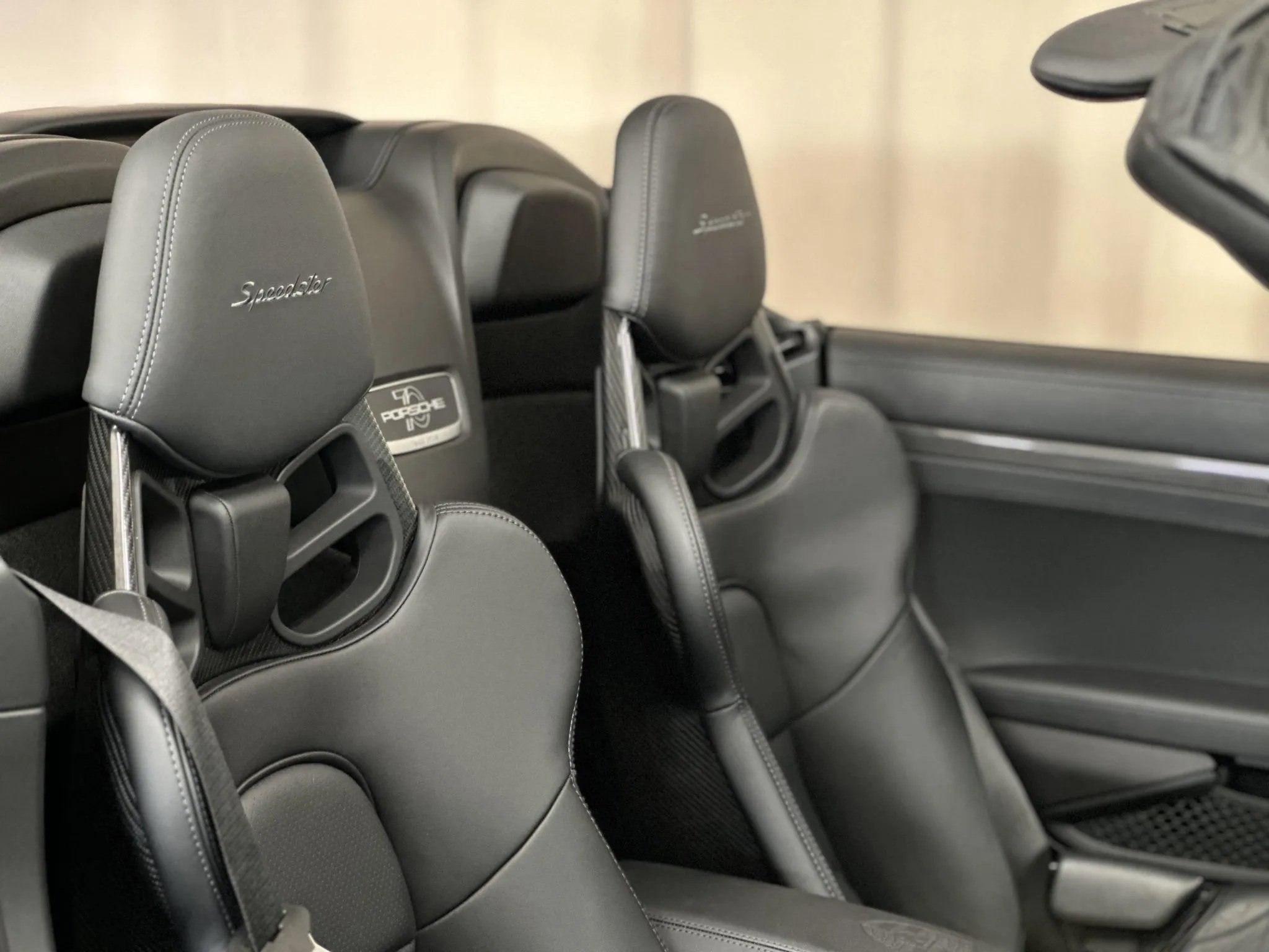 Distinctive features include the trademark twin rear cowlings, carbon-fibre front wings, bonnet, and hood cover, a GT3 rear bumper, and Speedster-specific front aero. Standard equipment includes a leather interior with perforated seats, red-tinted daytime running lights, stone guards, titanium exhaust, and carbon-ceramic brakes.