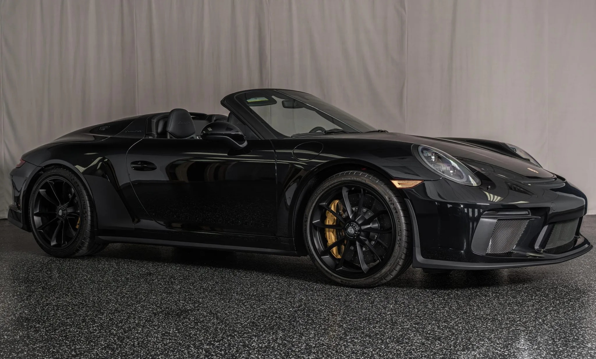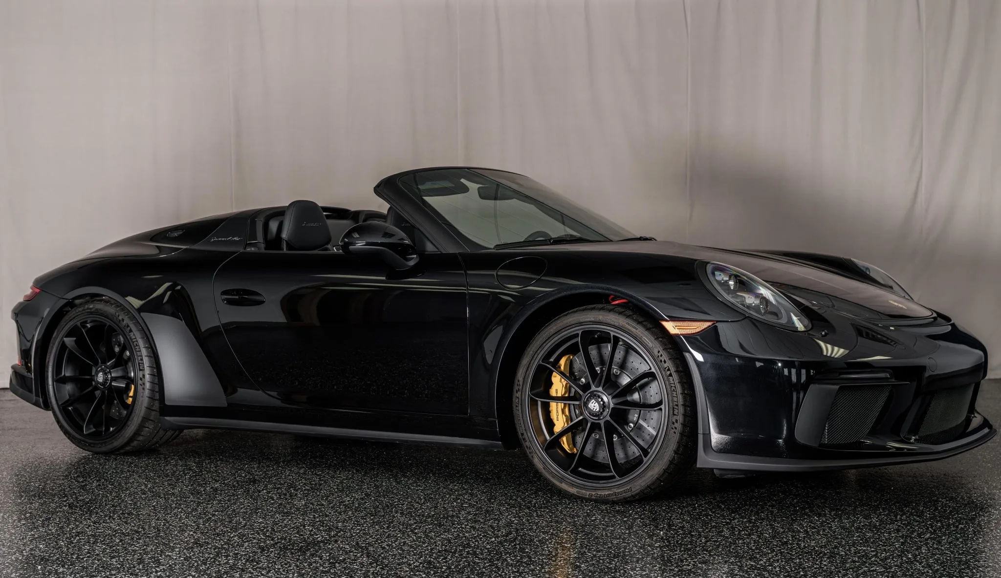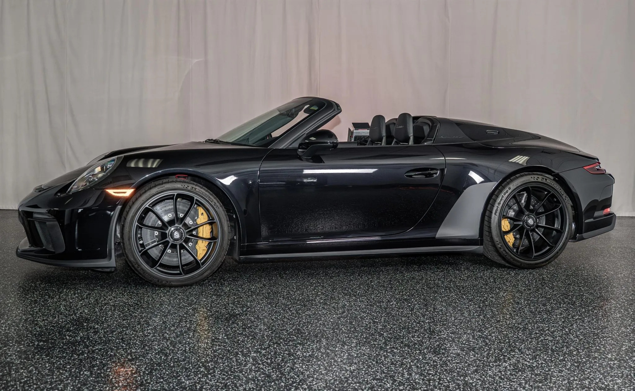 Offered for sale on Bring a Trailer, this 2019 Porsche 911 Speedster is number 1,643 of 1,948 built and remains in near-new condition with only 25 miles on the odometer. Finished in Jet Black Metallic, it features LED headlights with PDLS, a speed-activated rear spoiler, dual exhaust outlets, and satin black stone guards on the rear quarters.