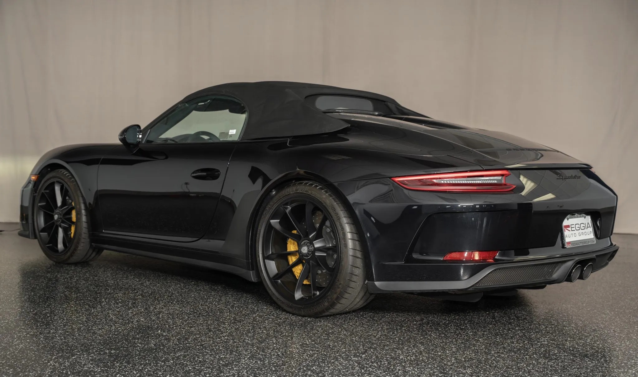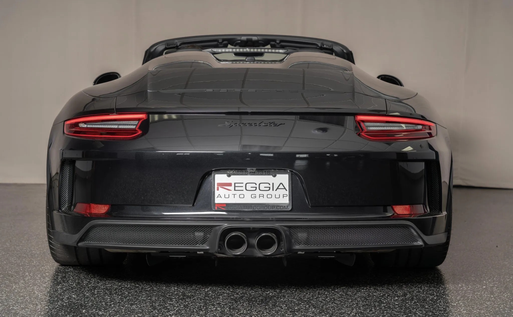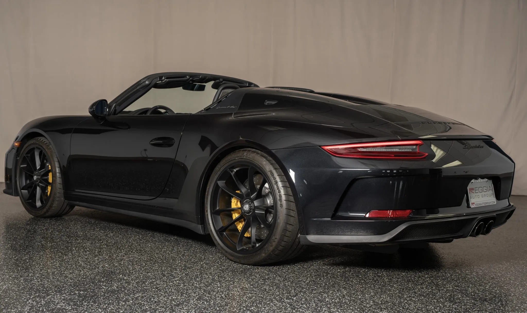 Offered for sale on Bring a Trailer, this 2019 Porsche 911 Speedster is number 1,643 of 1,948 built and remains in near-new condition with only 25 miles on the odometer. Finished in Jet Black Metallic, it features LED headlights with PDLS, a speed-activated rear spoiler, dual exhaust outlets, and satin black stone guards on the rear quarters.