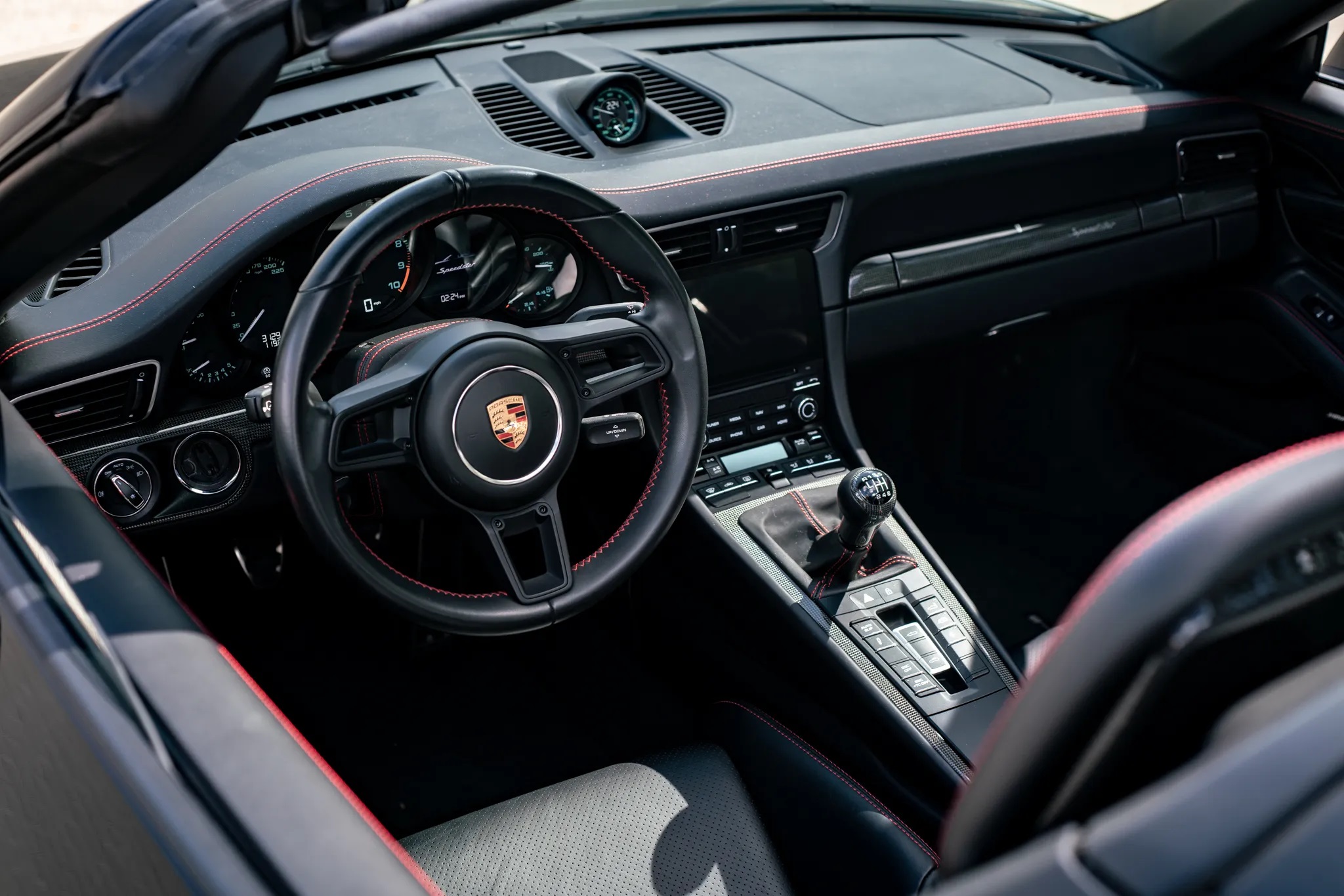 The car rides on 20″ GT3 center-lock alloy wheels accented by red stripes and fitted with Michelin Pilot Sport Cup 2 tires. The Speedster’s GT3 Touring suspension offers a more compliant ride compared to the GT3 RS, delivering firm but forgiving handling with remarkable cornering grip.