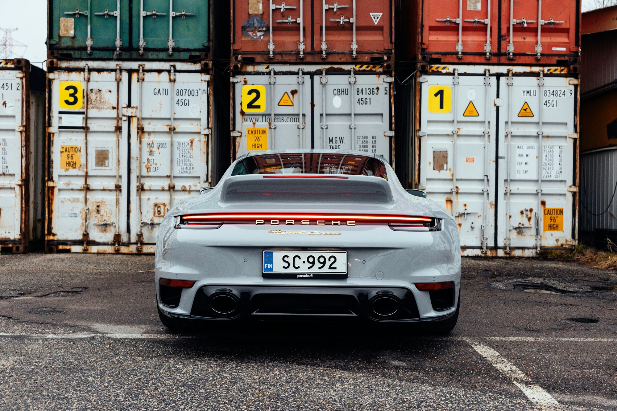 The car rides on 20-inch front and 21-inch rear Sport Classic center-lock wheels, finished in black with diamond-cut faces and colored Porsche crest caps. These frame Porsche Carbon Ceramic Brakes (PCCB) with black calipers and are shod in Pirelli P Zero tires.