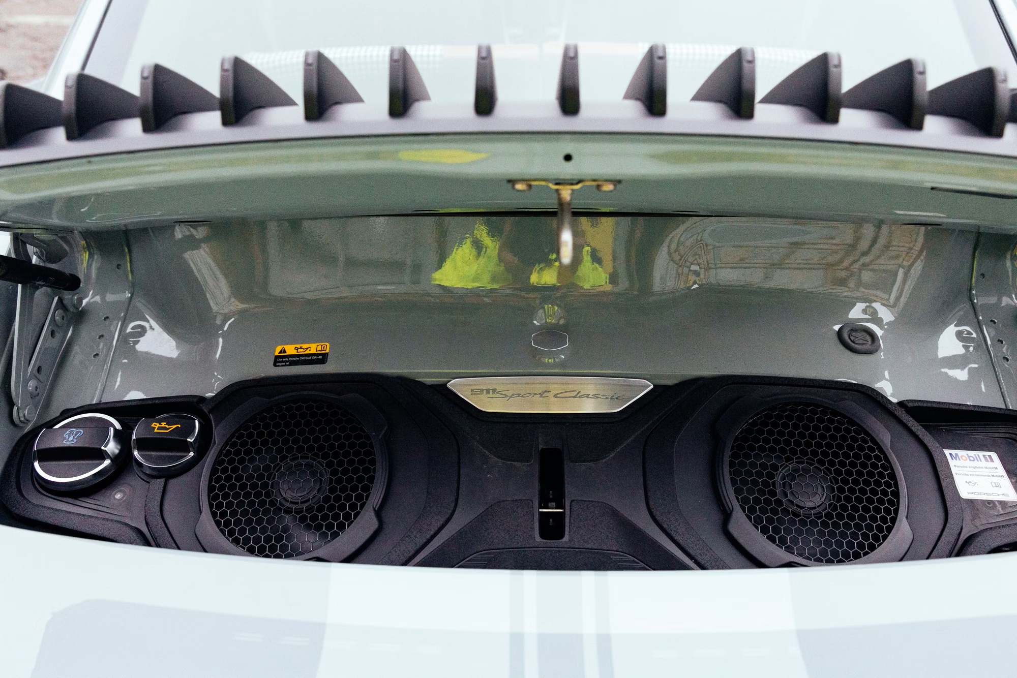 While it shares its wide-body shell with the Turbo, the Sport Classic adopts closed-off rear intake ducts and dispenses with active aerodynamic elements. Design highlights include an indented carbon-fiber hood, gold-colored badging and lettering, and a ducktail spoiler inspired by the Carrera RS 2.7. Additional heritage cues come in the form of a 1963-style Porsche crest, gold accents throughout, and Manufaktur badges on the front quarter panels.