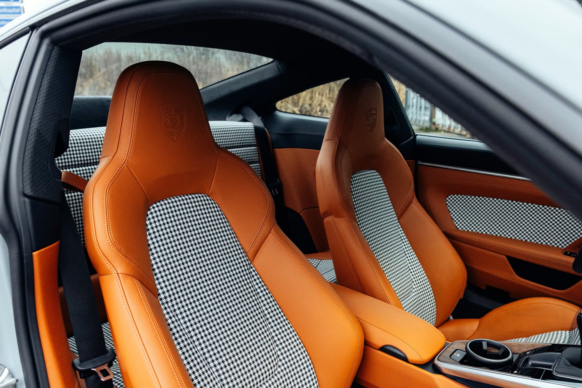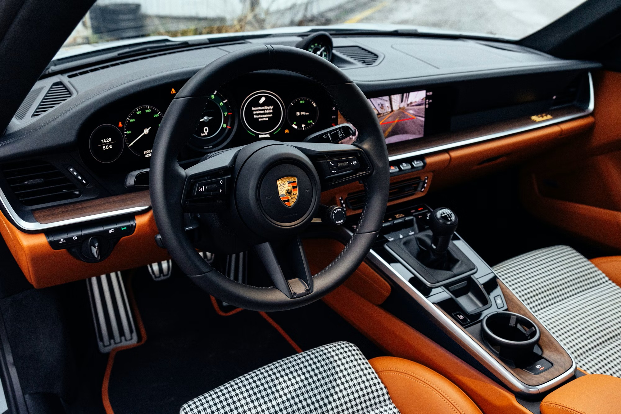 Number 260 of just 1,250 examples produced worldwide, this 2023 Porsche 911 Sport Classic—offered for sale on Collecting Cars—is finished in Sport Grey with Heritage Design stripes and side decals. The cabin is trimmed in Saddle Brown leather with houndstooth inserts for the seats and door cards, complemented by Paldao wood inlays.