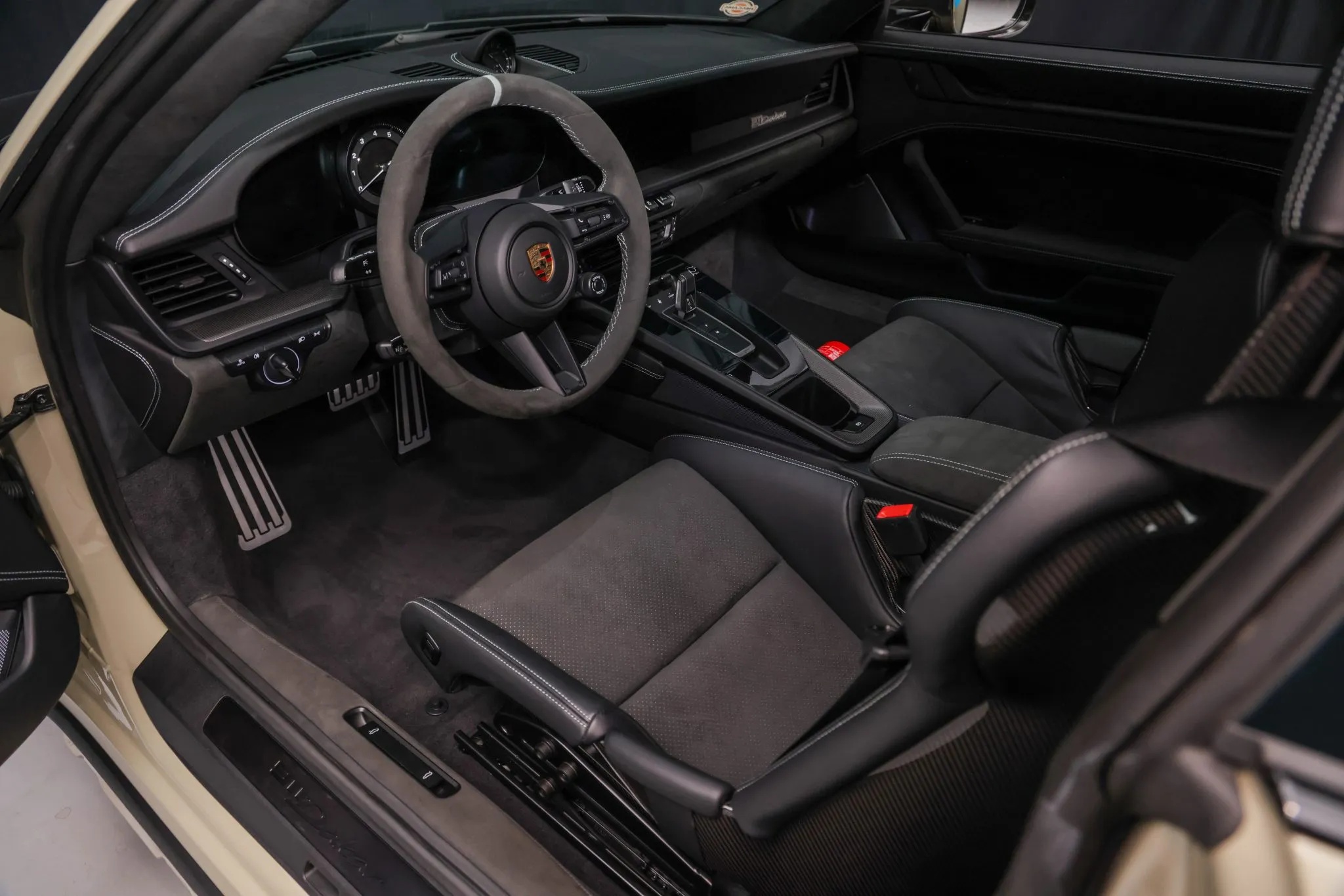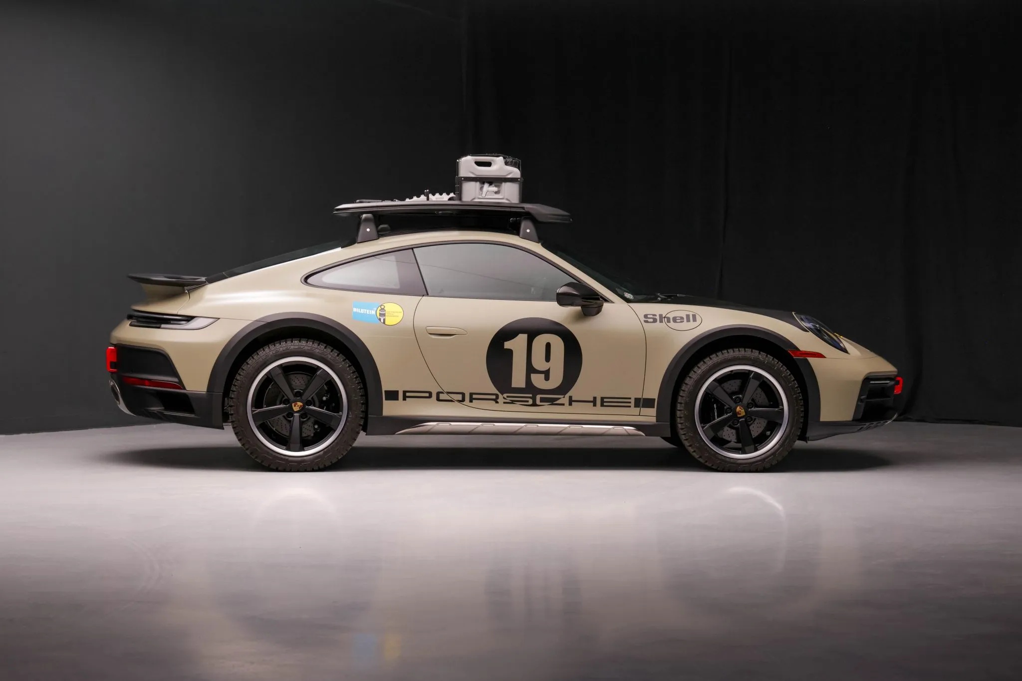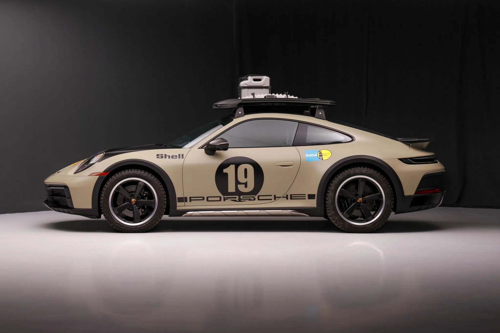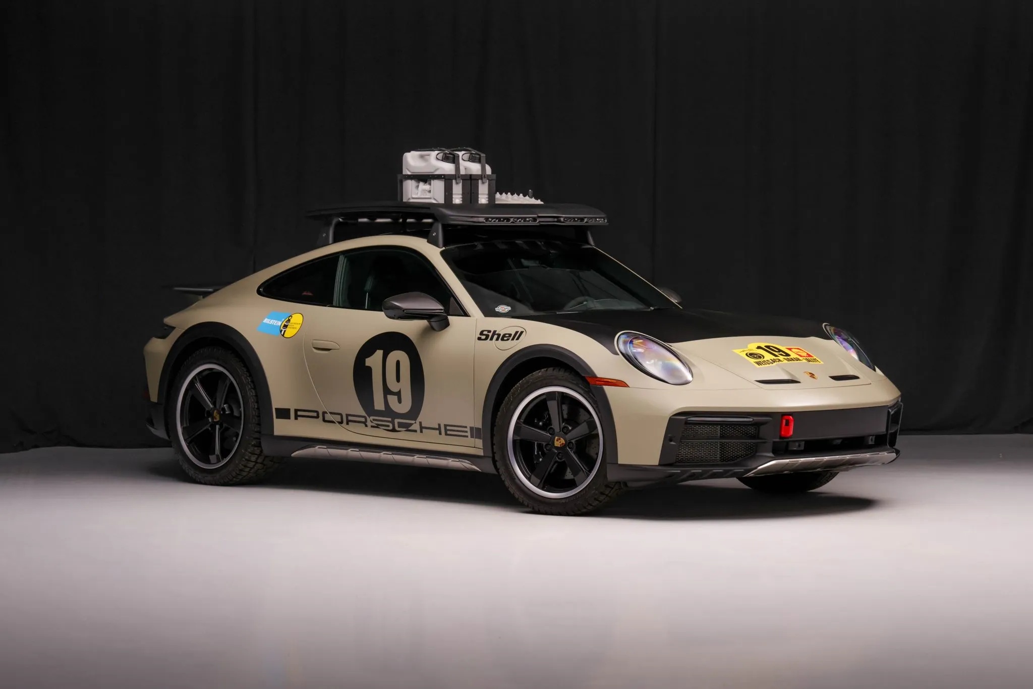 Finished in paint-to-sample Stone Gray, the car is adorned with the Rallye 1974 graphics package, a tribute to the No. 19 911 Carrera RS 2.7 driven by Björn Waldegård and Hans Thorszelius to a runner-up finish in the 1974 East African Safari Rally. Its rugged aesthetic is further emphasized by black brake calipers, a carbon-fiber roof, black rocker cladding with integrated stainless-steel protection, and staggered 19- and 20-inch Dakar wheels wrapped in Pirelli tires.