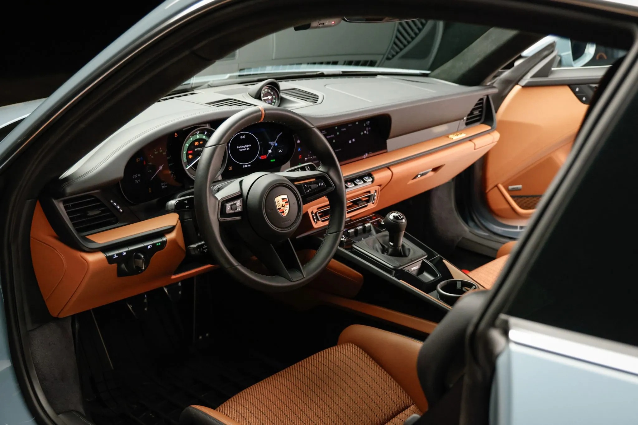 Inside, a vintage-inspired cabin blends Black and Classic Cognac leather with carbon bucket seats, Porsche Green gauges, and modern amenities like Sport Chrono, ambient lighting, and Bose audio.