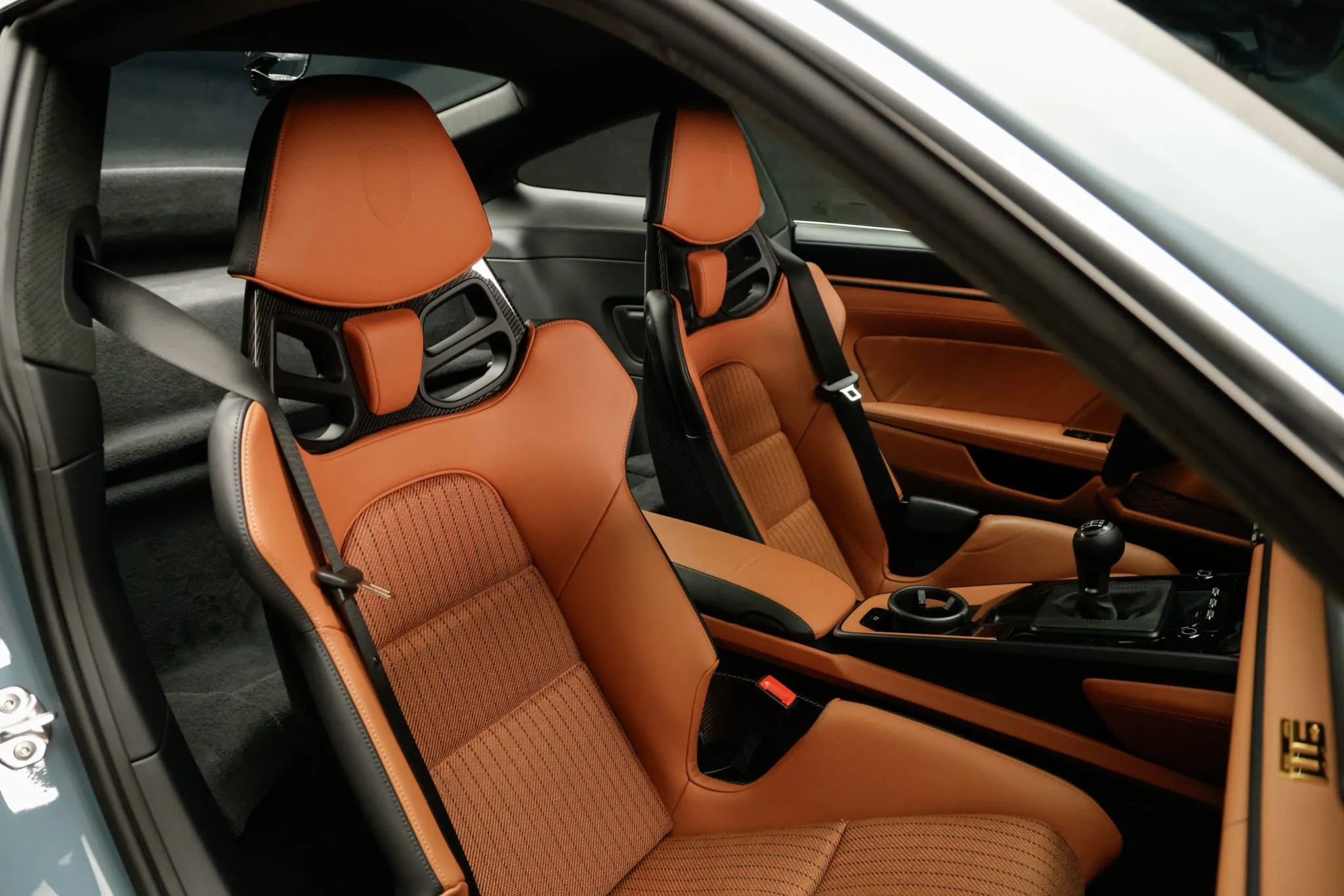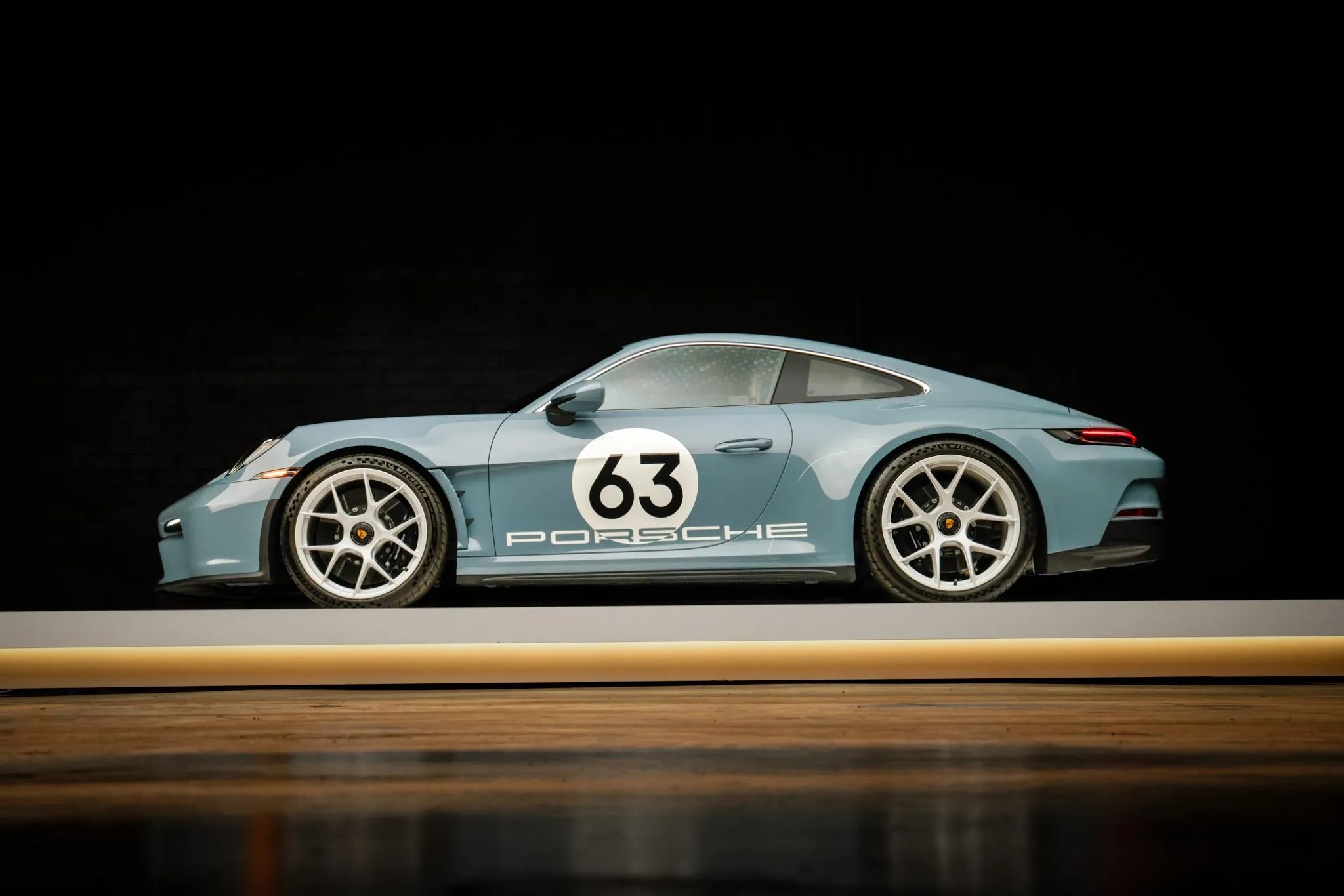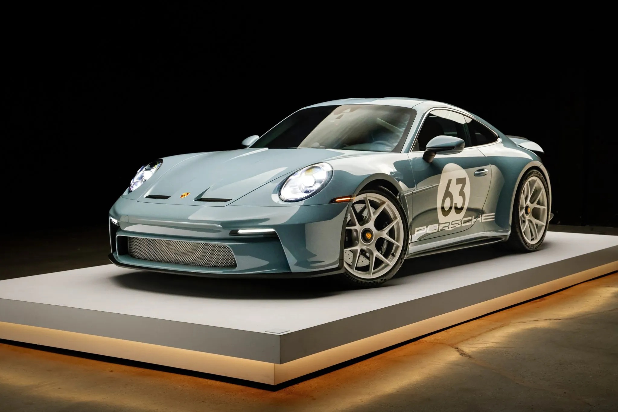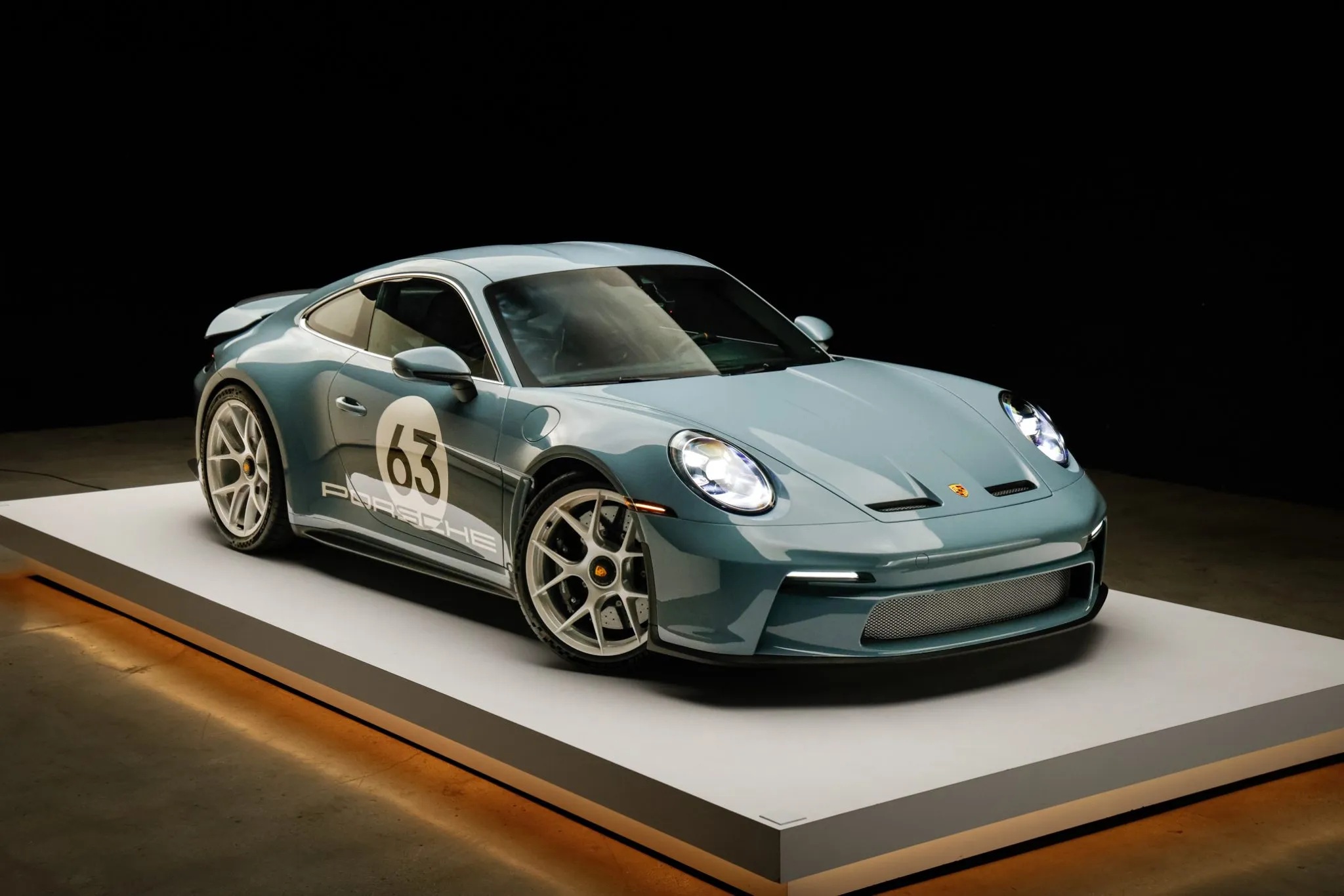 Further reinforcing its purist mission are lightweight glass, reduced sound deadening, an extended-range fuel tank, a retractable rear spoiler, and staggered magnesium centerlock wheels with carbon-ceramic brakes. This car also features the Heritage Design Package, finished in Shore Blue Metallic with gold badging and commemorative “1963–2023” crests.