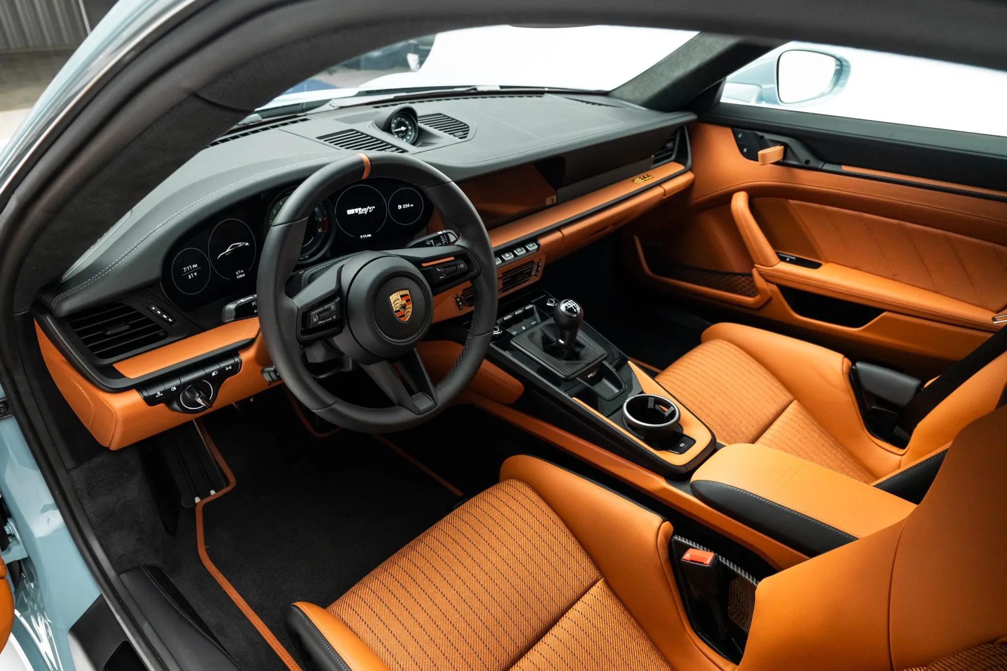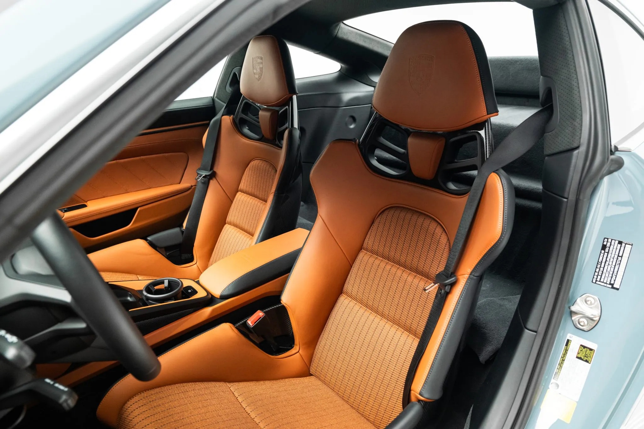 Inside, the Heritage Design theme blends classic and contemporary elements, with Black and Classic Cognac leather, a perforated headliner, and carbon fiber bucket seats with fabric inserts. Modern amenities include the Sport Chrono Package, ambient lighting, a Bose surround sound system, and signature Porsche Green instrument dials.