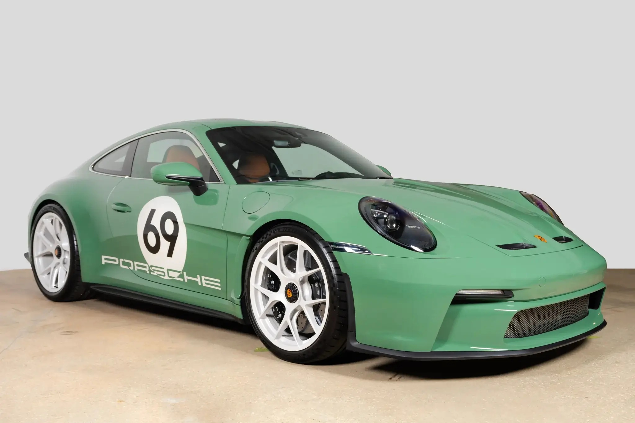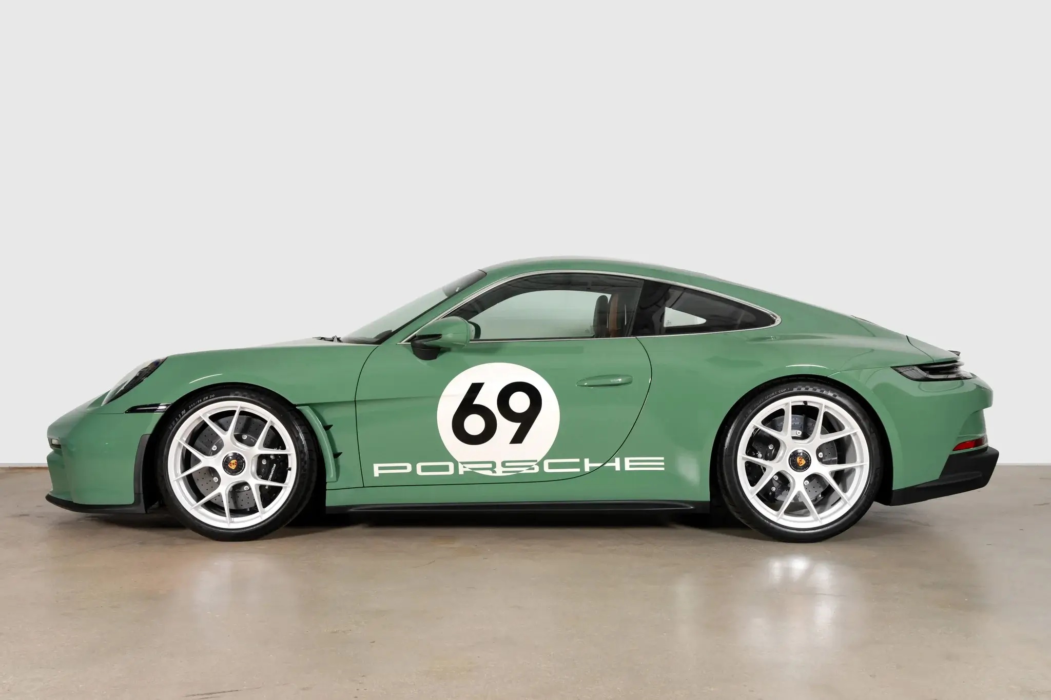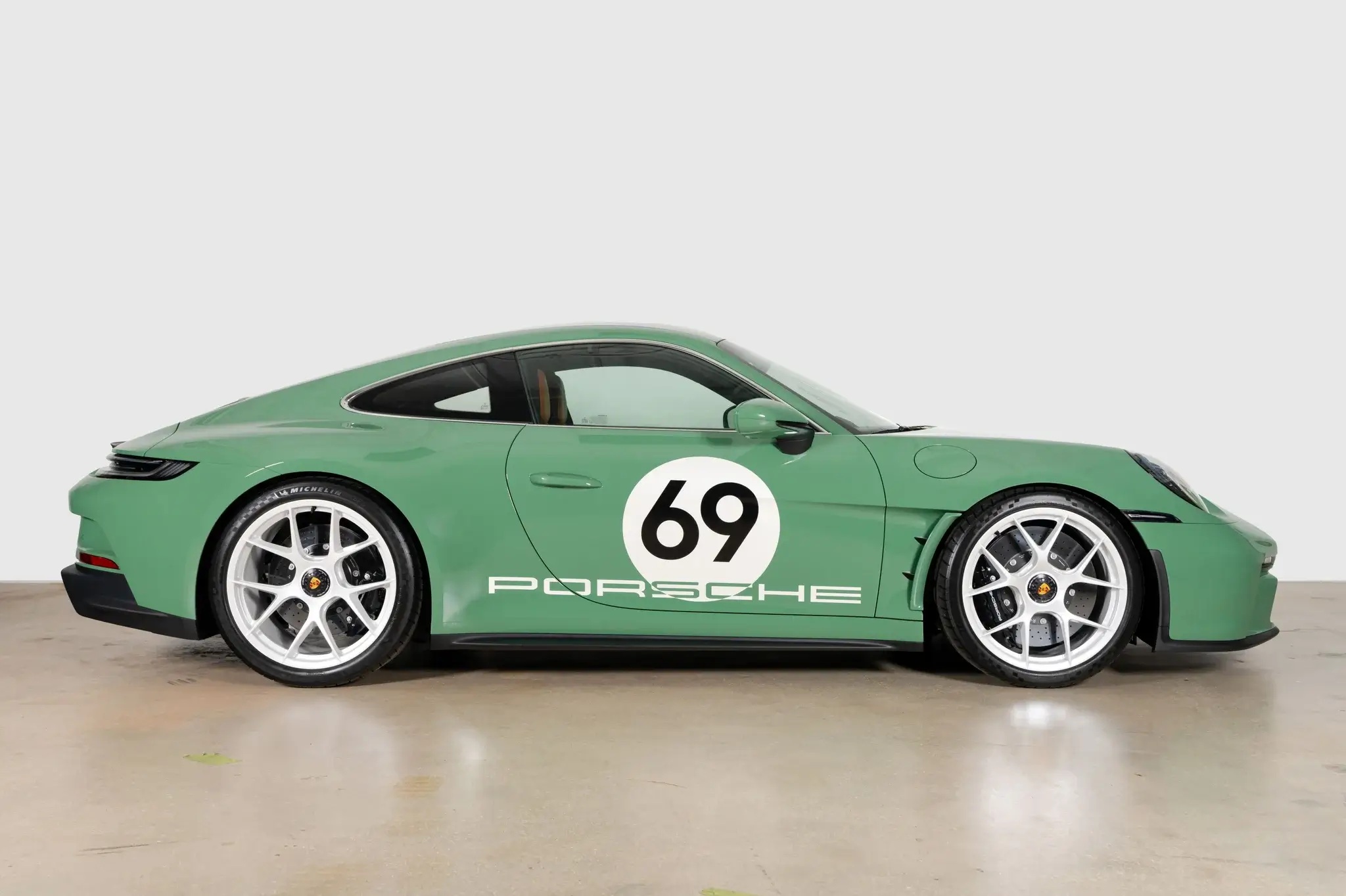 This 2024 Porsche 911 S/T, listed on PCARMARKET with just 102 miles, is finished in Auratium Green—a paint-to-sample color inspired by late-1950s Porsche 356 models. It also boasts the optional $20,360 Heritage Design Package, which adds retro-inspired details like 911 side motorsport decals, personalized starting numbers, historic Porsche crests, gold badging, and Ceramic-finished magnesium center-lock wheels.