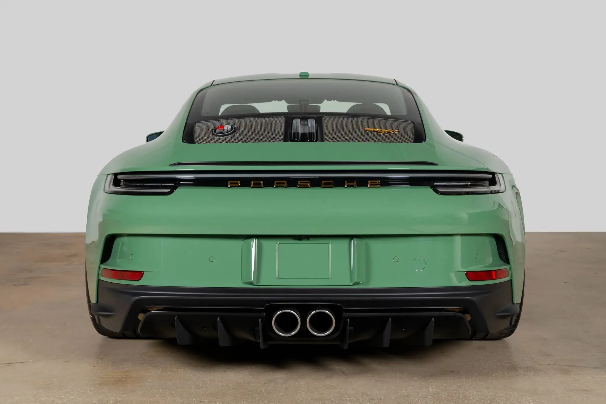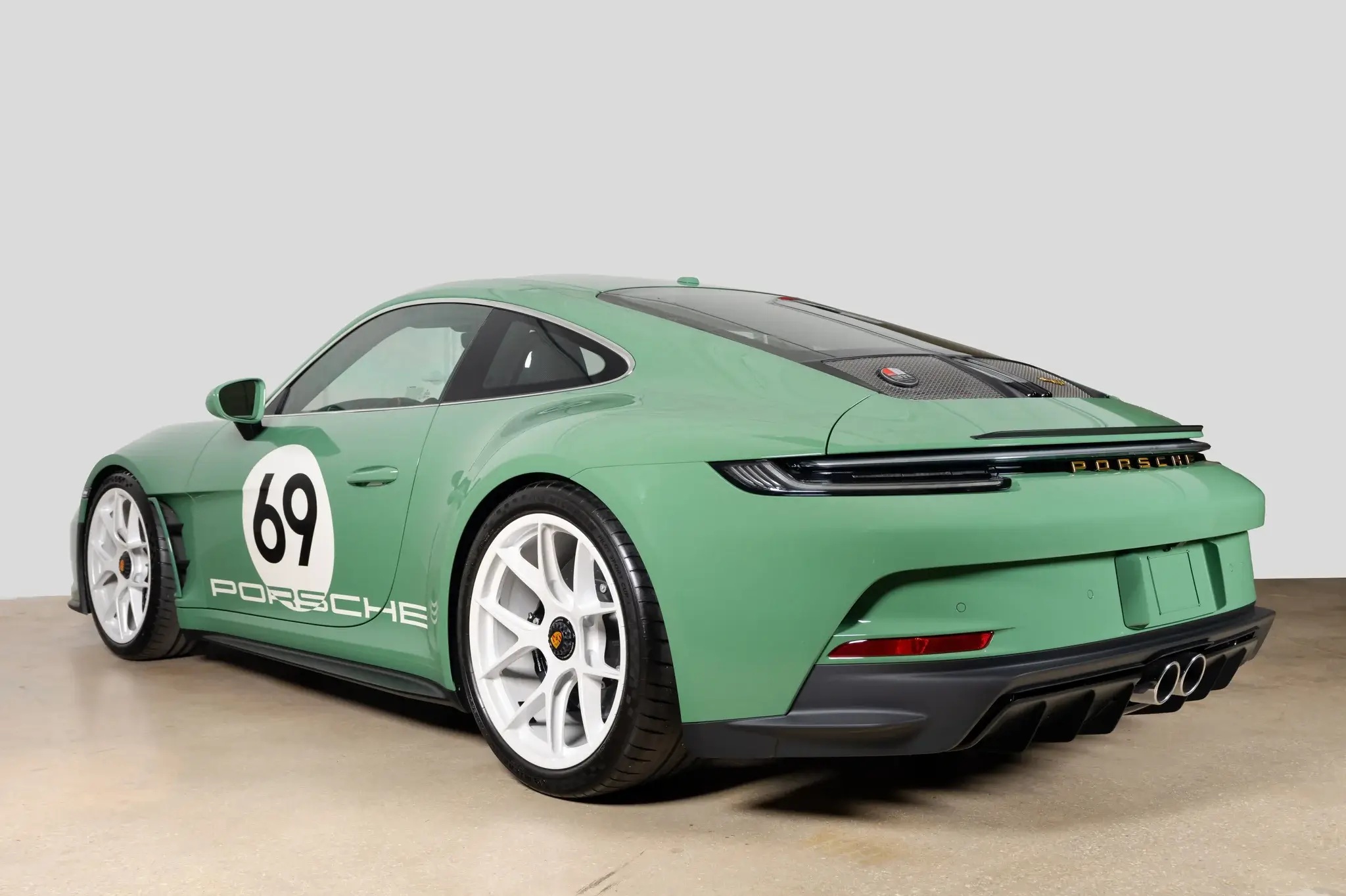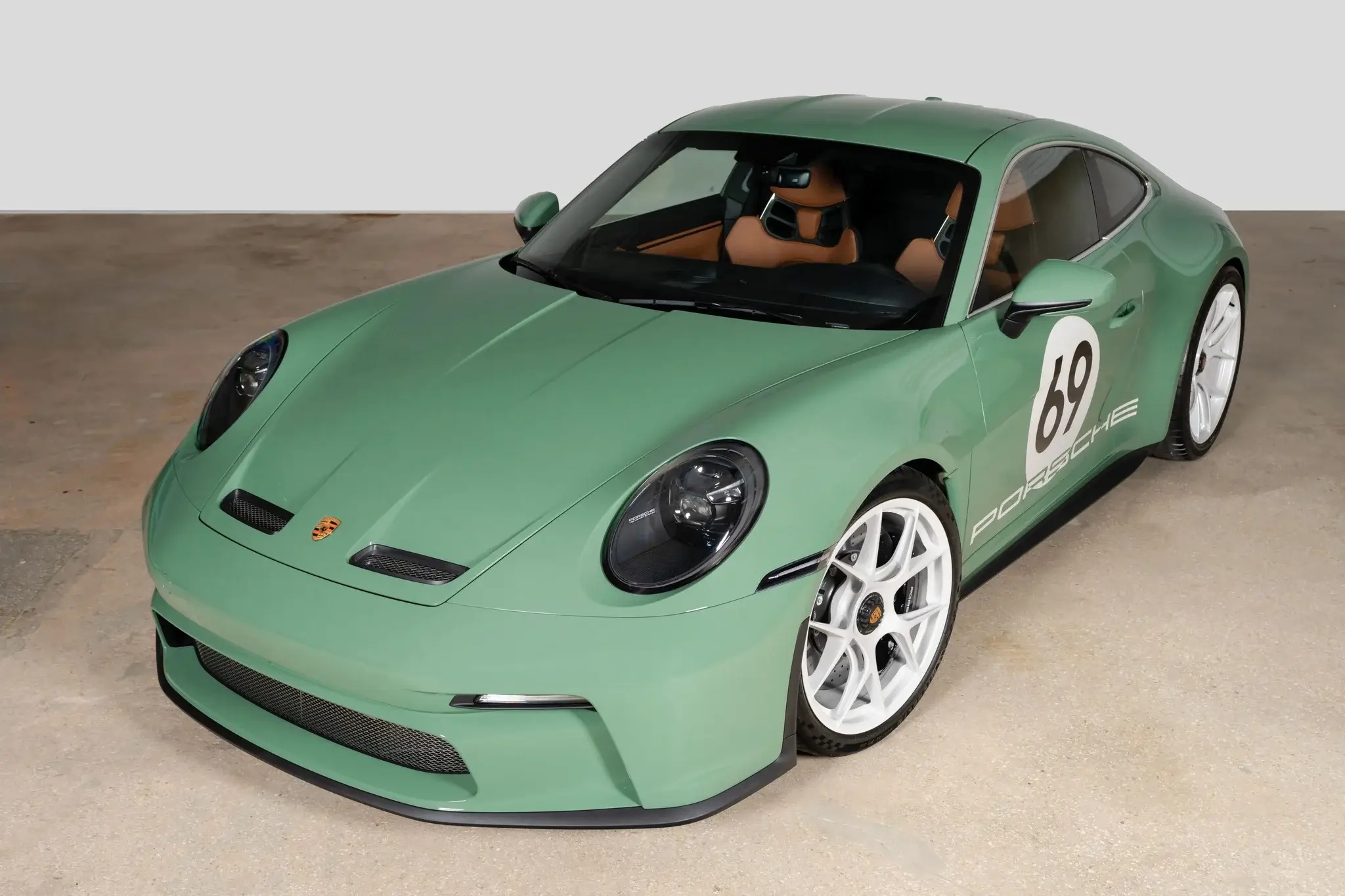 This 2024 Porsche 911 S/T, listed on PCARMARKET with just 102 miles, is finished in Auratium Green—a paint-to-sample color inspired by late-1950s Porsche 356 models. It also boasts the optional $20,360 Heritage Design Package, which adds retro-inspired details like 911 side motorsport decals, personalized starting numbers, historic Porsche crests, gold badging, and Ceramic-finished magnesium center-lock wheels.