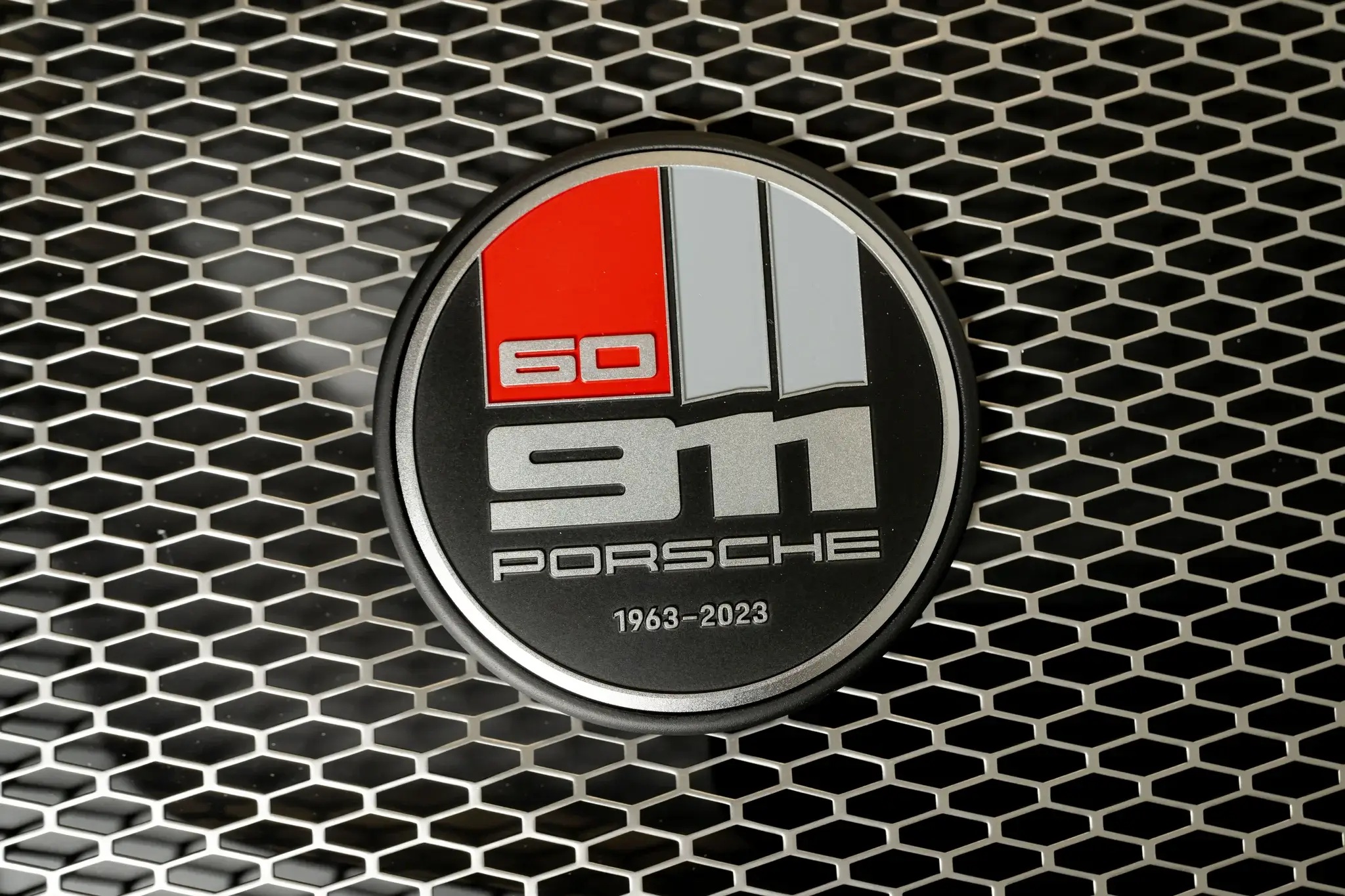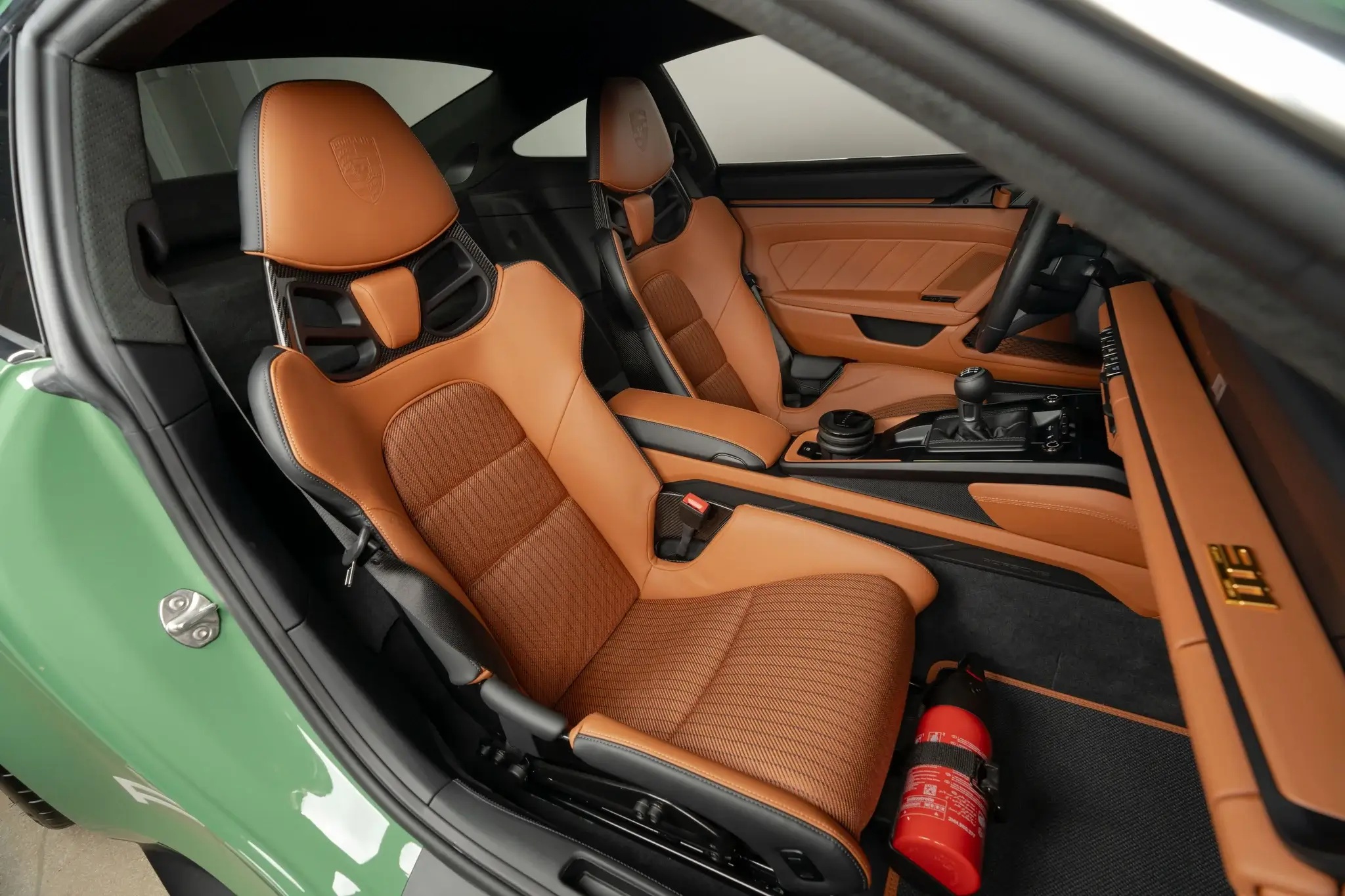 Inside, the Black and Cognac Heritage Design leather interior features two-tone Full Bucket Seats with pinstriped fabric centers, extended leather upholstery, and historic Porsche crests on the headrests and steering wheel. Additional interior options include leather sun visors, a fire extinguisher, the Chrono Package, a BOSE Surround Sound System, and ambient lighting. A gold “60 Jahre 911” badge and the car’s production number are displayed on the dashboard trim.