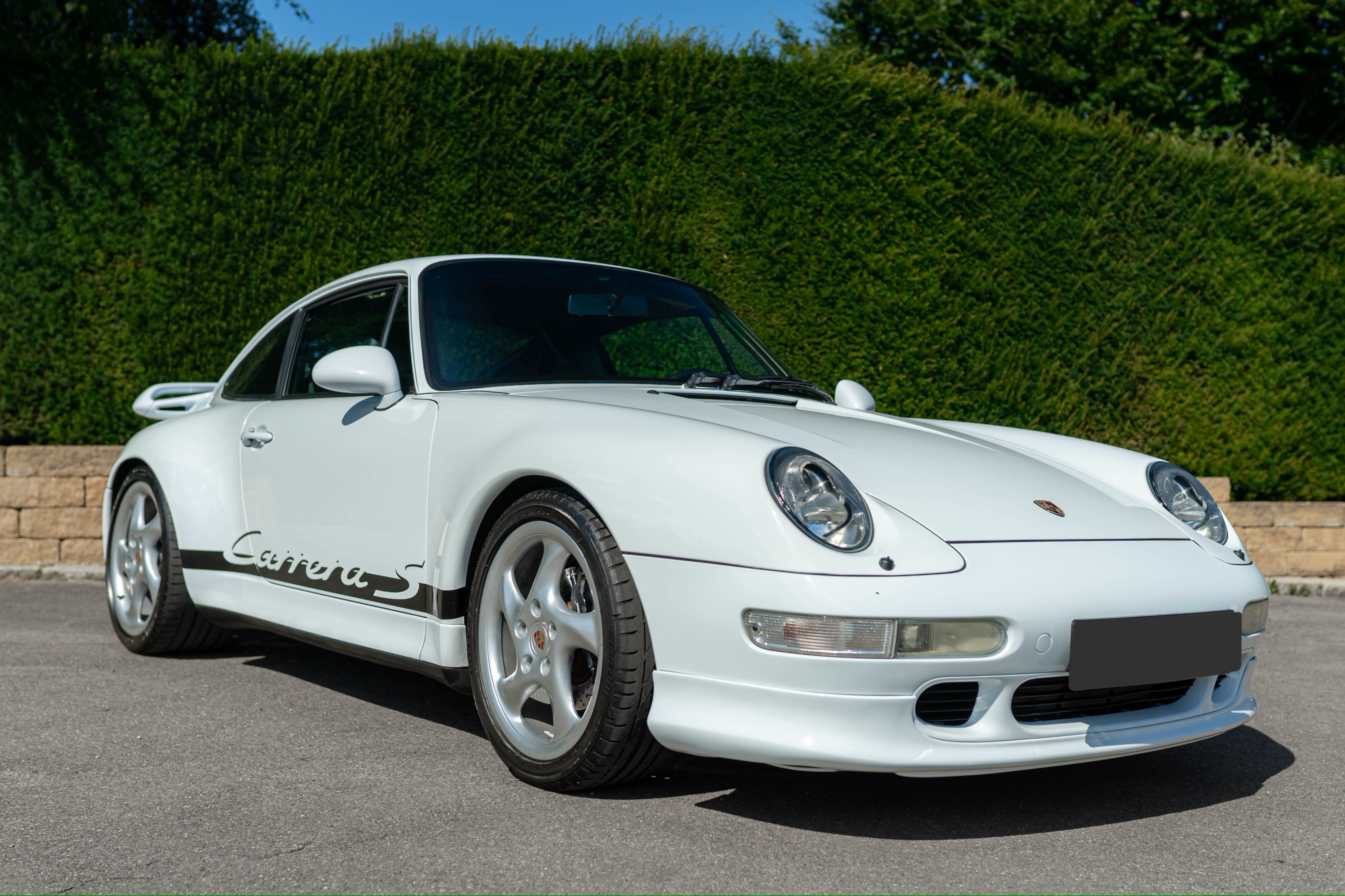 This example is finished in Glacier White with black side stripes and ‘Carrera S’ script, and boasts a black leather-trimmed interior that’s still in excellent condition. It also comes with front and rear aero kit spoilers, and carbon-fibre trim on the dashboard, door panels, gear knob, and handbrake grip, Becker Porsche CR-210 cassette-radio, a CD changer, the premium audio system, air conditioning, automatic speed control, an electric sunroof, electric windows, electrically adjustable front seats, a heated rear windscreen, a cigarette lighter, fog lights, a third high-level brake light, and an on-board trip computer.
