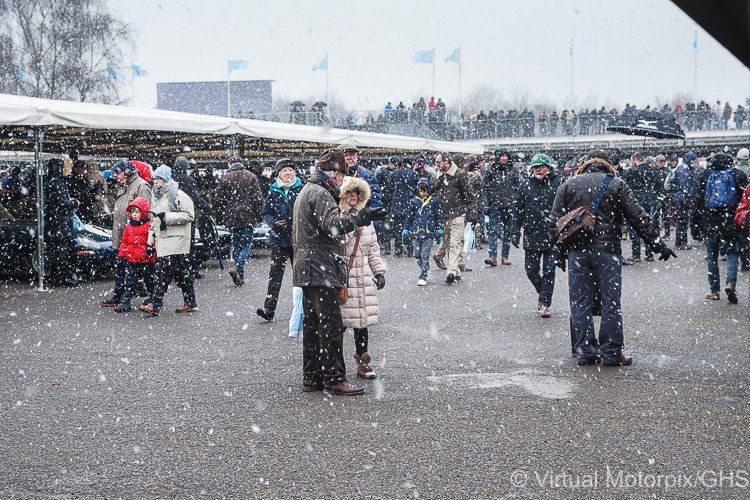 Goodwood 76th Members’ Meeting, 17/18 March 2018: The crowds wrapped up warmly against the biting wind and snow while viewing the race cars in the paddock at Goodwood