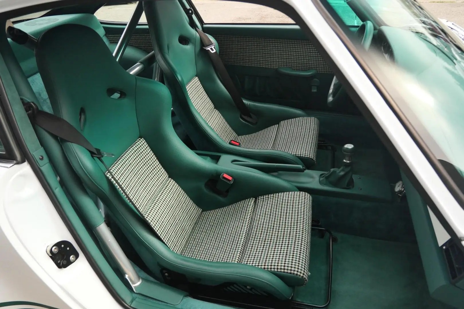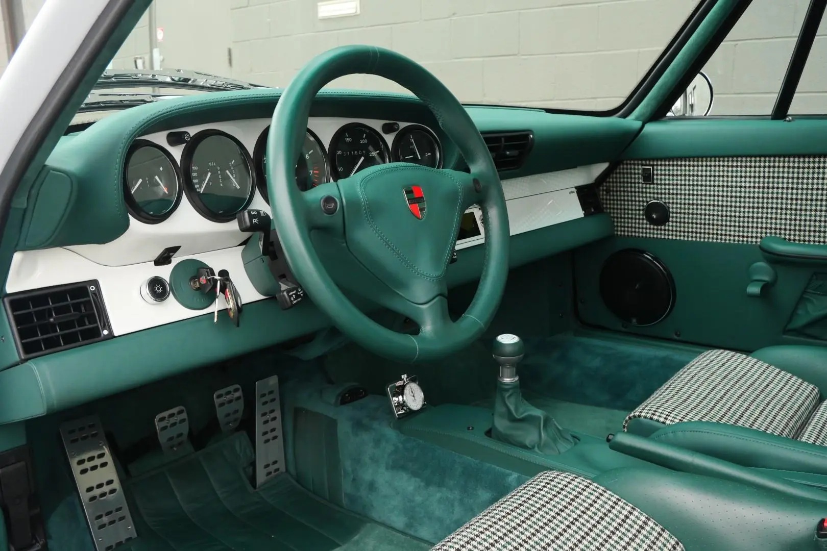 Inside, the cockpit features Recaro Pole Position seats upholstered in Nephrite Green leather with Pepita cloth inserts, complemented by matching door panels, green leather dash pads, and a Porsche Classic infotainment system.