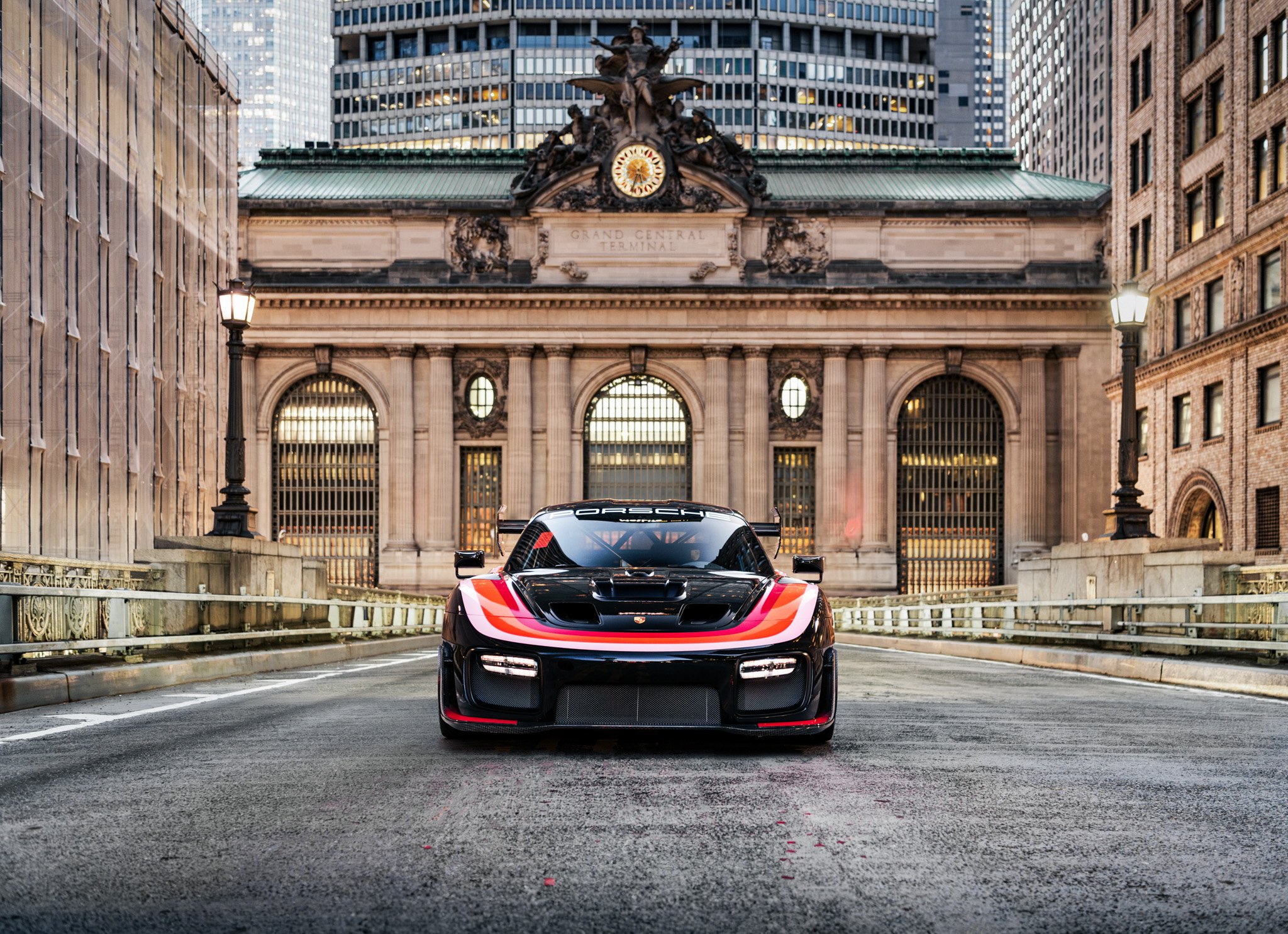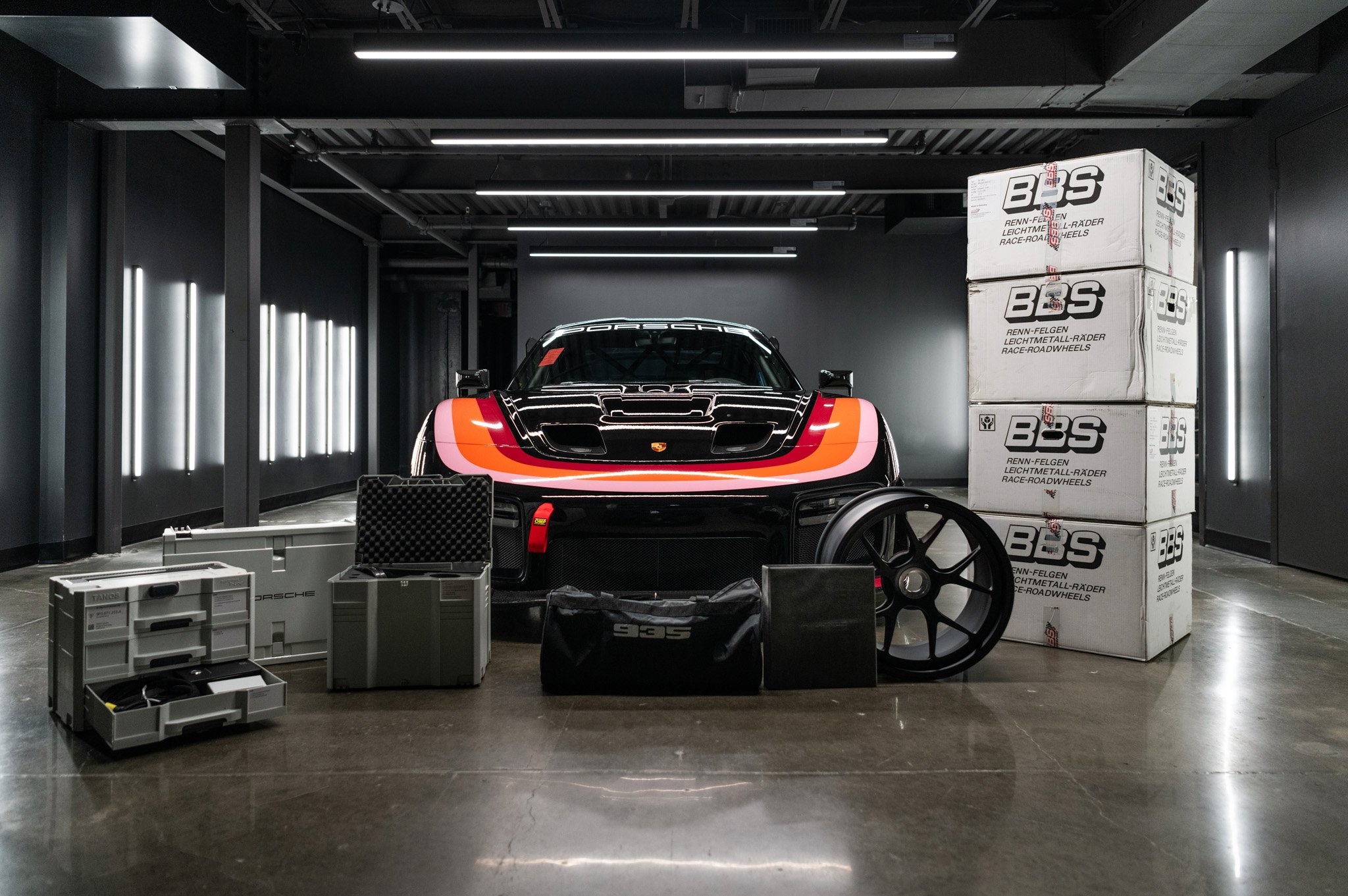 The car featured distinctive wide box flares, a flat-nose front, and an imposing rear diffuser and wing, echoing the legendary “Moby Dick” 935. The show model was finished in Agate Grey with Martini stripes and equipped with center-lock wheels and brake-cooling turbine discs.