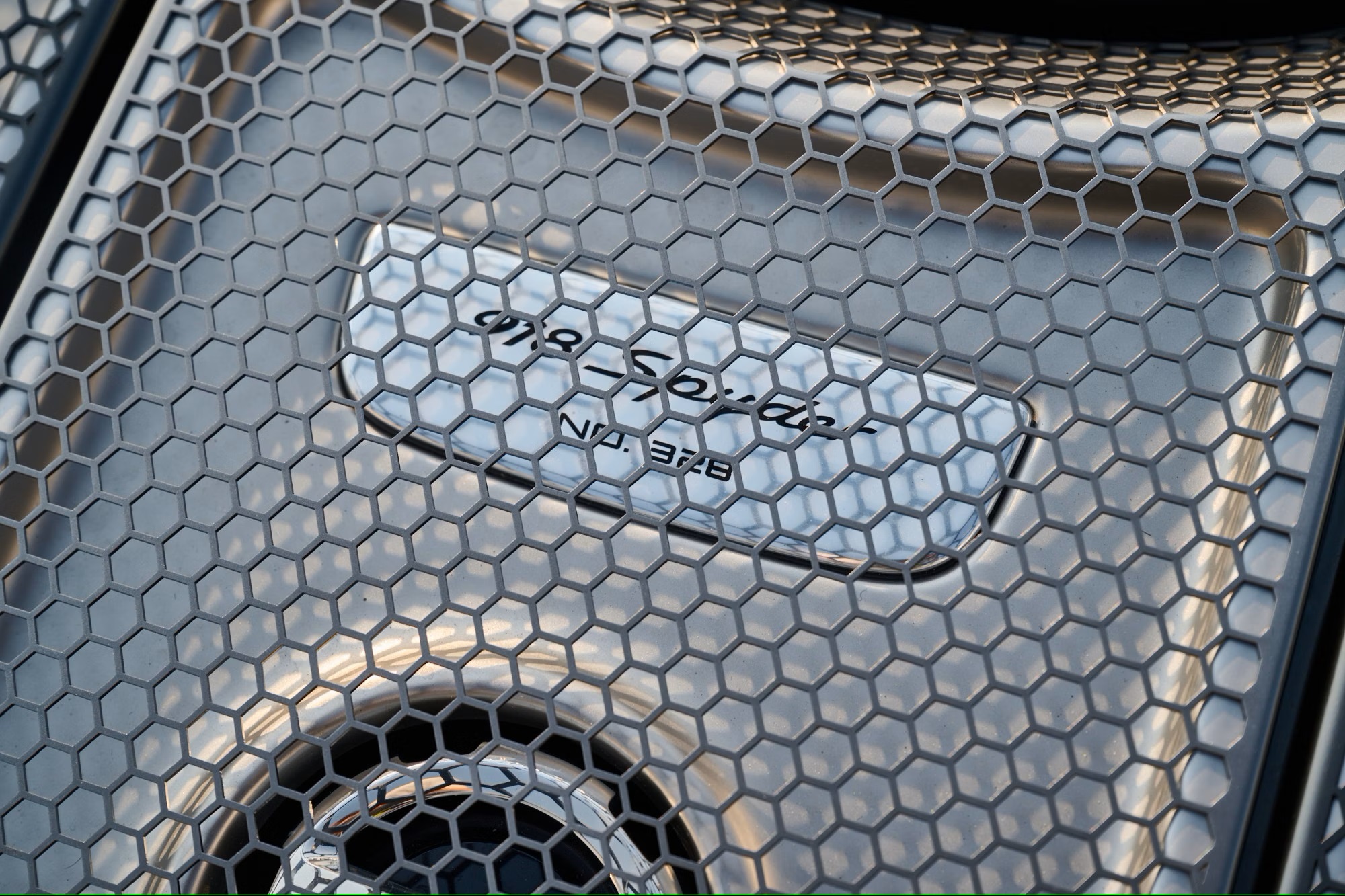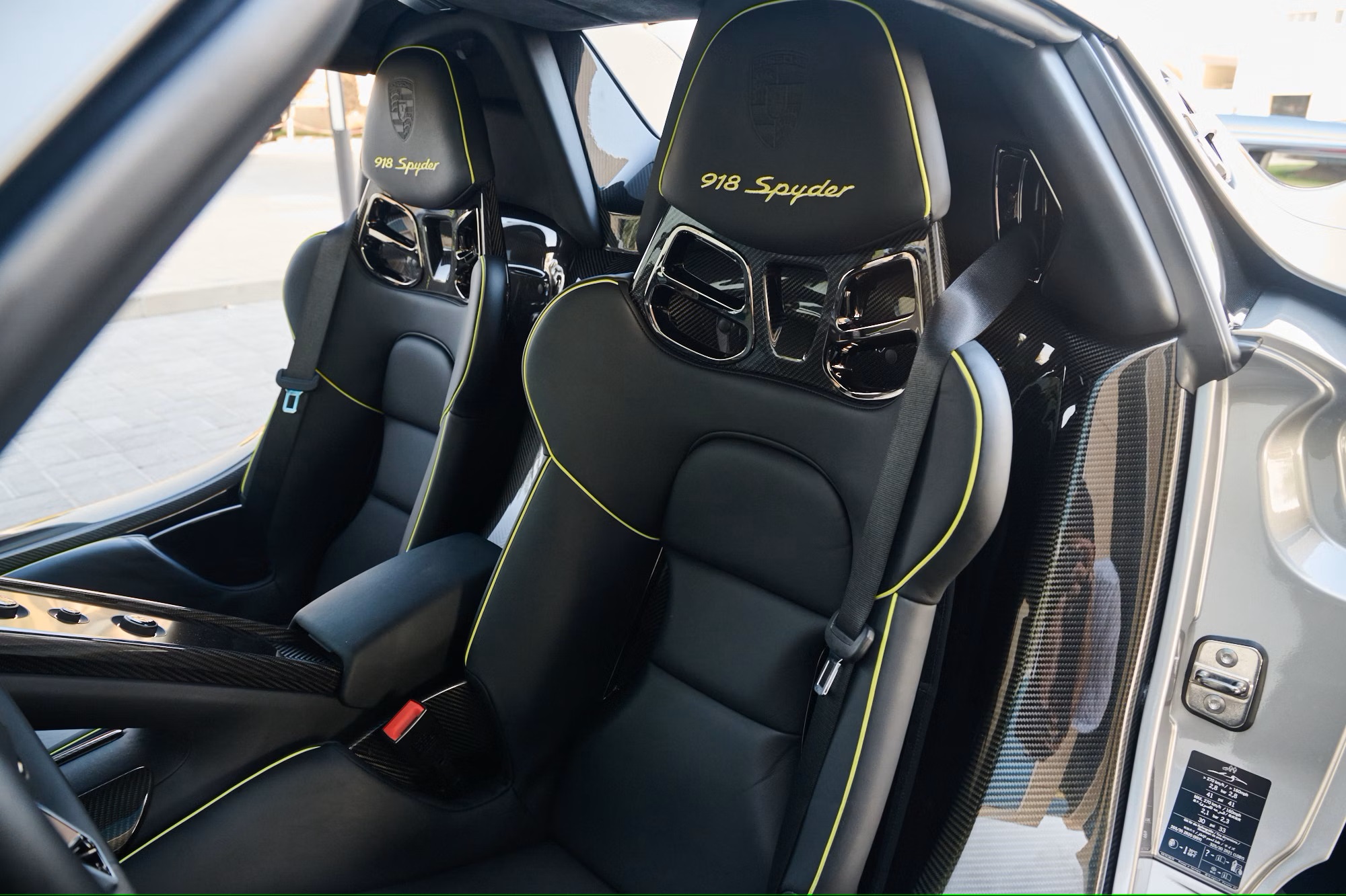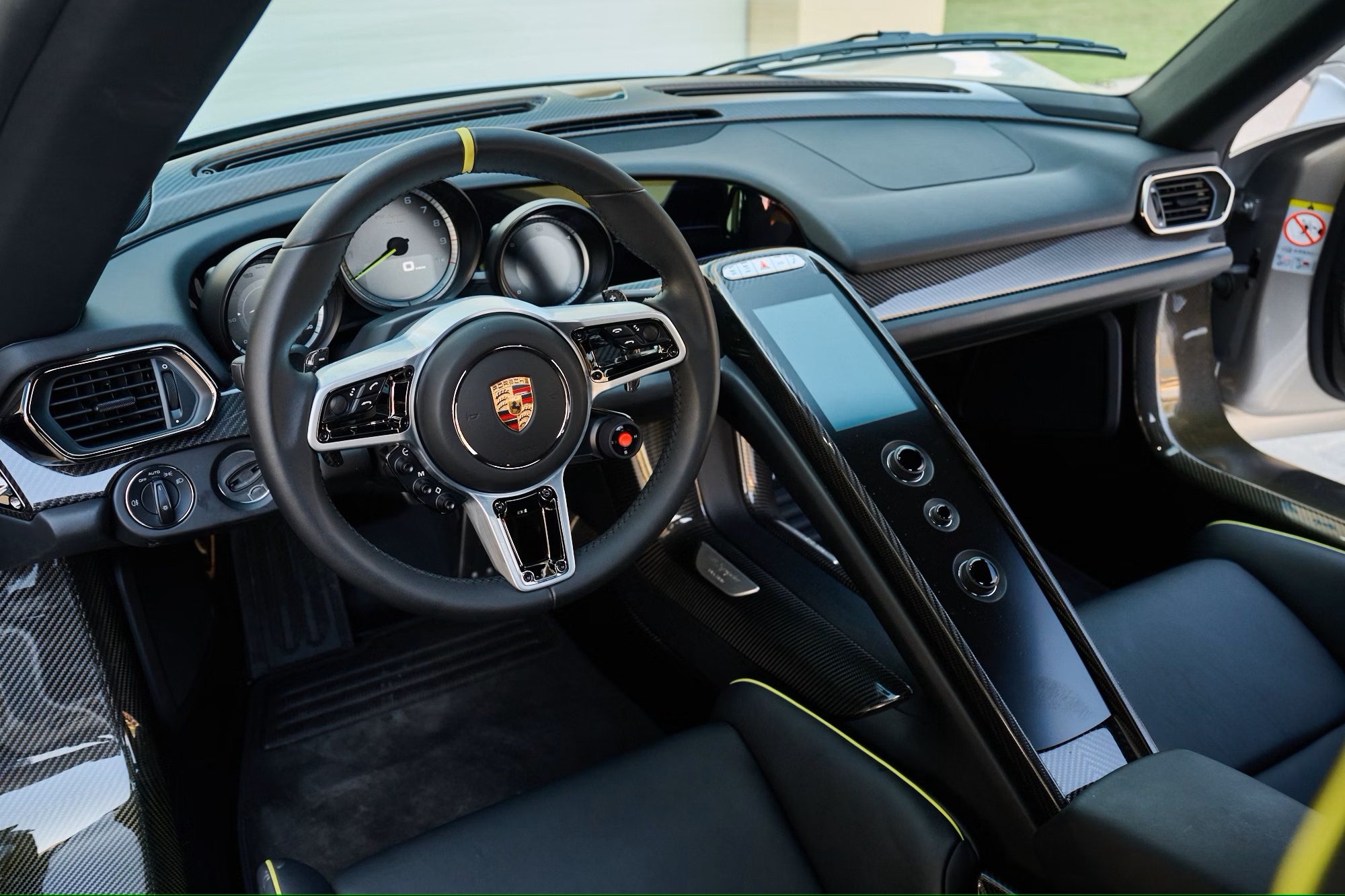 The interior is trimmed in Onyx Black leather with striking Acid Green piping on the seats and door panels, embroidered ‘918 Spyder’ lettering, embossed Porsche crests on the headrests, and accents of brushed aluminum, carbon-fiber, and dark chrome.