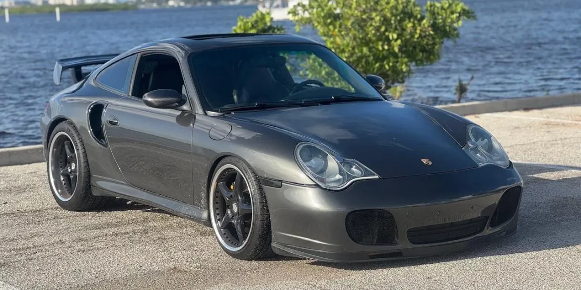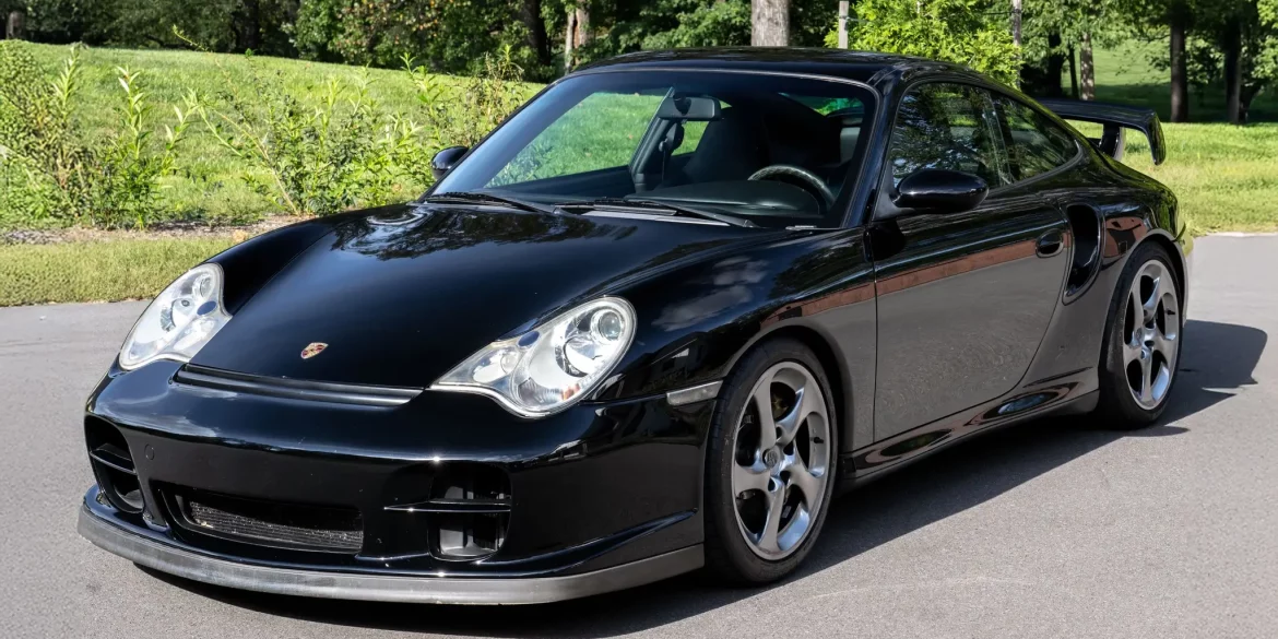 This 2003 Porsche 911 Turbo coupe is powered by a twin-turbocharged 3.6L flat-six that has been modified with Turbosmart IWG75 wastegate actuators, Agency Power intercoolers, and Markski engine management, while a rear-wheel-drive conversion has been carried out. The rebuilt six-speed manual transaxle has a Sachs Performance Stage 2.5 clutch kit...